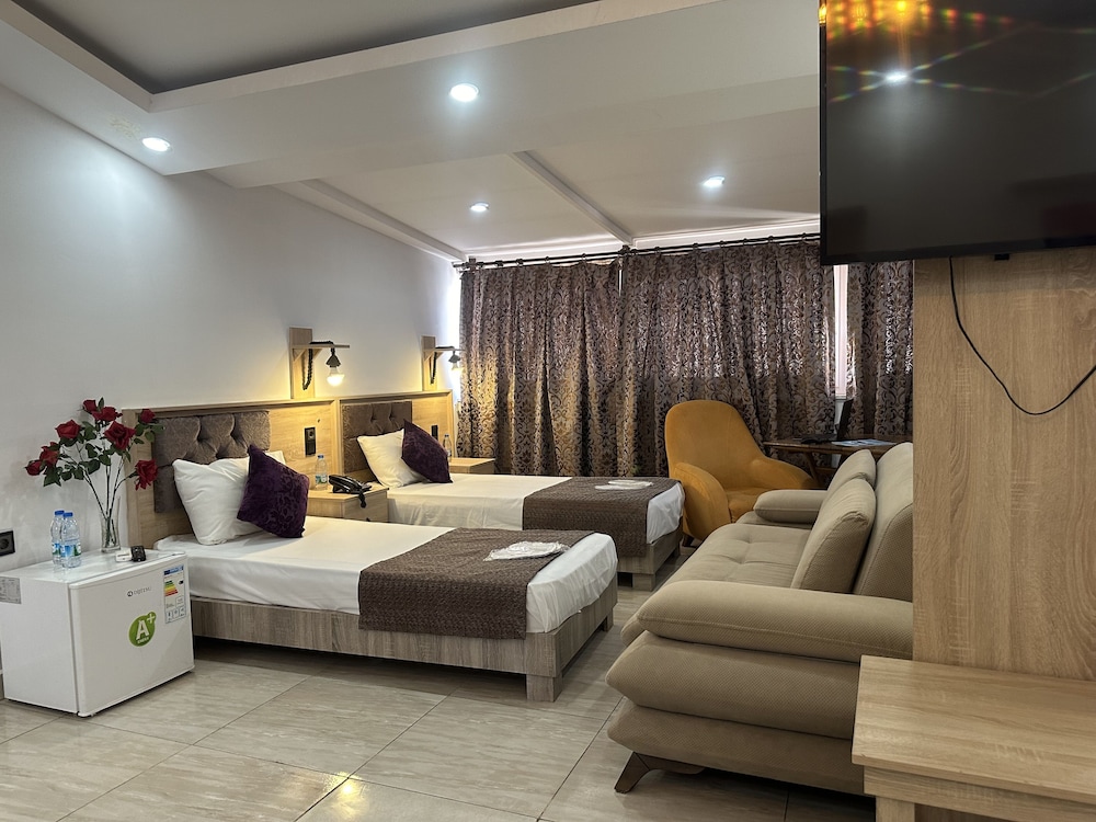 Öncelikle çalışanların tavırları hoş değildi. Otel isletiyorsaniz her odaya giris karti sayili veremem demek dogru degil 45 yasinda 2 kisi her saniye dakika yan yana gezmek zorunda degiliz. Ayrica oda icerisi resmen insaat santiyesinden farksiz her yerde tadilat tamirat izleri hos gorunmuyordu. Uyumak icin tercih eden kişilere tavsiyem buzdolabinin asiri ses yapmasindan sorun yasayabilirsiniz. Asansor bozuk tamam anladim ama merdivenden cikarken depo gibi merdiven boslugu tıkış tıkış goruntu gene hos degil. Ayri yatak istememize ragmen hotels te yazmama ragmen bizde boyle diyim bir cift kisilik yatak ve bir cocuk yatagi gibi kotu bir yatak 2 kisi icin ideal degil. Umarim dikkate alinir fiyata ve konuma aldanip rezil olmayin tercih edecek arkadaslar