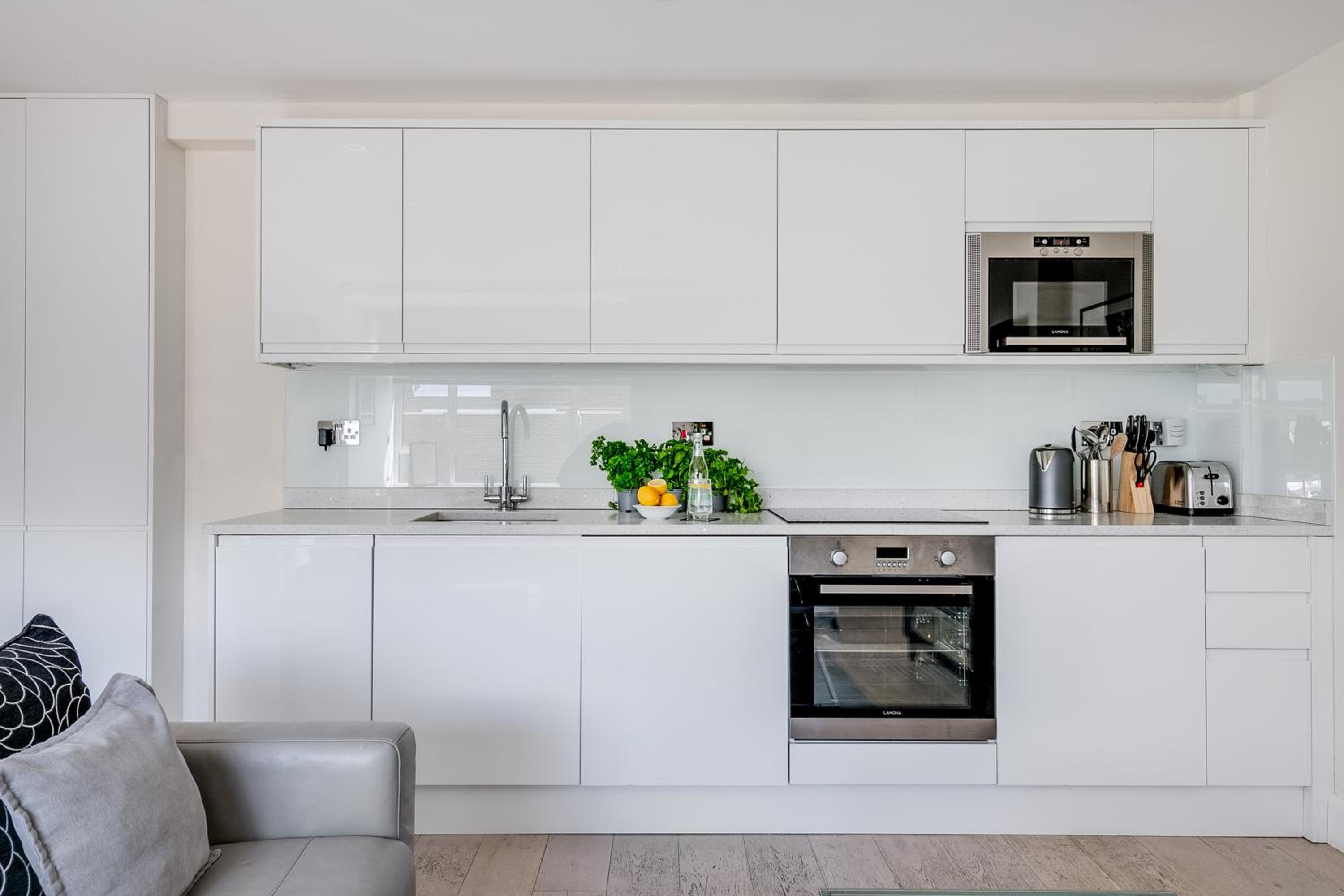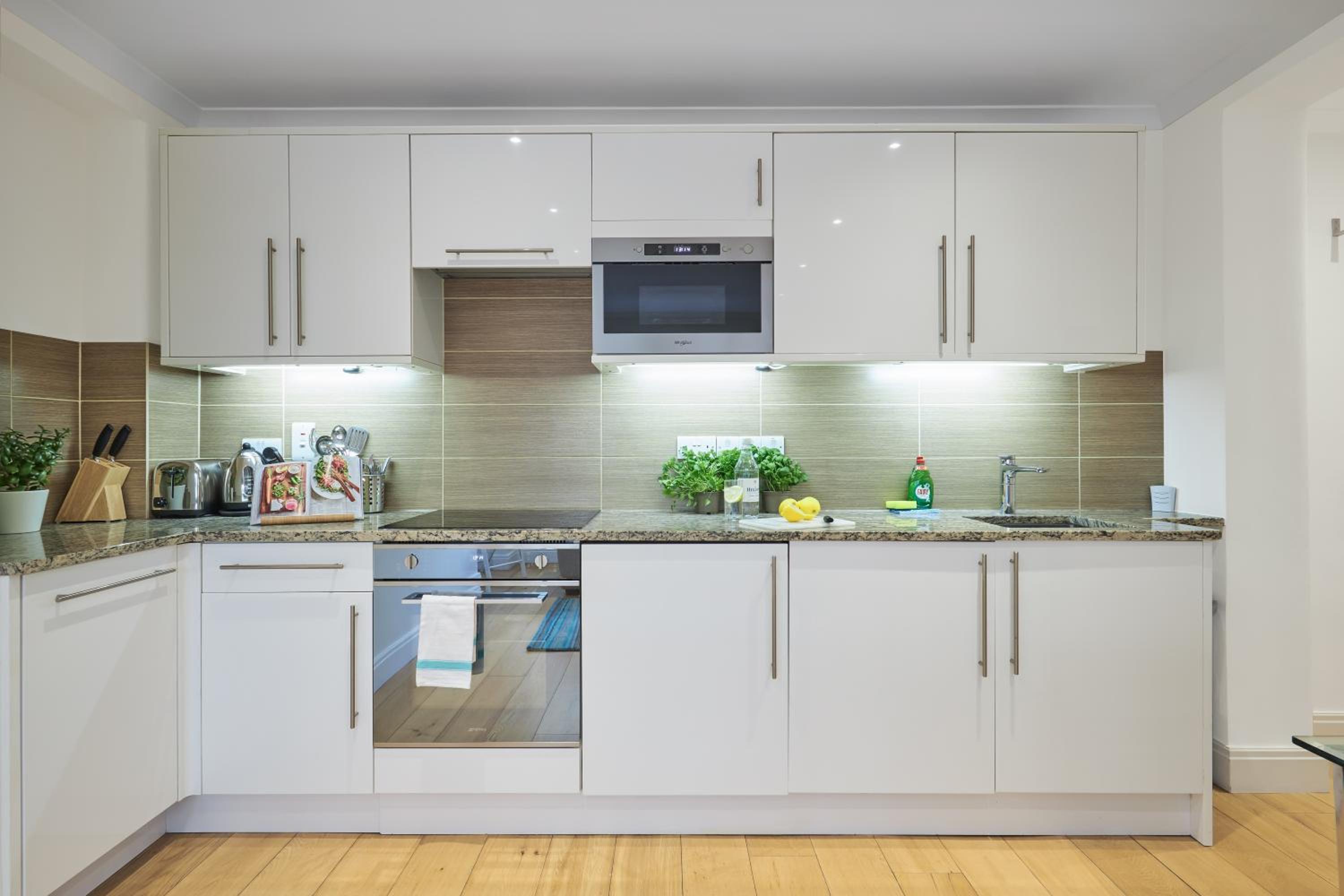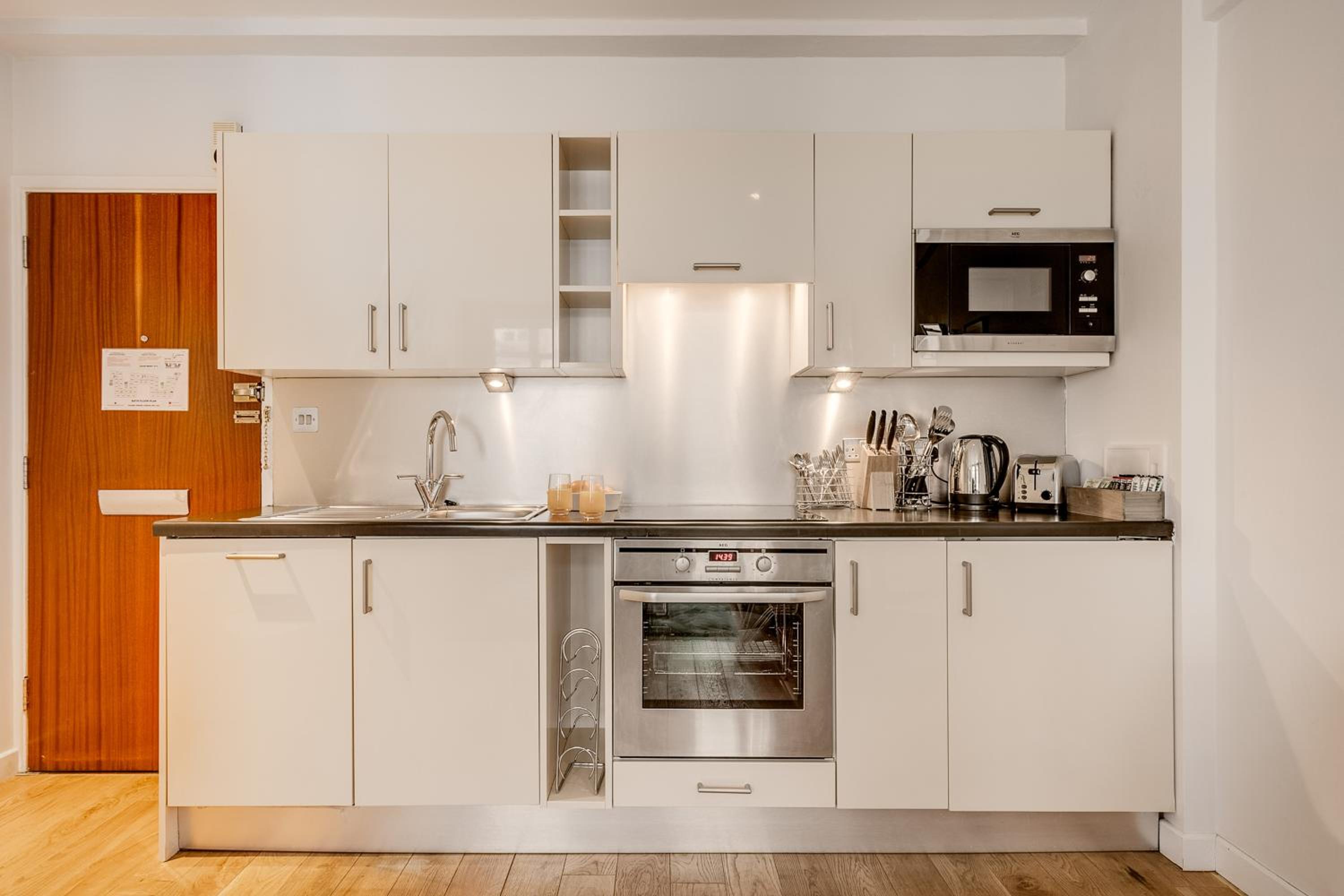 No oven in kitchen as stayed over a week. Otherwise no issues. Bed comfortable, nice towels, good weekly cleaning service.