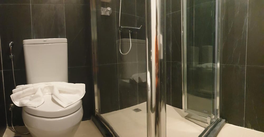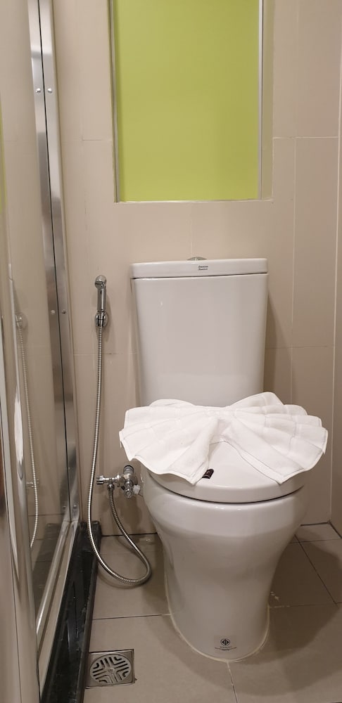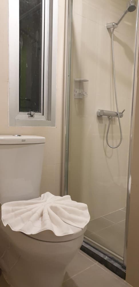The bathroom was clean and the shower has a full door so no splashing water everywhere, but you only get bath towels, no hand/face towels. Call me fancy but I like to have a separate rag for my face. A single shampoo/shower gel bottle was in the shower. The showerhead needed a good scrubbing and descaling.