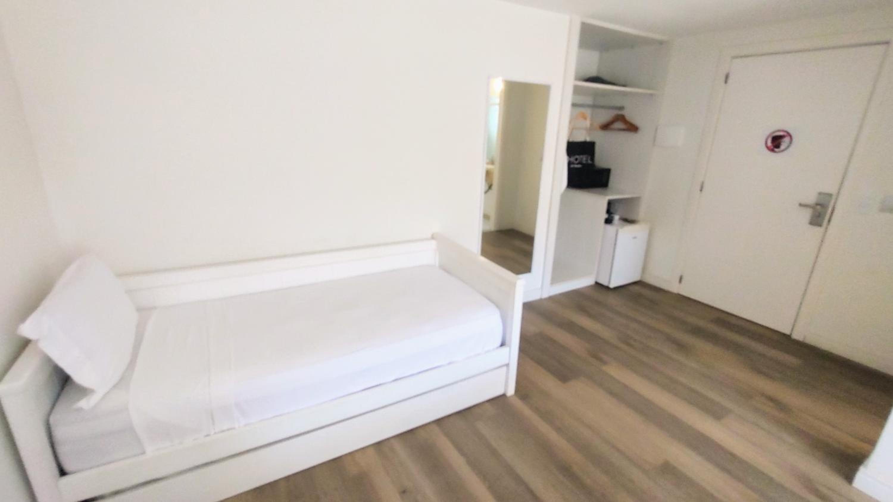 Quarto, cama rebaixada, diferente da cama disponível na reserva.