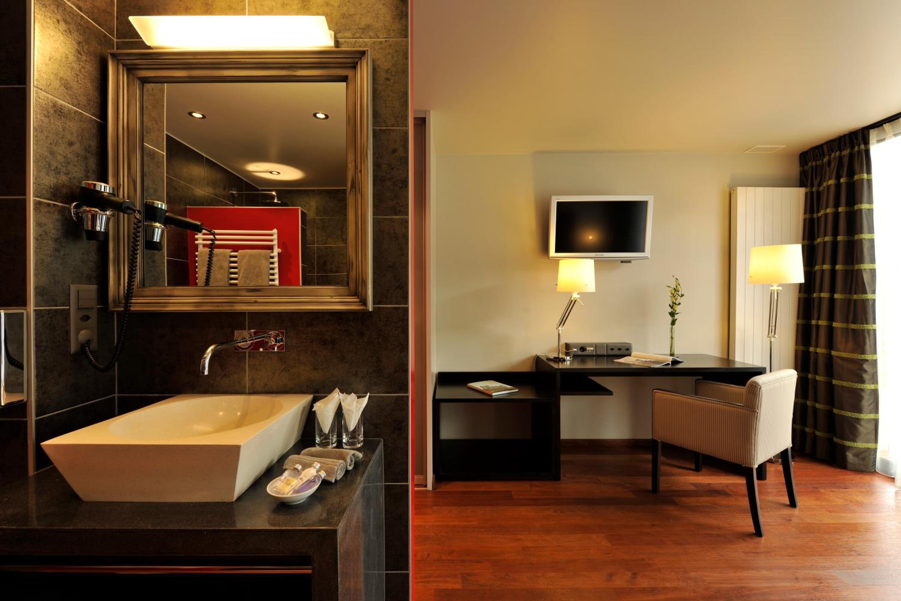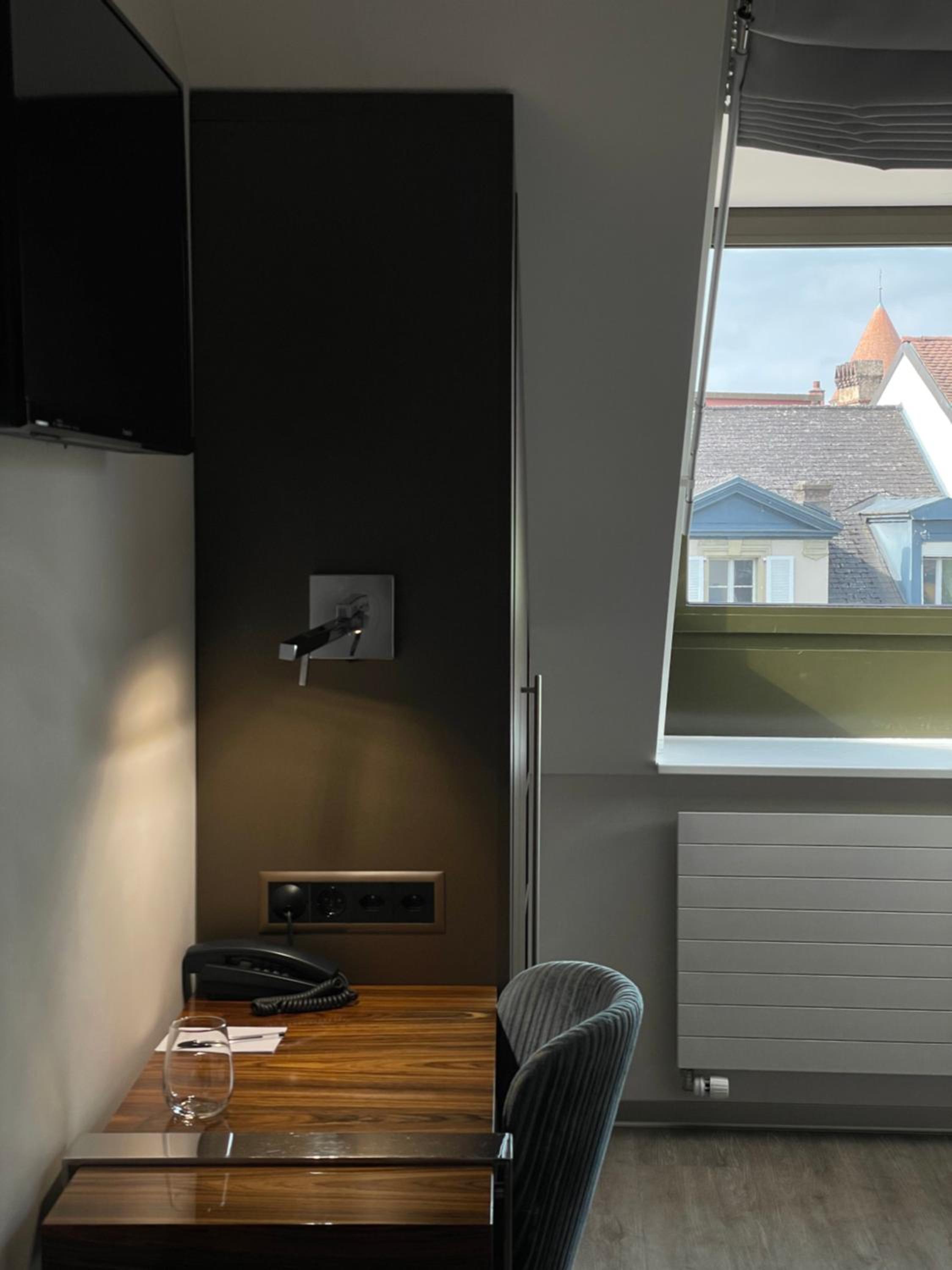The renovated rooms, refurbished in 2014 and 2015, provide a cozy retreat with views of the city or the private courtyard. Each room is equipped with wooden floors, a flat-screen cable TV, and a well-appointed bathroom.