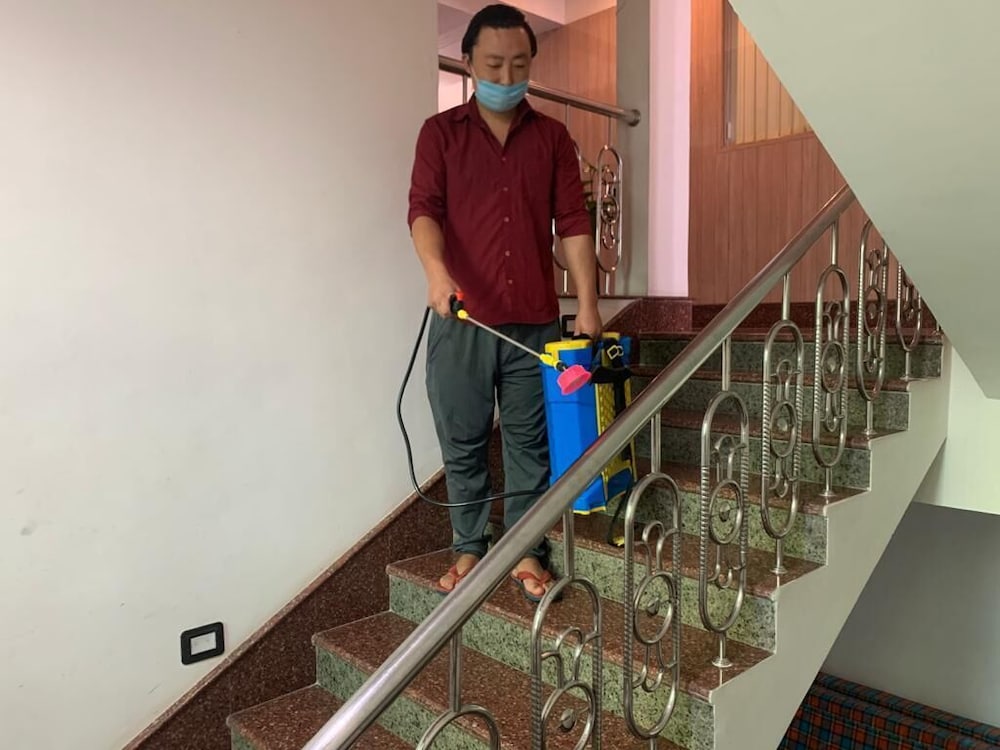 Commonly-touched surfaces are cleaned with disinfectant
