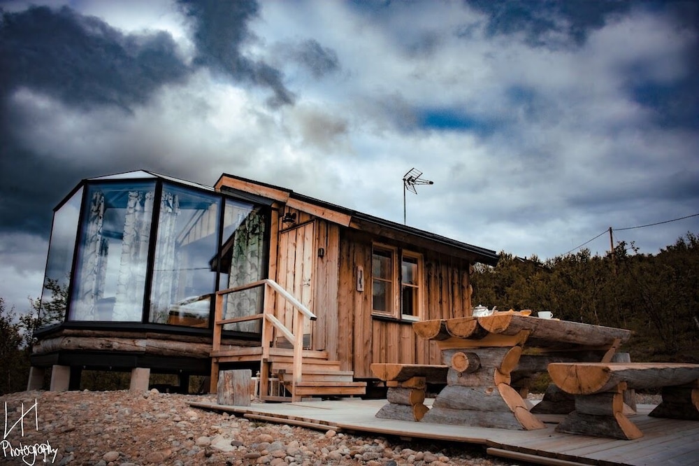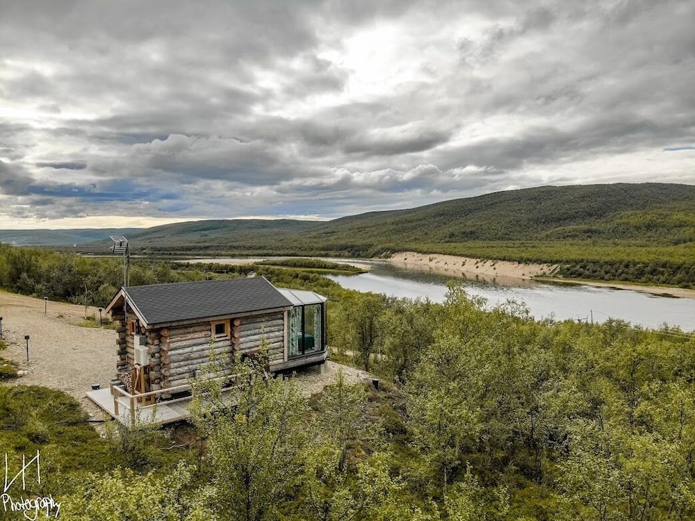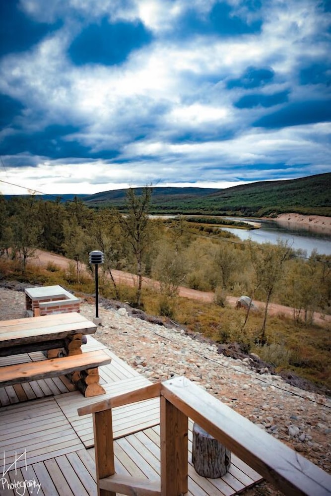 Utsjoki takapihalla, hienot näkymät. Hyvä sauna, erinomaiset pizzat.