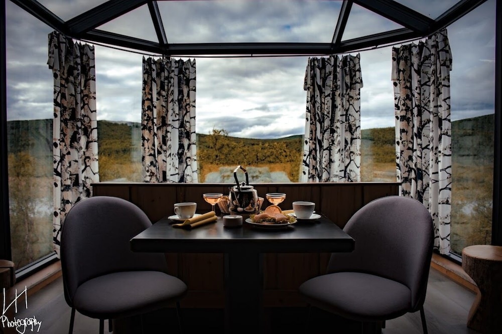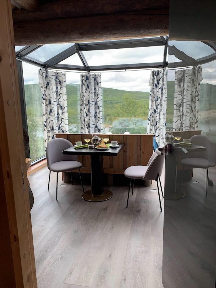 Maisemat avautuvat heti huoneen ikkunasta. Ravintola pöydistä näkymä Utsjoelle. Ystävällinen palvelu.
