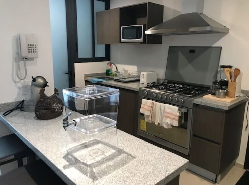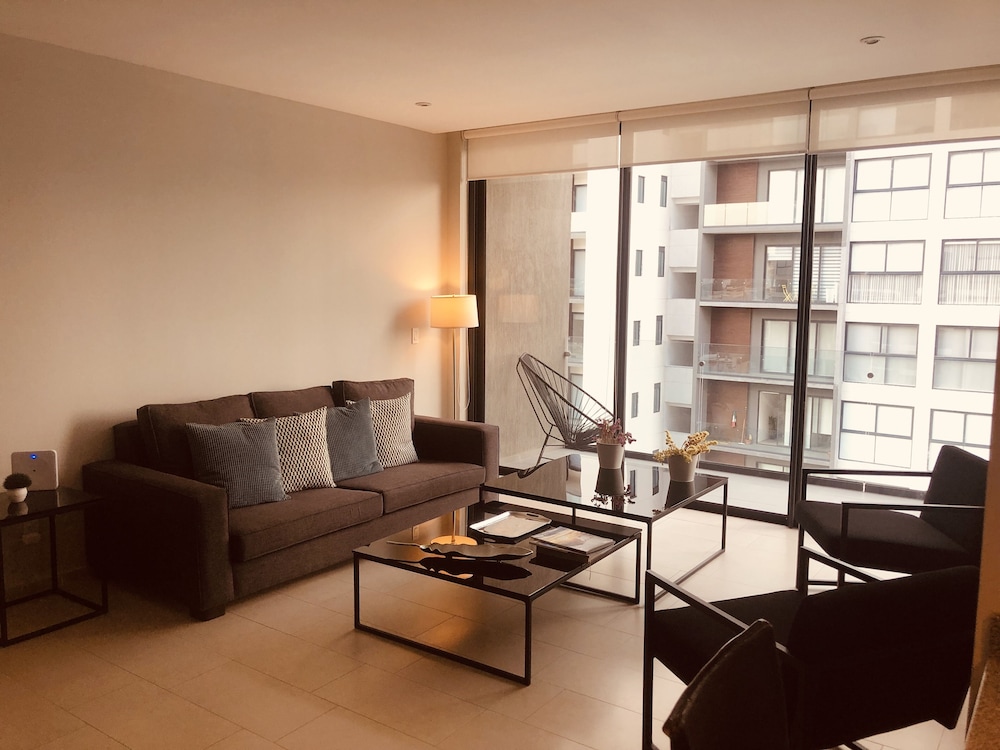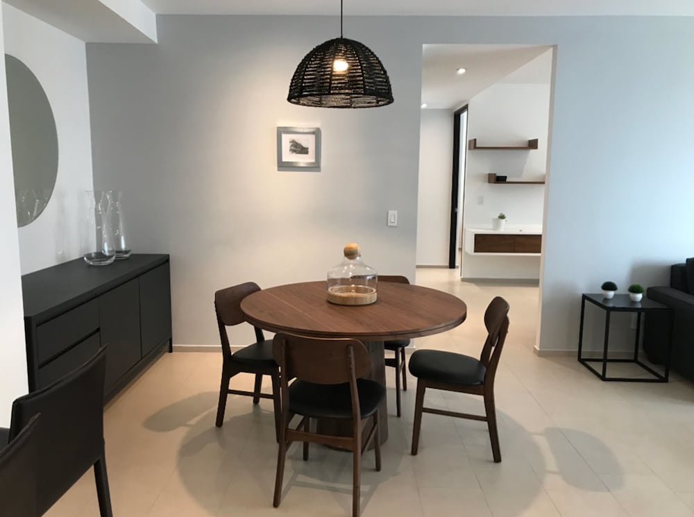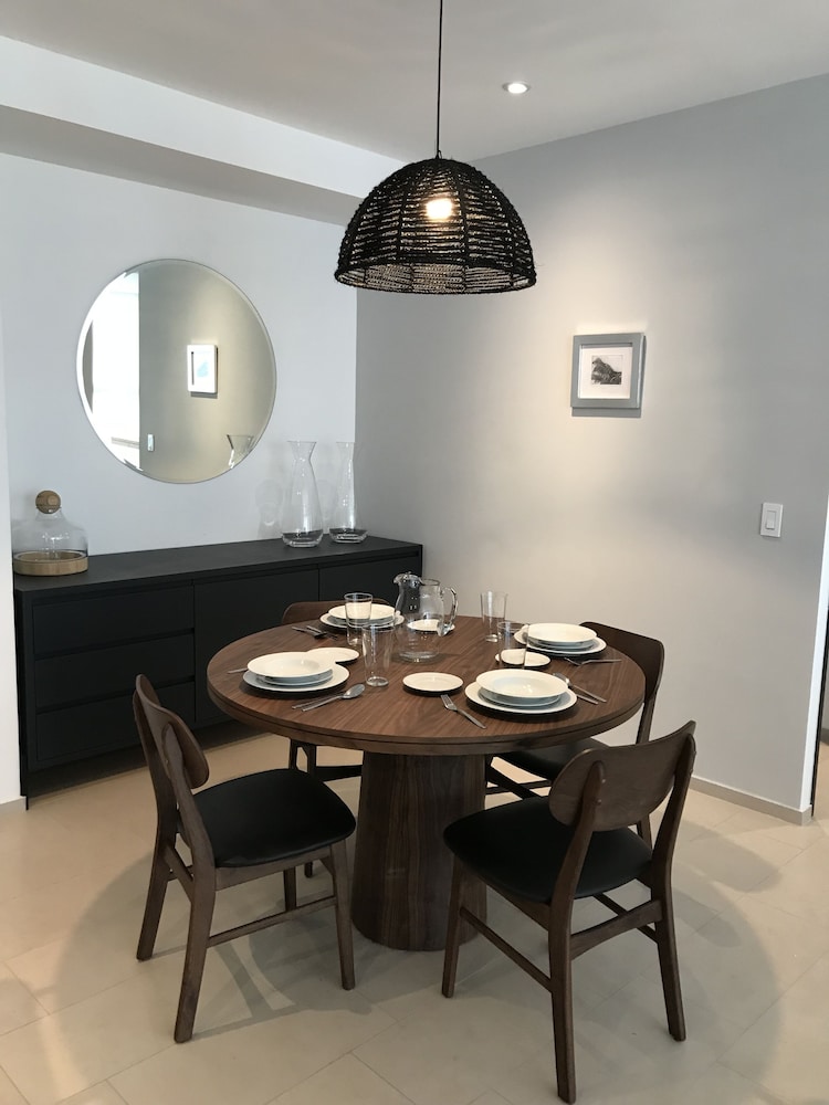 Es un departamento increible, igual que en las fotos. Cuenta con mobiliario y decoración con mucho estilo, y ademas cómodo y funcional. Ideal para viajes de negocio que quieran salirse de un horel o suite y vivir tu viaje como en casa. Areas verdes, alberca, muy seguro, caminando al centro comercial que tiene una oferta variada de tiendas y restaurantes. Los Hosts super atentos. Se llevan un 10!