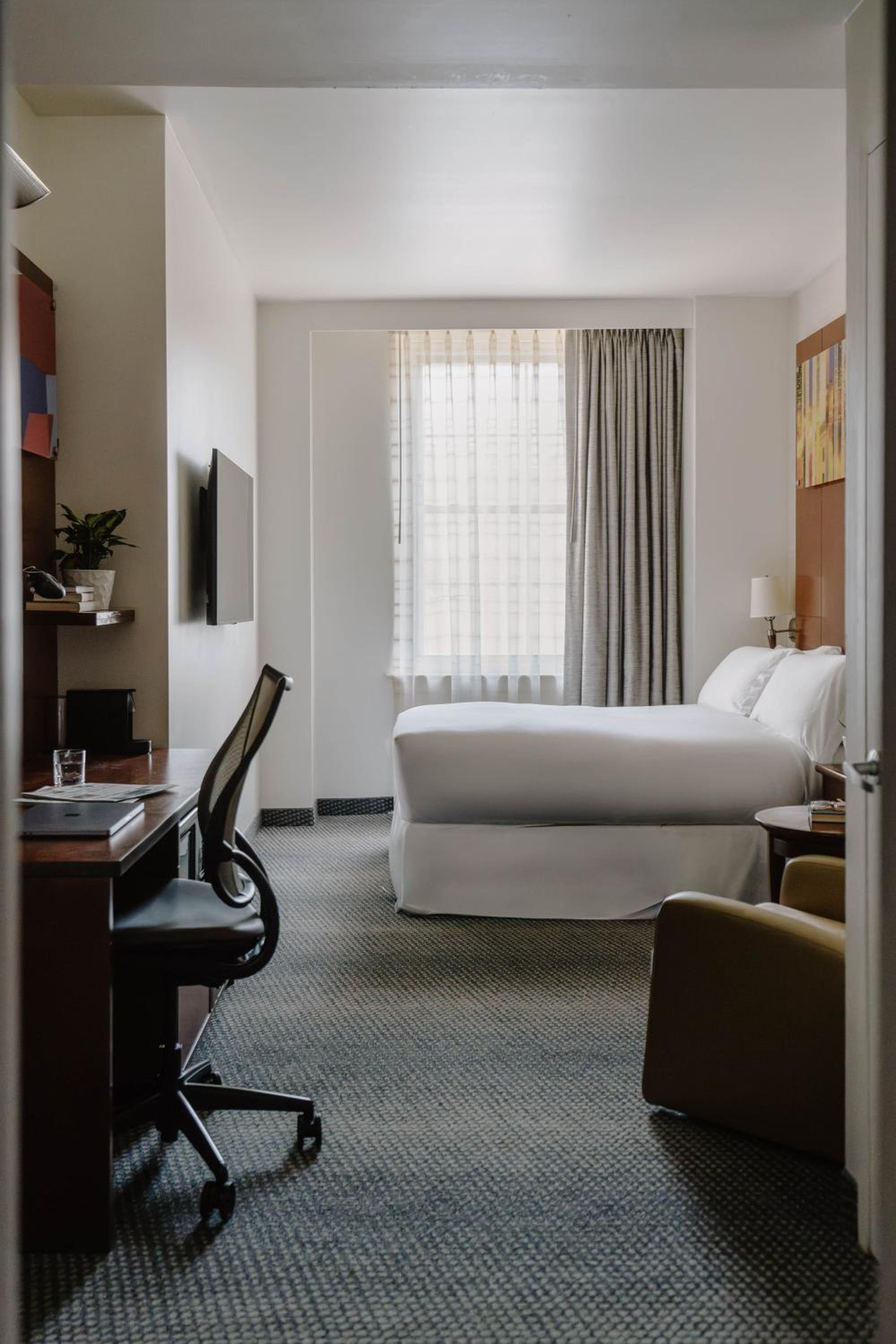 Club Quarters in Philadelphia offers stylish guest rooms featuring modern amenities like flat-screen TVs, iPod docking stations, and ergonomic work desks. The large windows provide natural light, creating a bright and inviting atmosphere for guests.