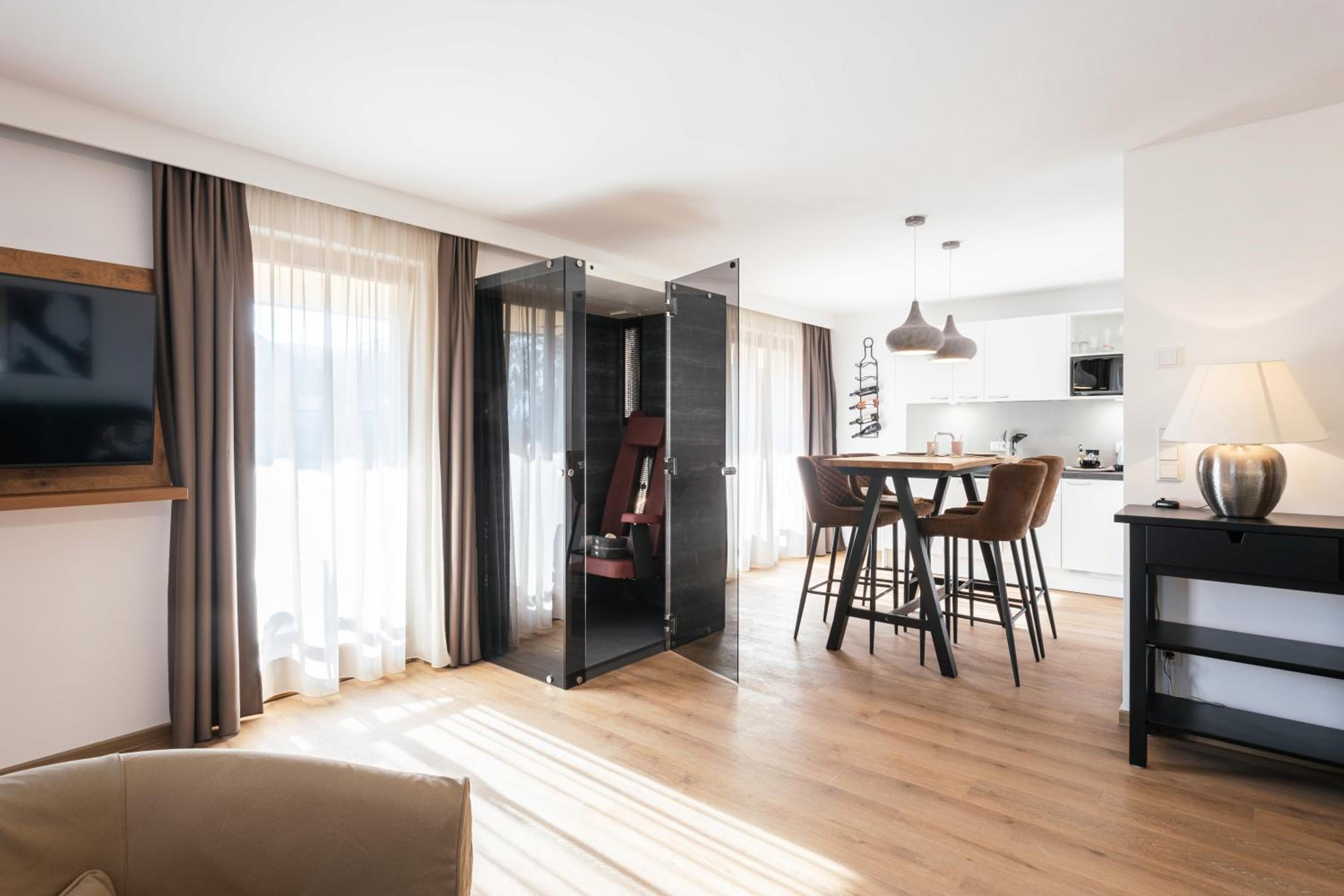 Super schöne, moderne Appartements in top Lage zum Wandern und erholen. Die Dampfsauna und Infrarotsauna auf dem zimmer war top nach einem langen Wandertag. Der bus hält direkt vor der Tür. 10 min zum nächsten Supermarkt und total ruhig. Kuschelig warm trotz -10 grad durch Fußbodenheizung. Die Gastgeber sind total nett und hilfsbereit in jeder Lage. Küche ist top ausgestattet zum selber kochen und das Frühstück einzigartig. Das Frühstück nimmt man in seinem Appartement ein es steht zu der Uhrzeit parat wenn man es möchte, also keine Buffet schlacht wie in anderen Hotels.