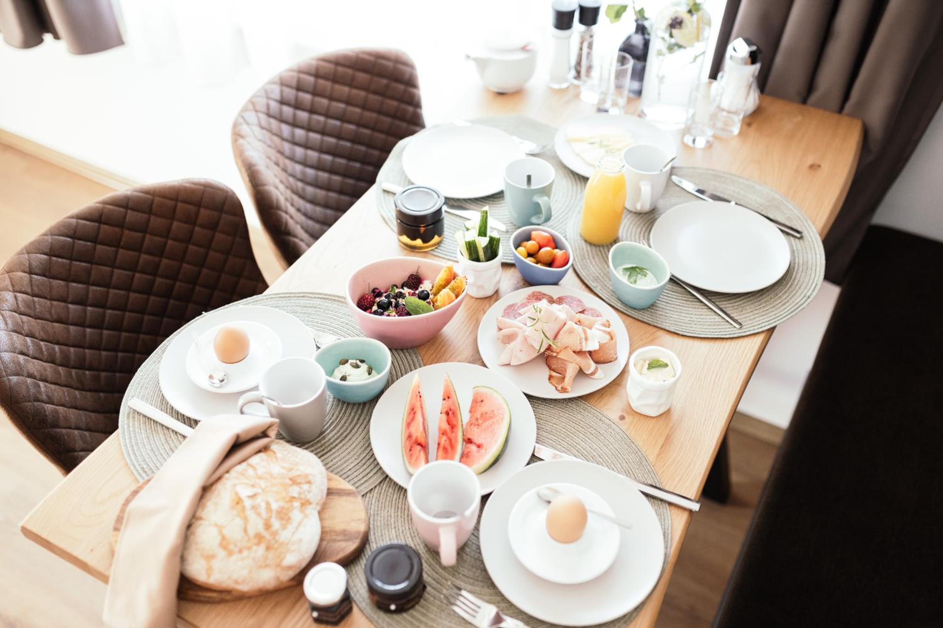 Das "gekühlte Frühstück in der Box" ist gewöhnungsbedürftig. Weil das Ei selbst gekocht bzw. zubereitet werden muss; die Menge und Zurodnung des Gebäcks (Brot) recht übersichtlich, zwei Kaisersemmeln waren immer dabei; auf unseren Wunsch möglichst kuhmilchfrei frühstücken zu können wurde reagiert. Ein Frühstücksbüfett ist jedoch immer die bessere Lösung, denn dann kann ich das aussuchen, was mir schmeckt und worauf ich an dem Morgen Lust und Bock habe. Ein "Themen-Frühstücksprogramm" (Italienisches Frühstück, Sekt-Frühstück, Almfrühstück etc.) welches angeboten wird, ist bestimmt vordergründig eine interessante Lösung für den Unternehmer/Gastronomen - aber trifft eben nicht immer den Geschmack des Einzelnen. Ich werde solche Angebote zukünftig meiden und den menschlichen Kontakt beim Gastgeber und einem angegliederten und aktiven Restaurant bevorzugen. Last but not least muss dann auch noch die Küchenzeile von dem Gast "vorgereinigt" werden, weil es ansonsten € 70,00 extra hagelt, d.h. sauber abwischen, Geschirr einräumen und Müll runtertragen ;-)) und wenn man nicht pünktlich raus ist, dann hat man keinen Zugang mehr zum Appartement, weil der Zugangscode gesperrt wird......