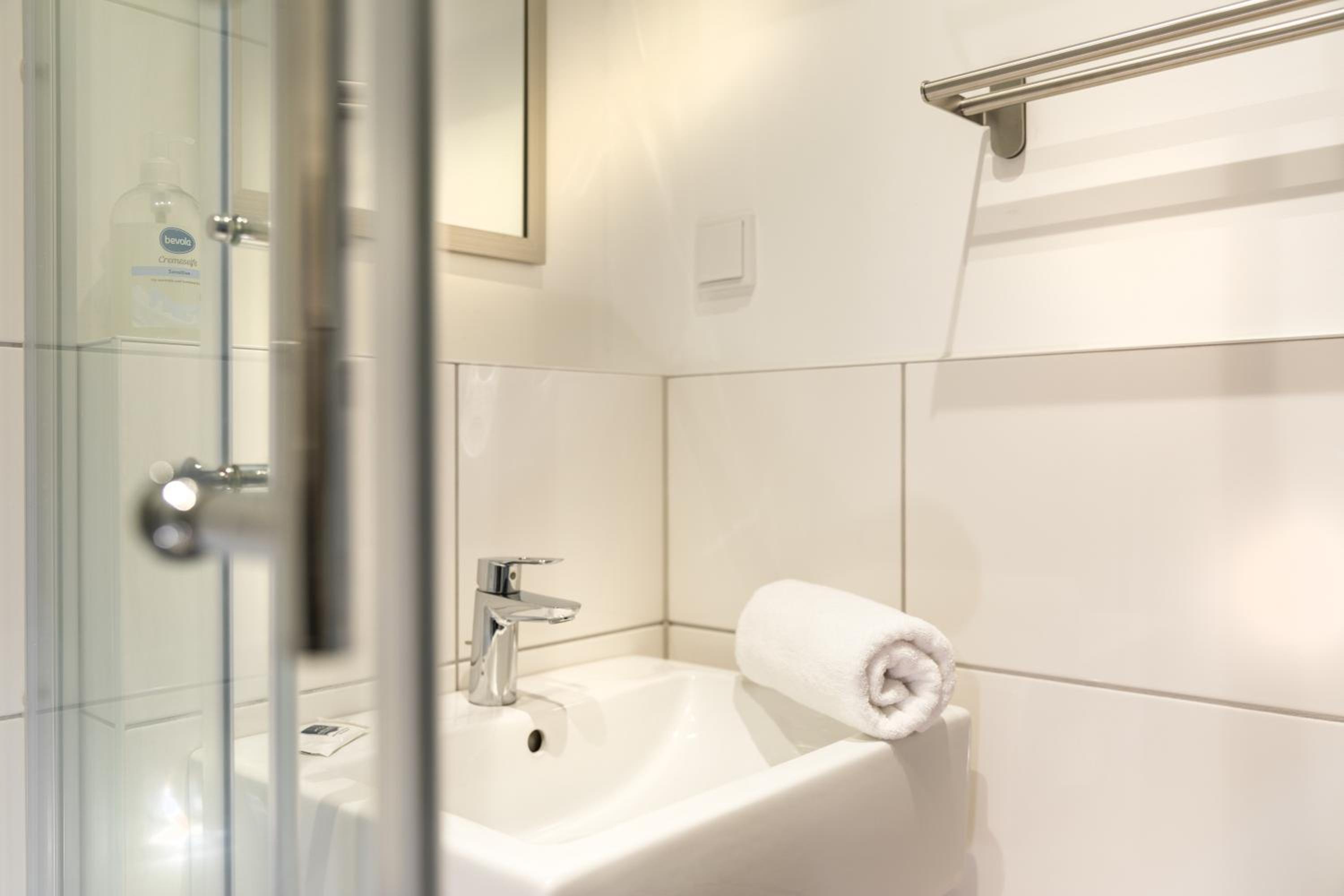 Das Bad hat den Charm einer Baustellentoilette (alles aus Kunststoff, kein Platz, keine Ablagemöglichkeit, kleiner Hagen für Handtücher über offener Toilette)! Das Waschbecken befindet sich im Zimmer und nicht im Bad. Ein Bild ist zwar in der Bildergalerie vorhanden. Dieses geht aber zwischen den anderen Fotos unter. Für den gleichen Preis bekommt man bereits bessere Zimmer in anderen Hotels.