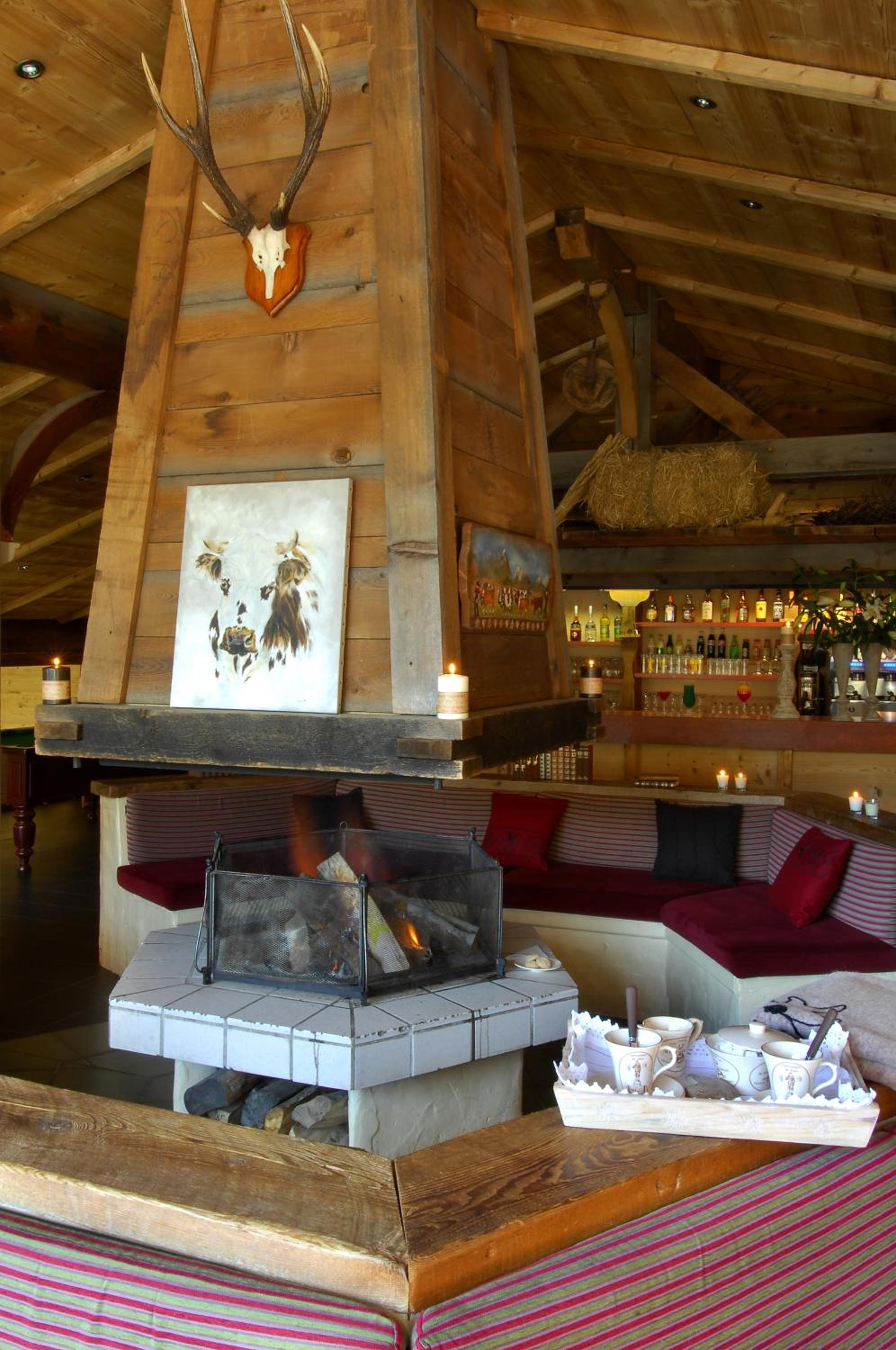 Unwind in the hotel's charming bar, highlighted by a central fireplace and rustic exposed beams. For entertainment, enjoy a game of pool or simply bask in the cozy ambiance.