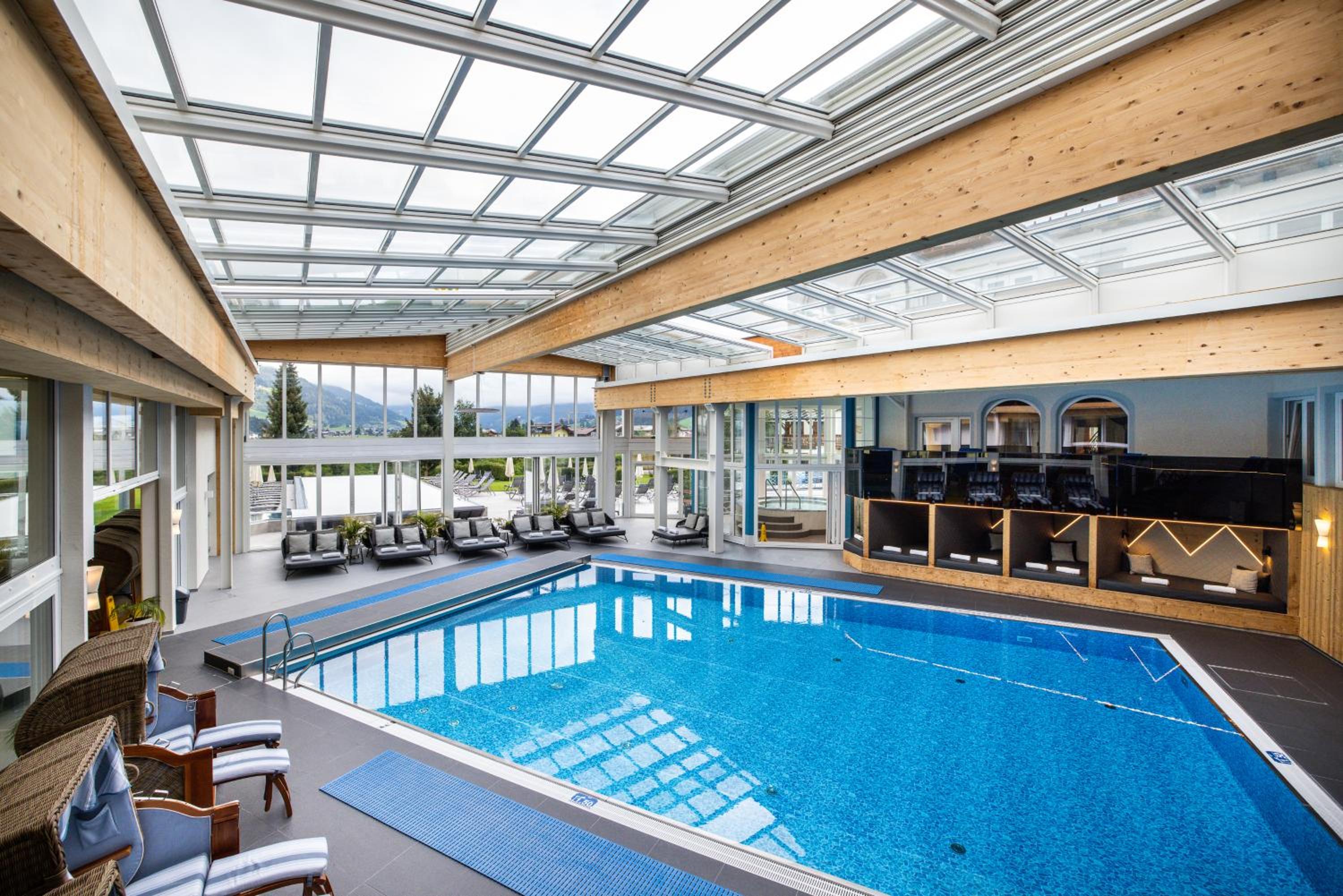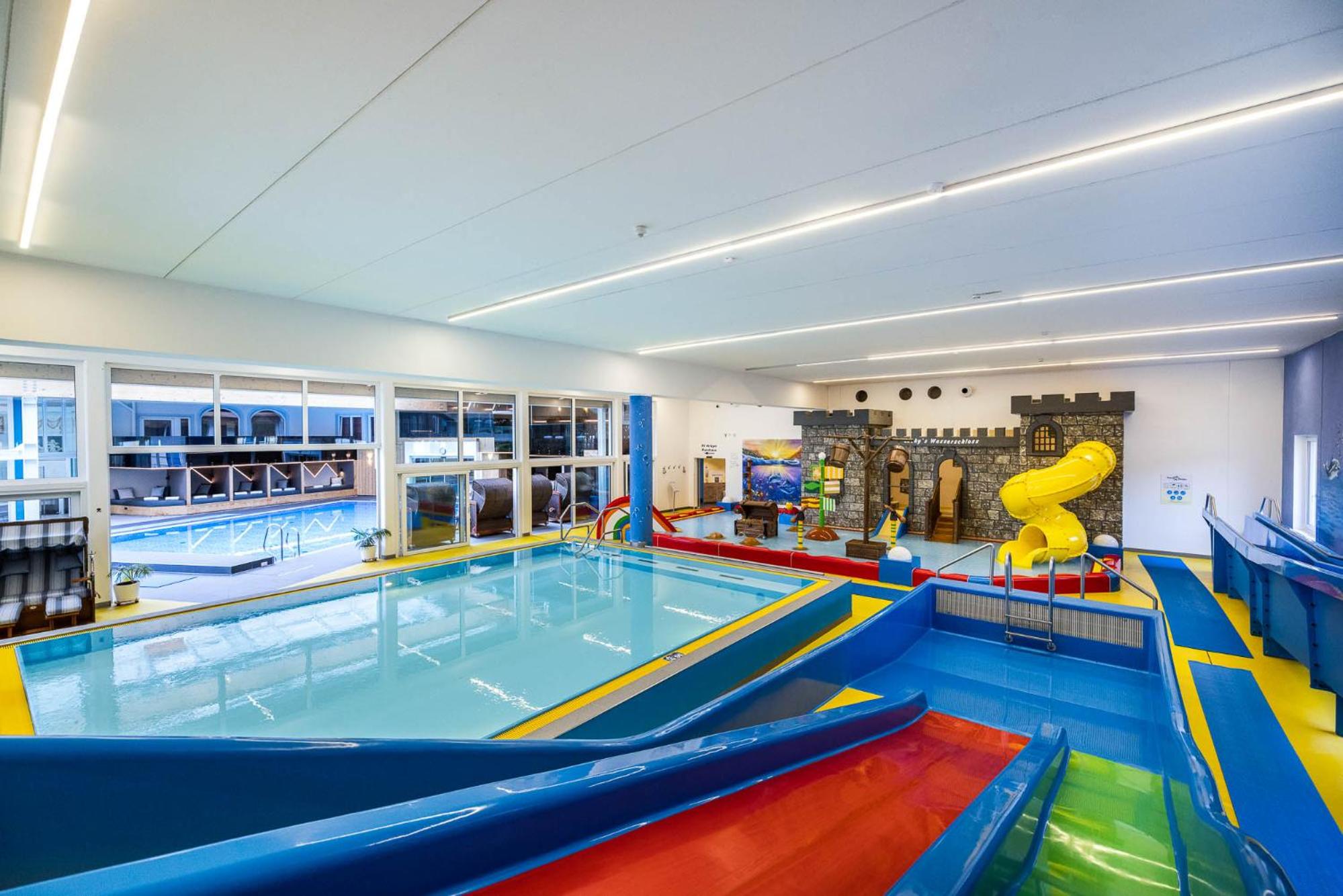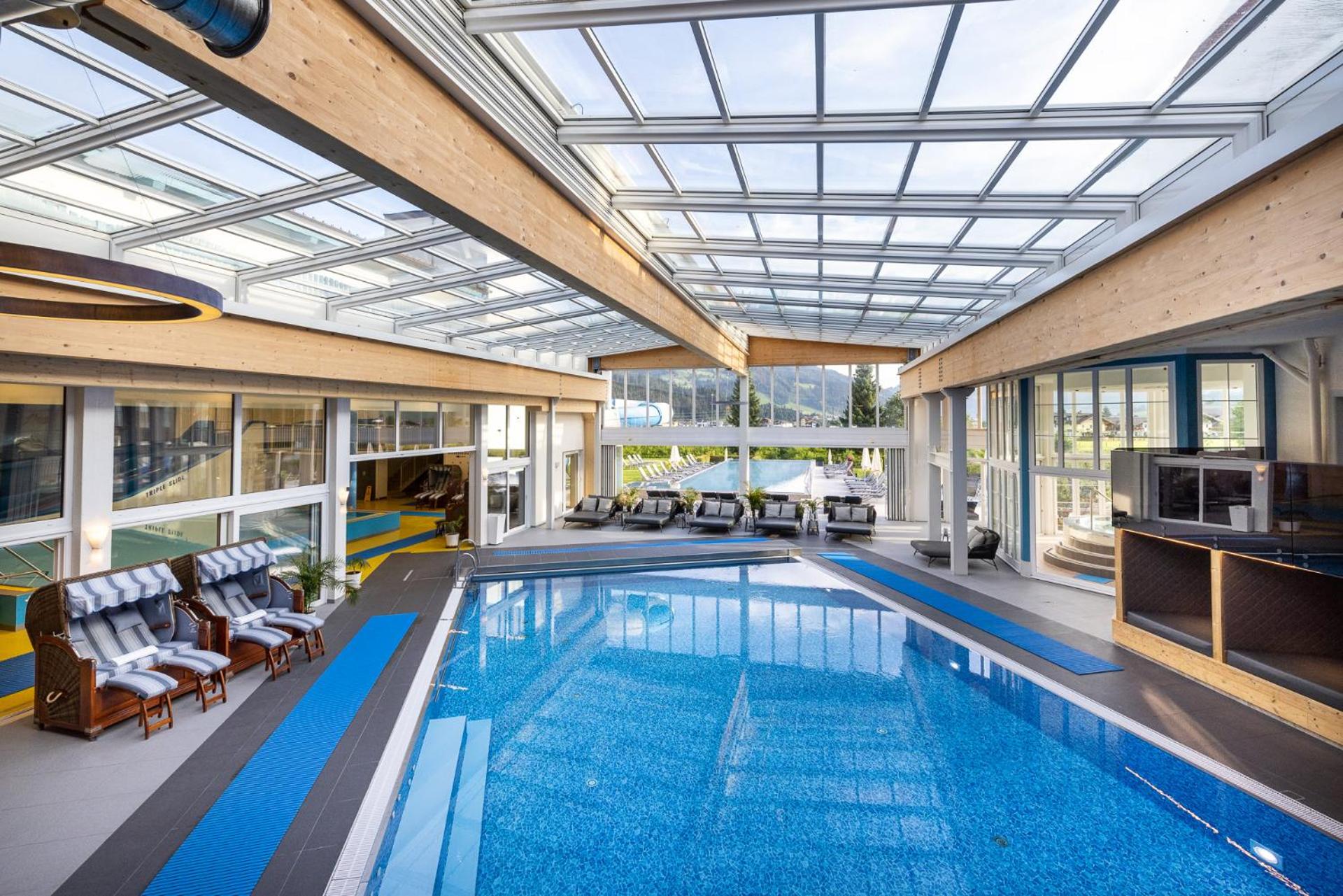 Indulge in relaxation at the 2,000 m² spa area offering various saunas, steam baths, a hot tub, and a range of massages and beauty treatments. The heated panorama indoor pool with a retractable roof is a highlight, perfect for unwinding after a day of activities.