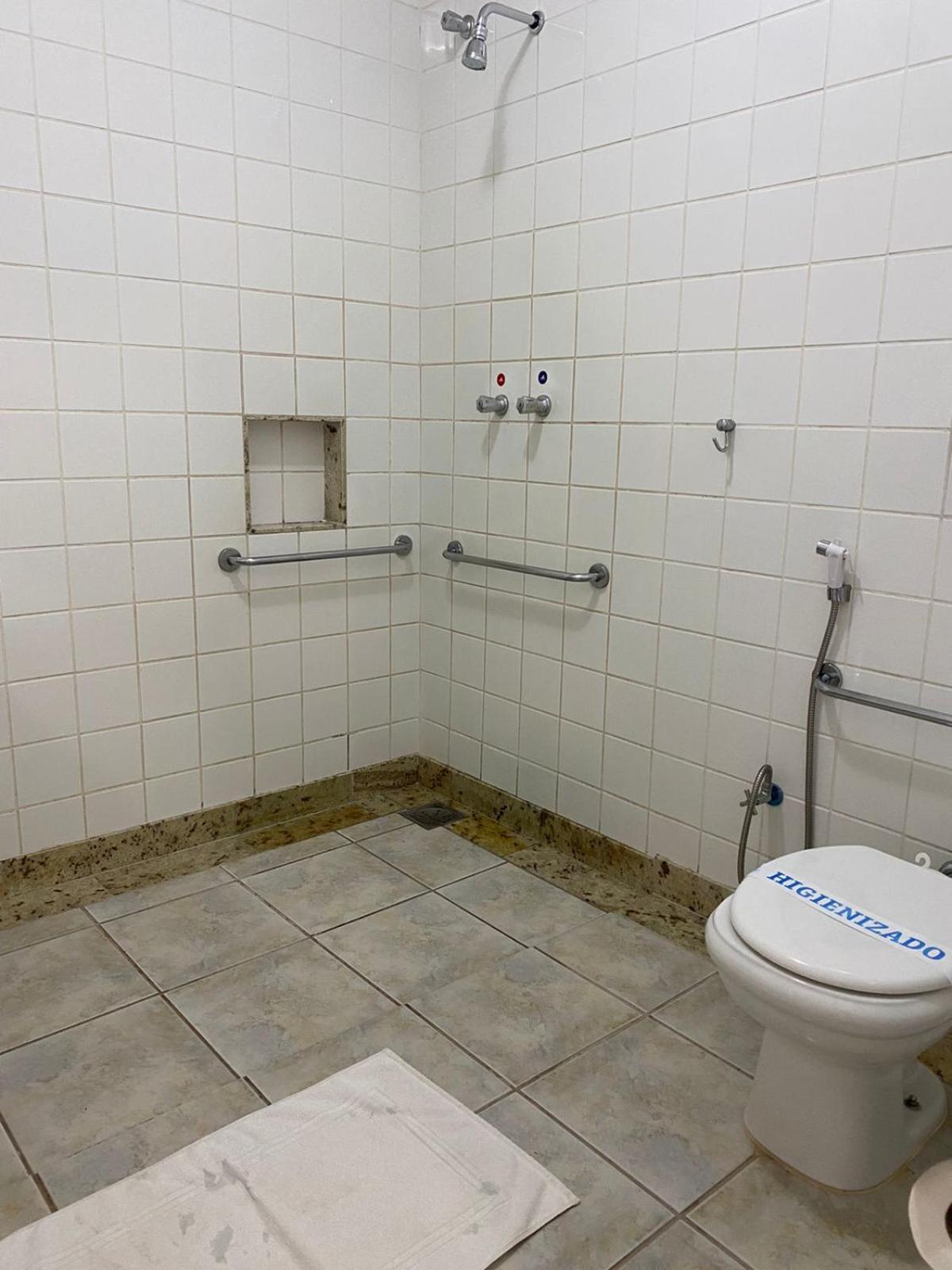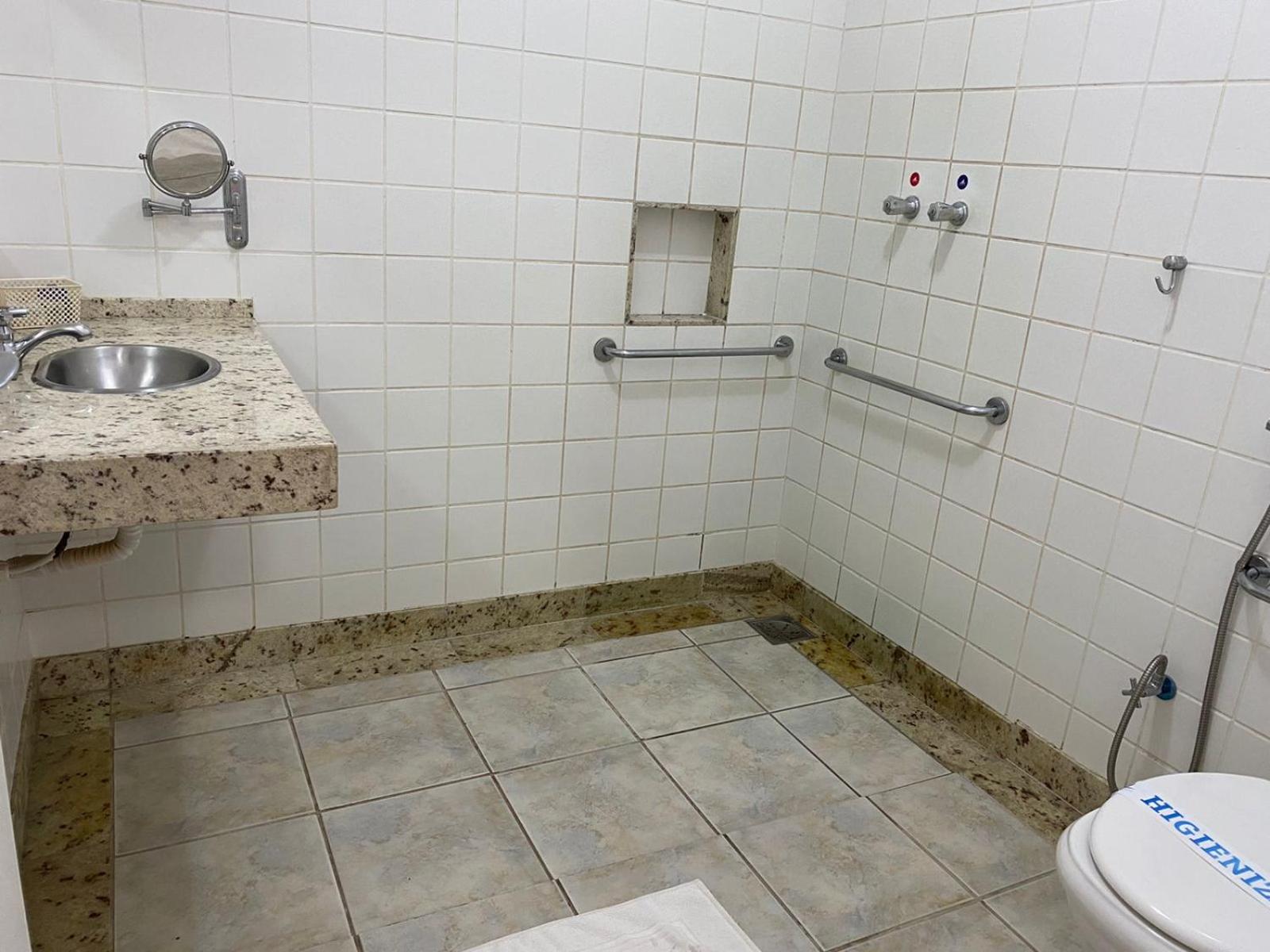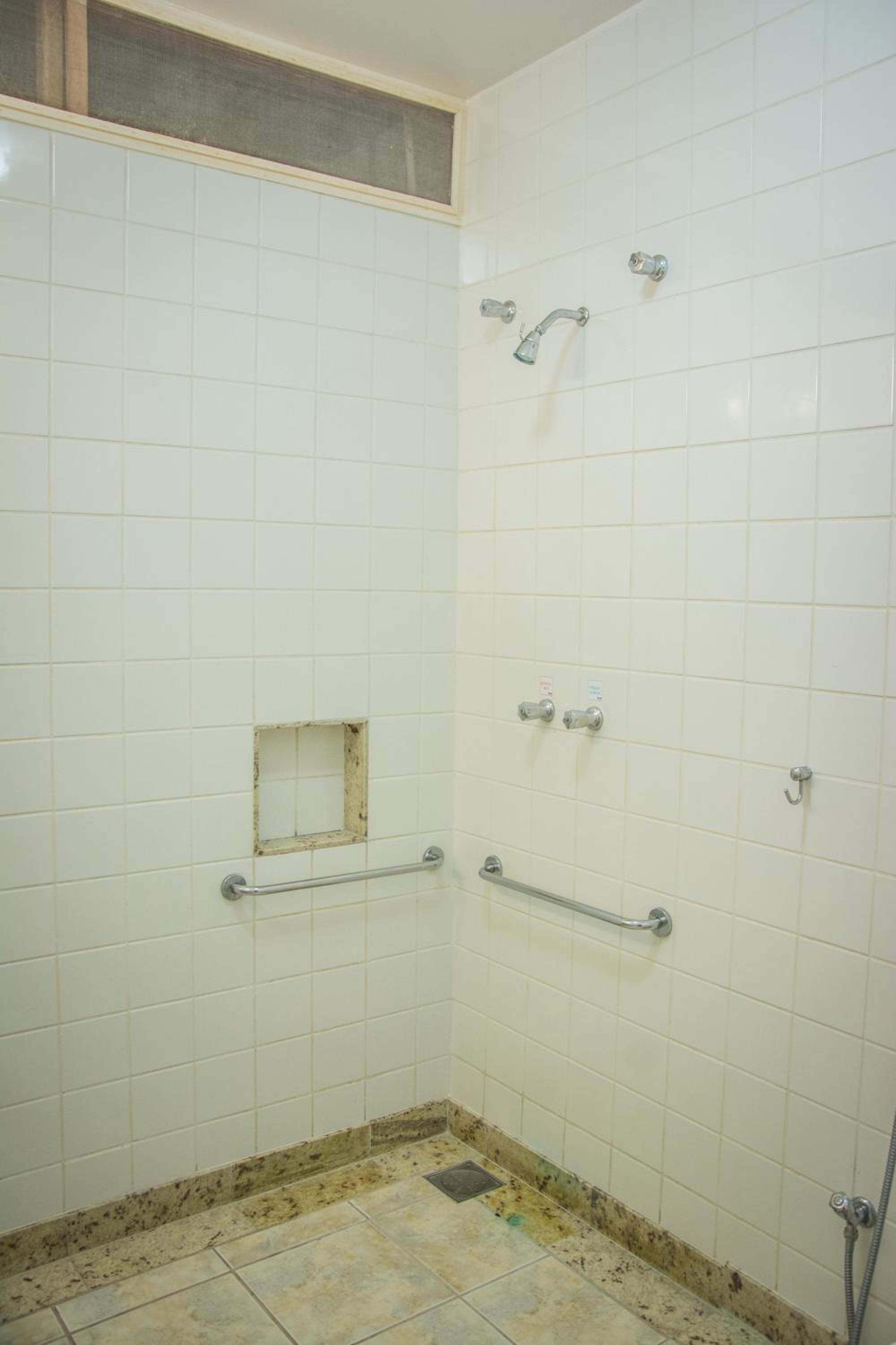 Da limpeza: banheiro com teto e azulejos mofados. Portas e cortinas do refeitório sujos.