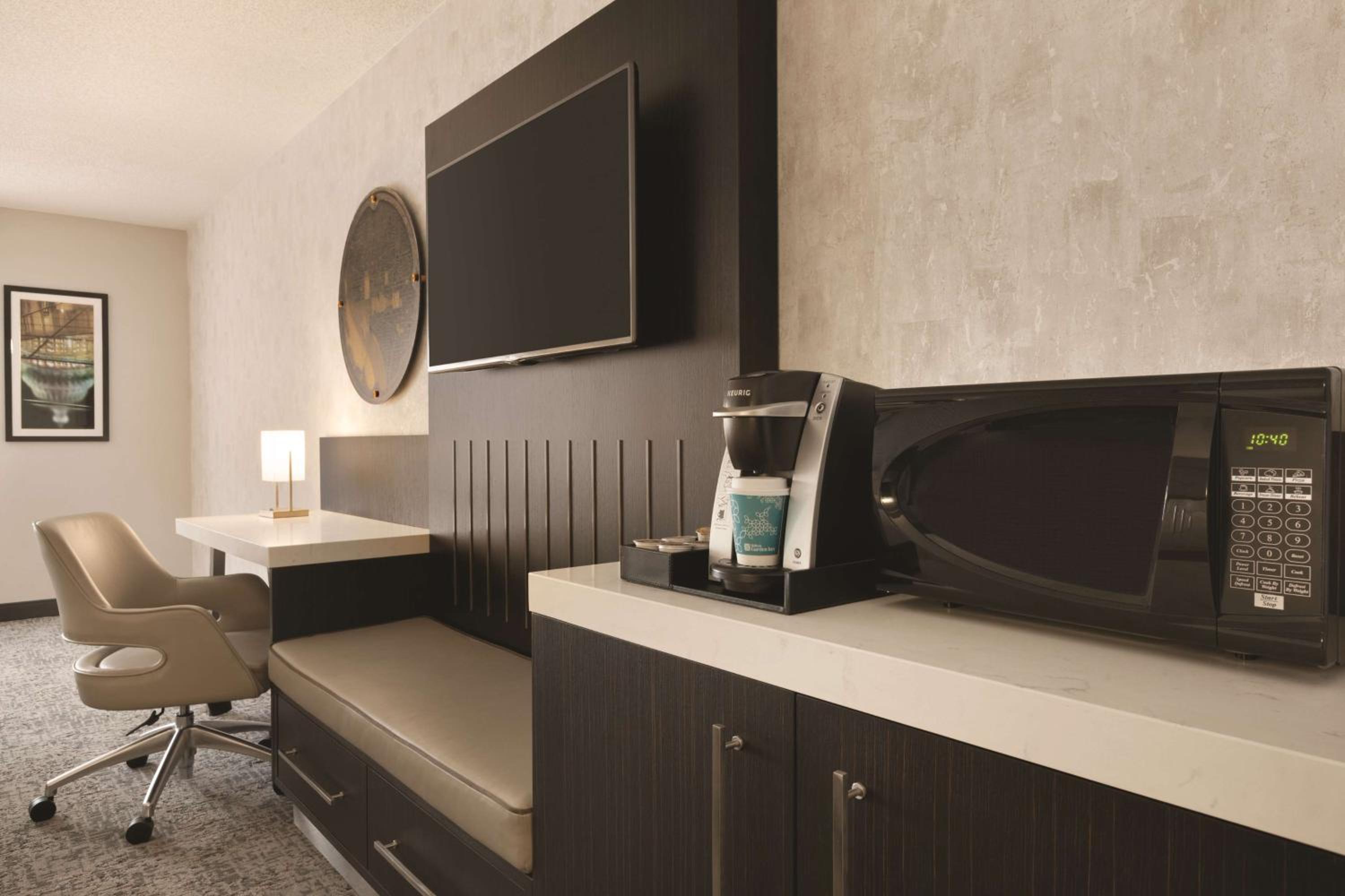Each guest room features a 32-inch flat-screen TV, microwave, refrigerator, and coffee maker, ensuring a comfortable stay for every guest.