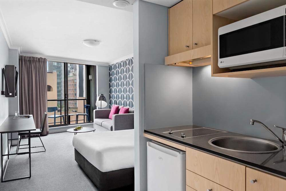 Was grateful for an upgrade from studio apartment to 1 bedroom apartment, the living area is spacious, bed room size adequate. The apartment is very dated in decor. Boiled the kettle & it tripped the fuses! Location is convenient to Central station train & light rail