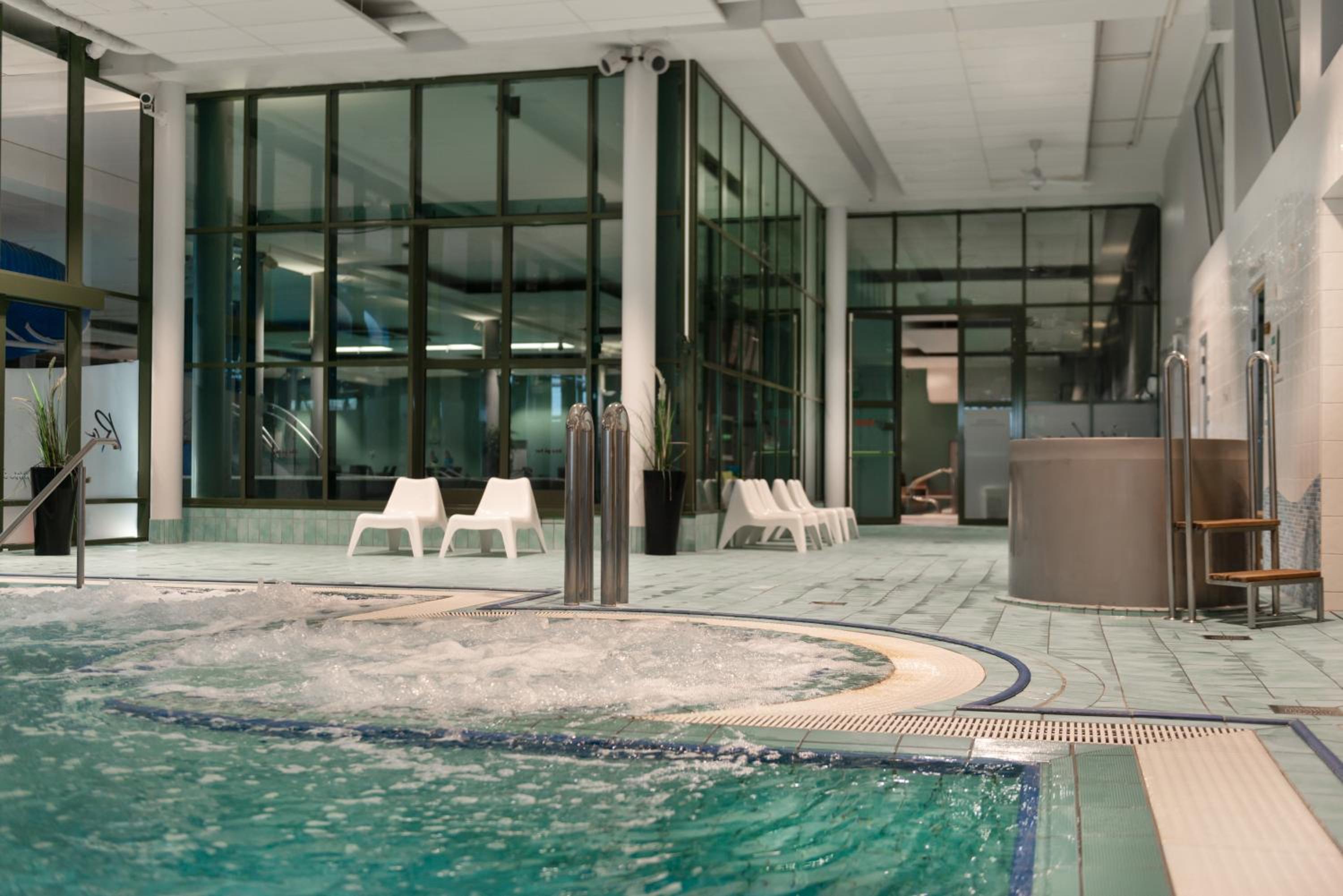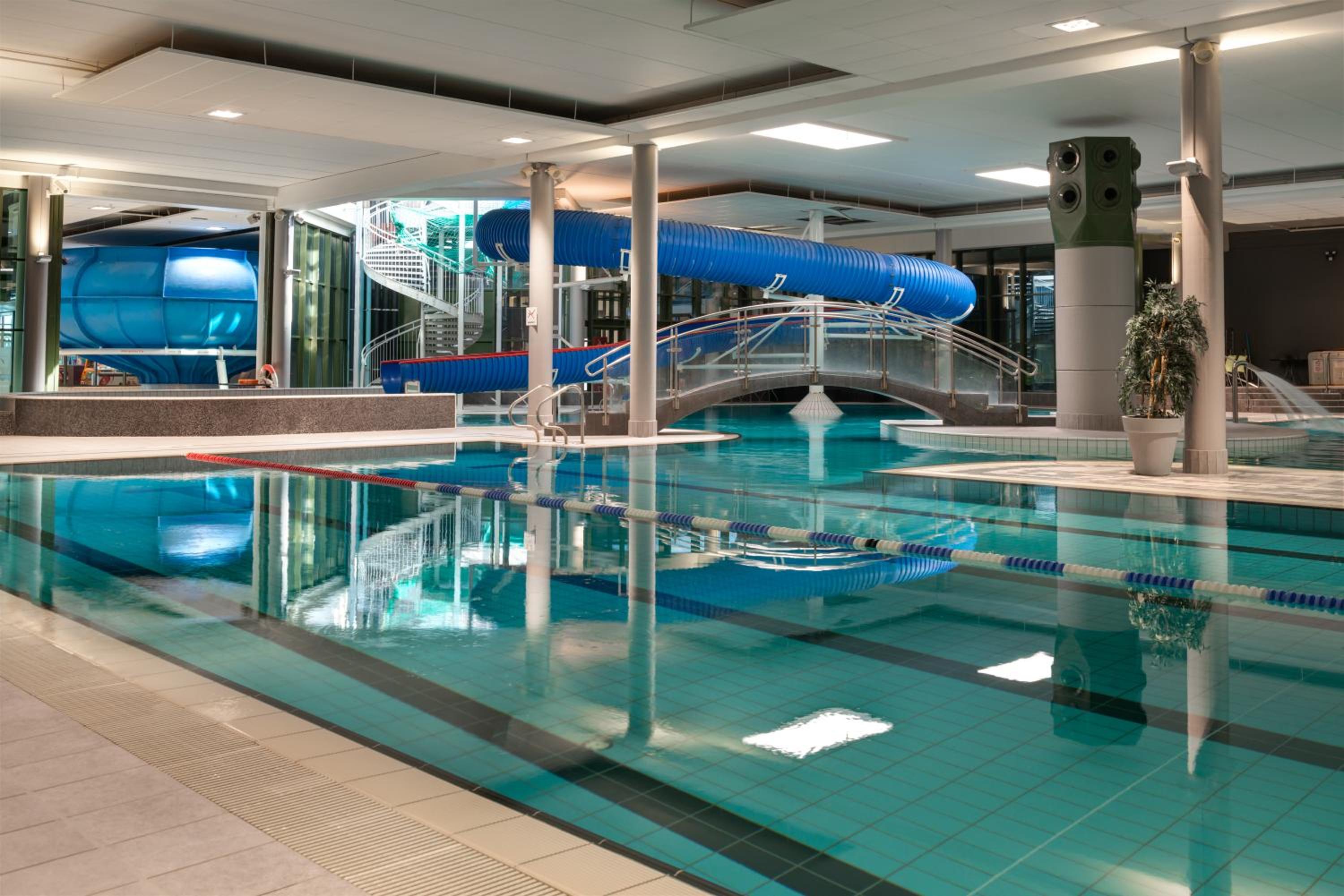 Indulge in relaxation at the waterpark's spa and wellness centre, featuring swimming pools, sauna, steam room, and water slides for guests to enjoy.