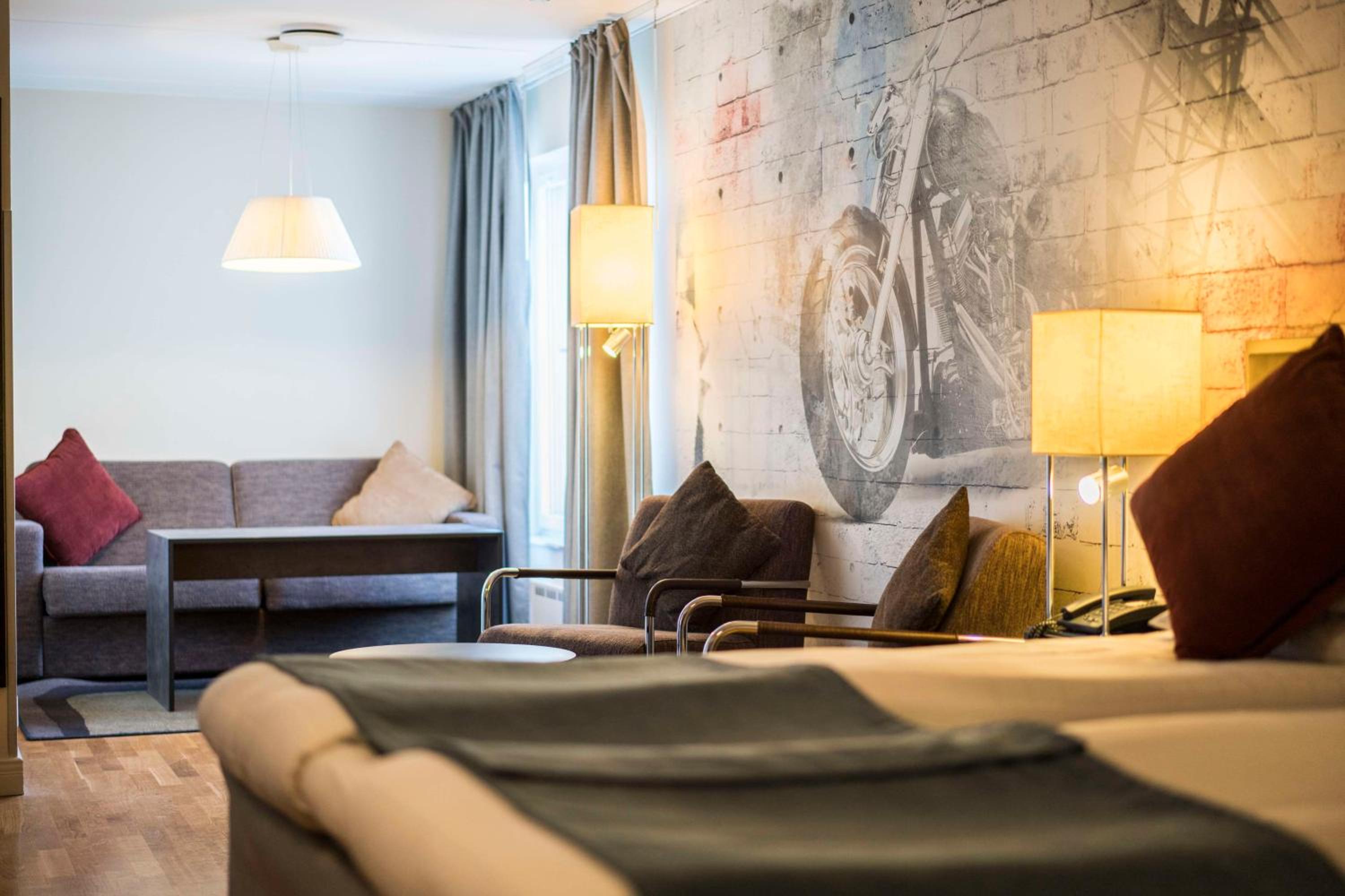 Luxurious Amenities: Scandic Skärholmen features modern guest rooms with light wooden floors, TVs, and some with separate seating areas.