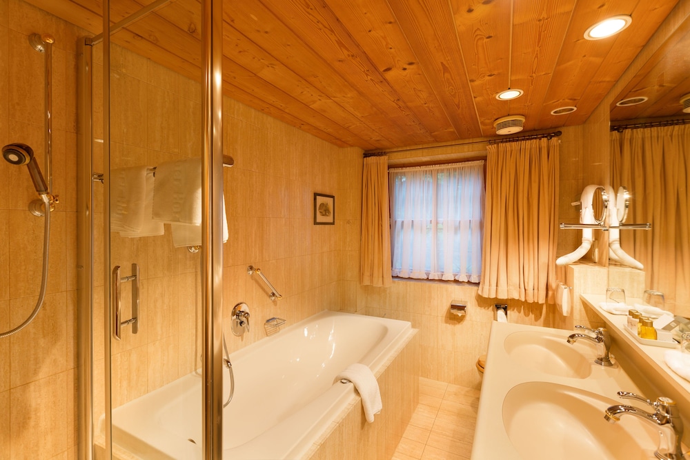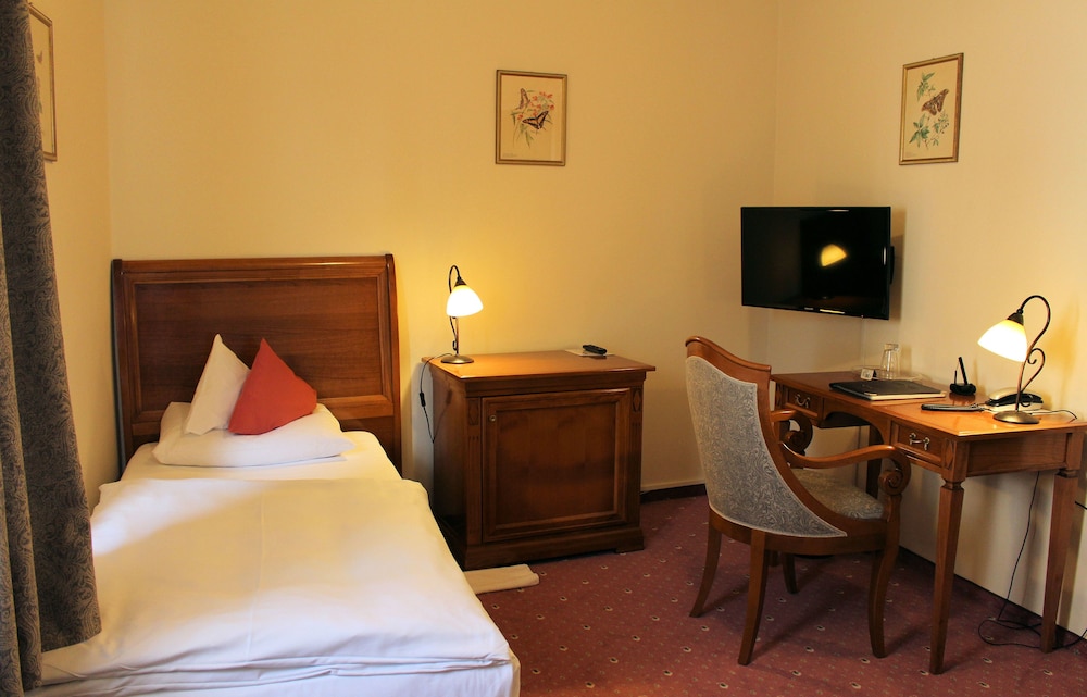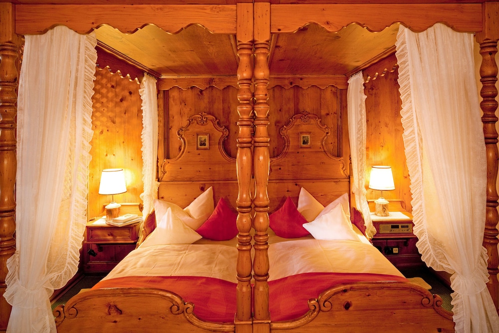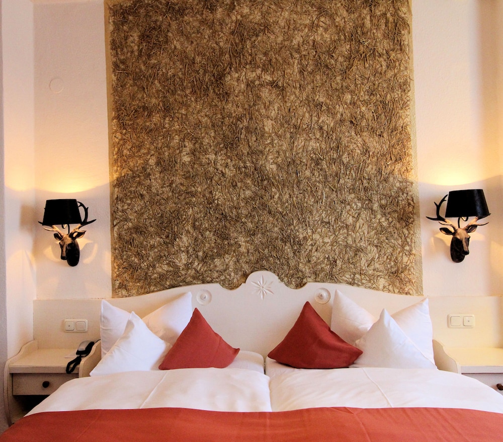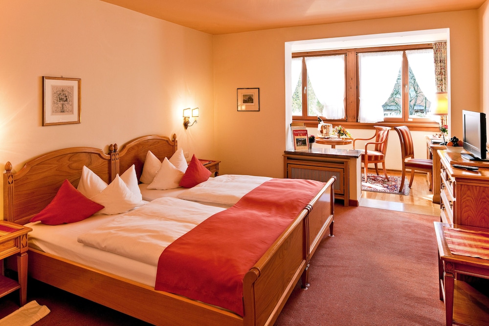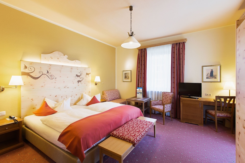 Lovely old Bavarian hotel with beautiful wood and carvings. Nice big room, comfortable bed, and modern shower.
