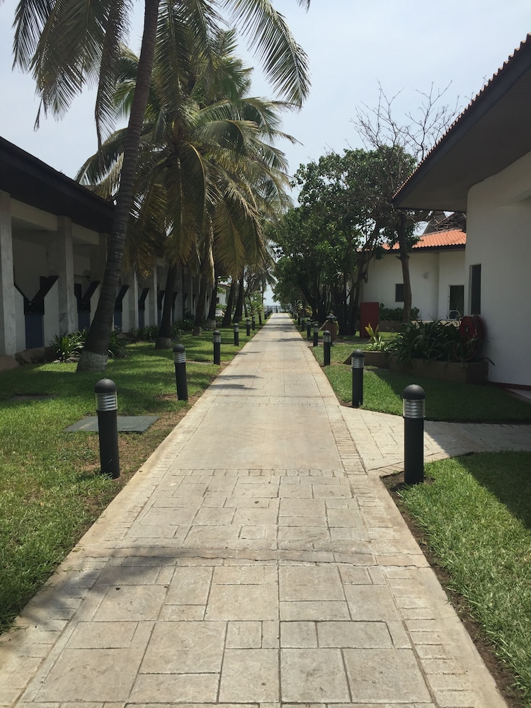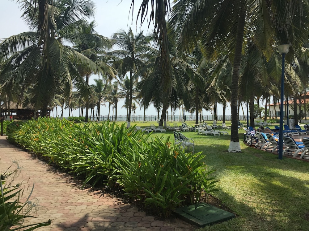 We had warm welcome from the friendly staff and an enjoyable stay. The rooms are reasonably well maintained, welcoming and comfortable. Staff are always friendly and helpful and problems dealt with quickly. The setting in large grounds with large pool, coconut palms and extensive lawns provides a tranquil setting near the bustling city centre. The hotel is on the seafront but separated from the beach by a metal fence and locked gate - which is probably for the best. The local beach is short walk along the main road outside the hotel. The buffet meals are good quality - expensive by Accra standards. A la carte items are disappointing - menu needs refreshing. The breakfast buffet is good including cook to order eggs. On the negative side, the hotel is a little dated in some areas - they are not keeping up with maintenance in all areas. Also, they have failed to keep the occasional hawker out which can be a nuisance. It also is a sign of lax security. I will none the less return in future - still a great place to stay.
