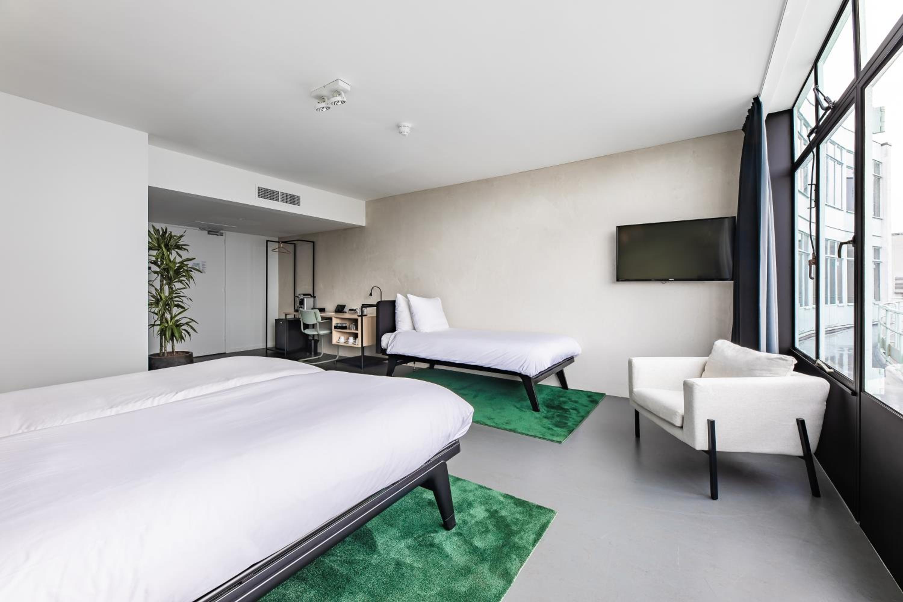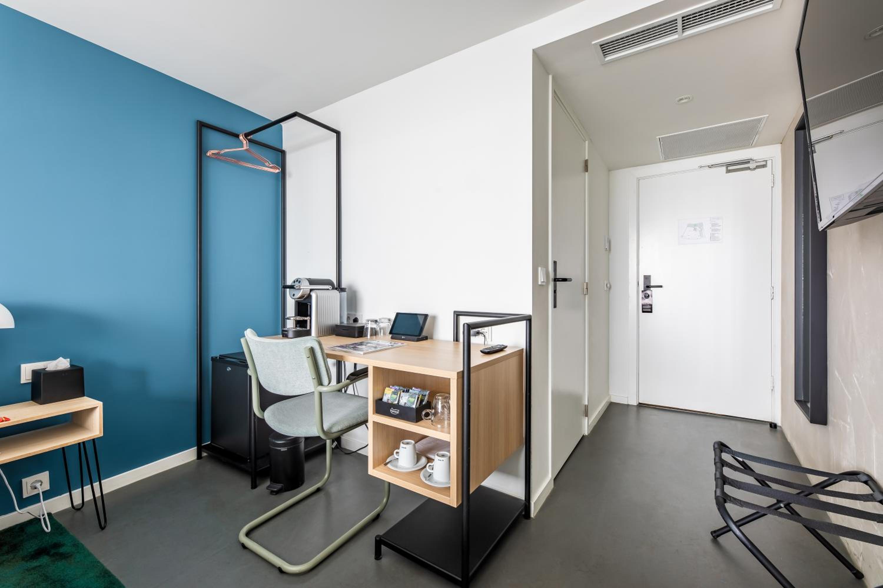 Auping comfortabel bed met stevige matras, retro details overal in hotel, bad, dubbele regendouche, koffie/thee en koelkast in de suite, groot tv-scherm, comfortabele stoelen, veel ruimte, oordopjes, slippers, prima ontbijt, zeer vriendelijk personeel, uitrijkaartje parkeergarage bij vertrek.