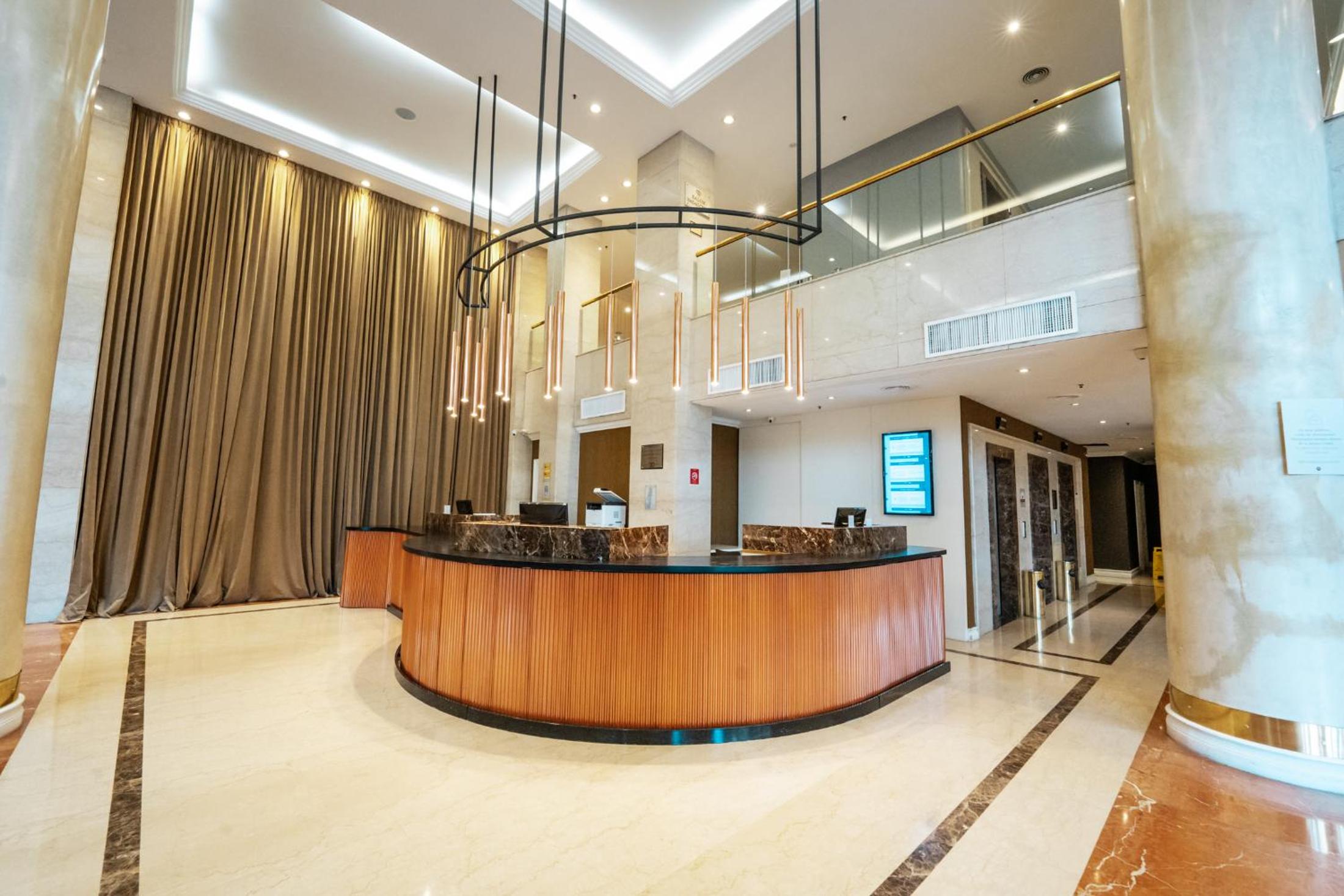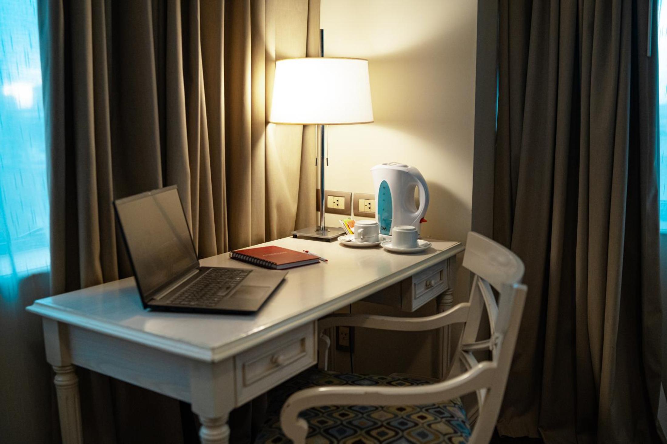 Stunning Views and Elegant Decor: Experience comfort and luxury in our carpeted rooms with floor to ceiling curtains, offering panoramic city views and equipped with top-notch amenities.
