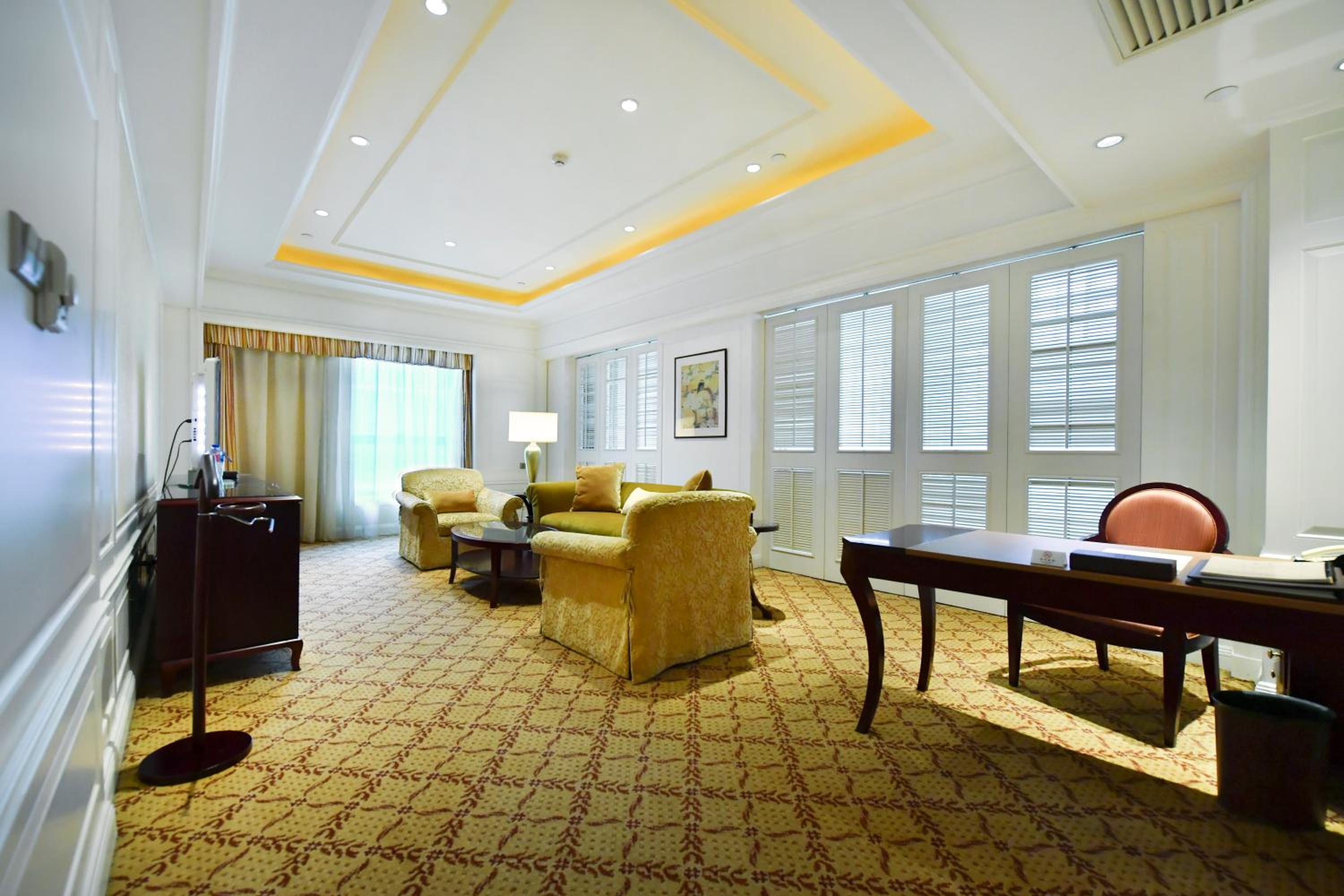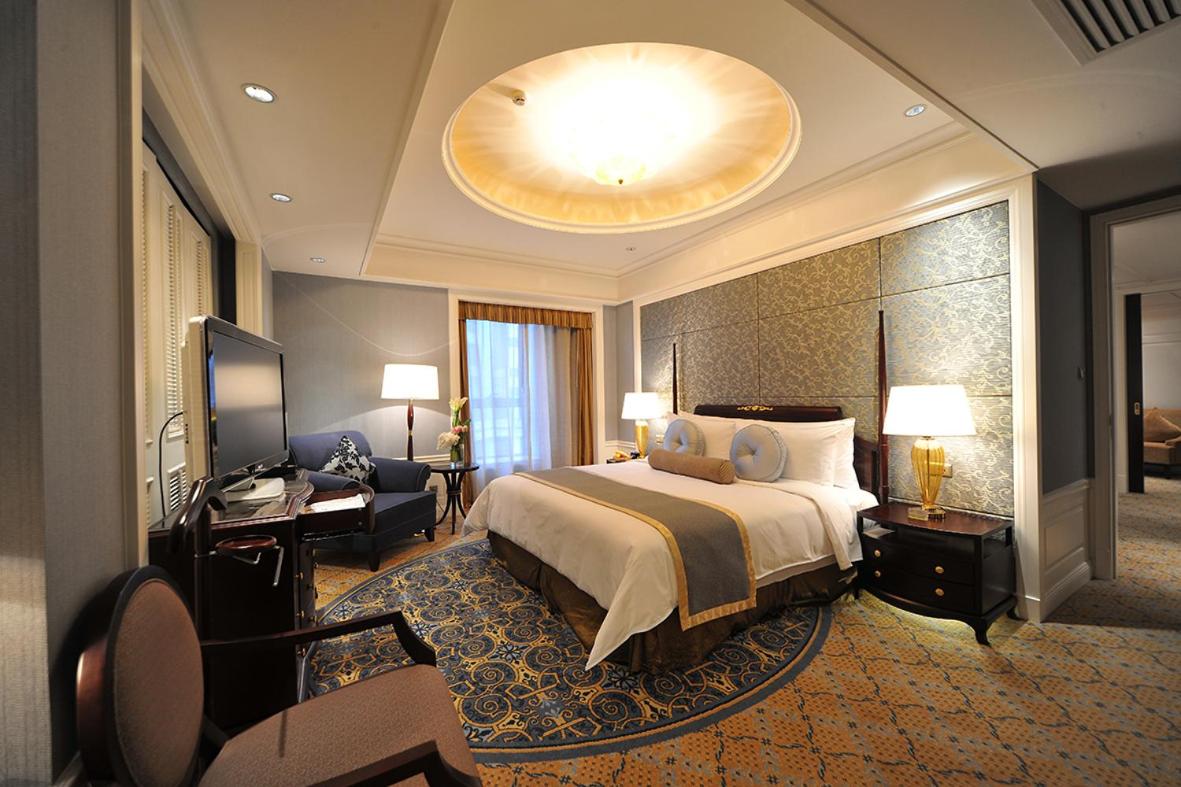 Grand Central Hotel Shanghai offers elegantly designed rooms with modern amenities like free internet access, flat-screen TVs, and marble bathrooms. The golden and brown hues create a warm and inviting atmosphere for guests to relax in style.