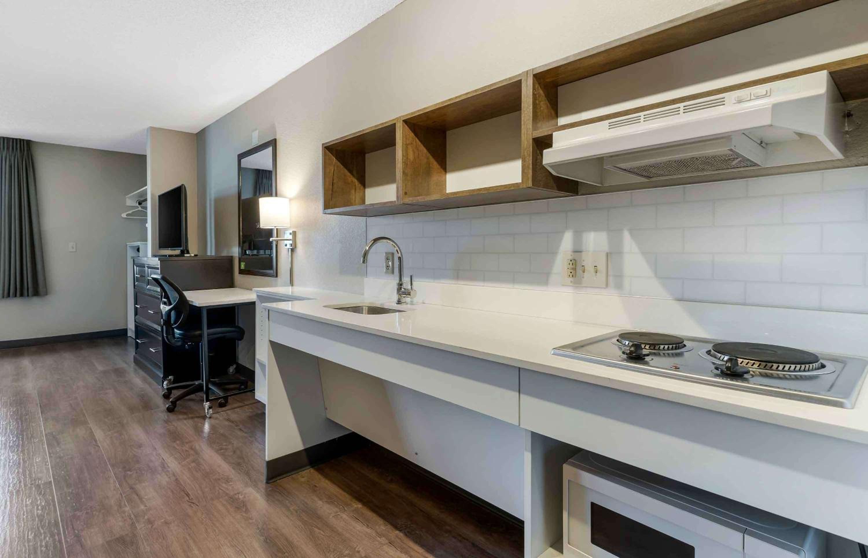 Enjoy the convenience of fully equipped kitchenettes in every room, complete with a stove-top, microwave, and fridge for a comfortable extended stay.