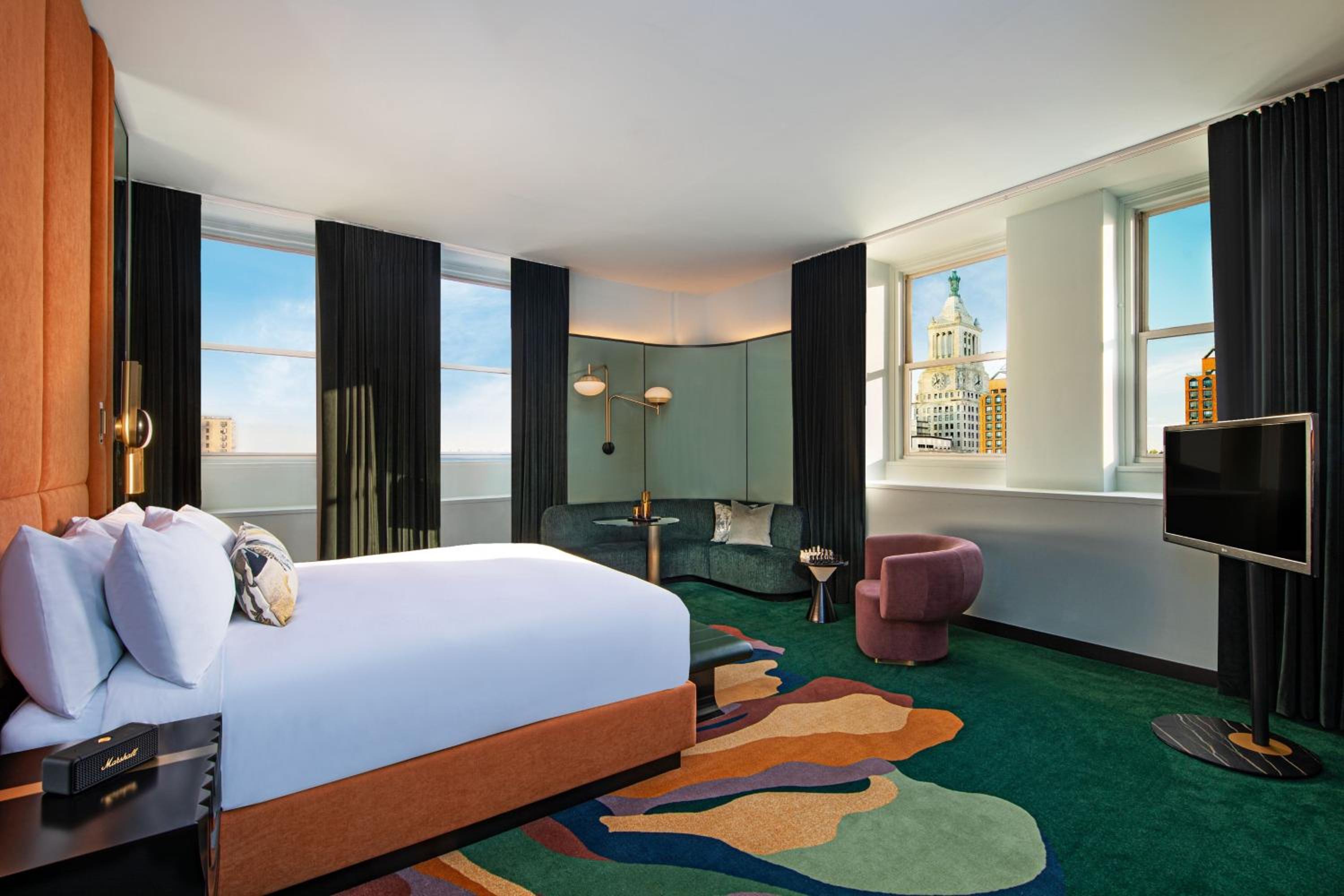 Experience comfort and style in our brown accented rooms, each equipped with a 42-inch flat-screen TV for your entertainment. Whether you're winding down after a day of sightseeing or staying in for a cozy night, our rooms offer the perfect retreat in the heart of the city.