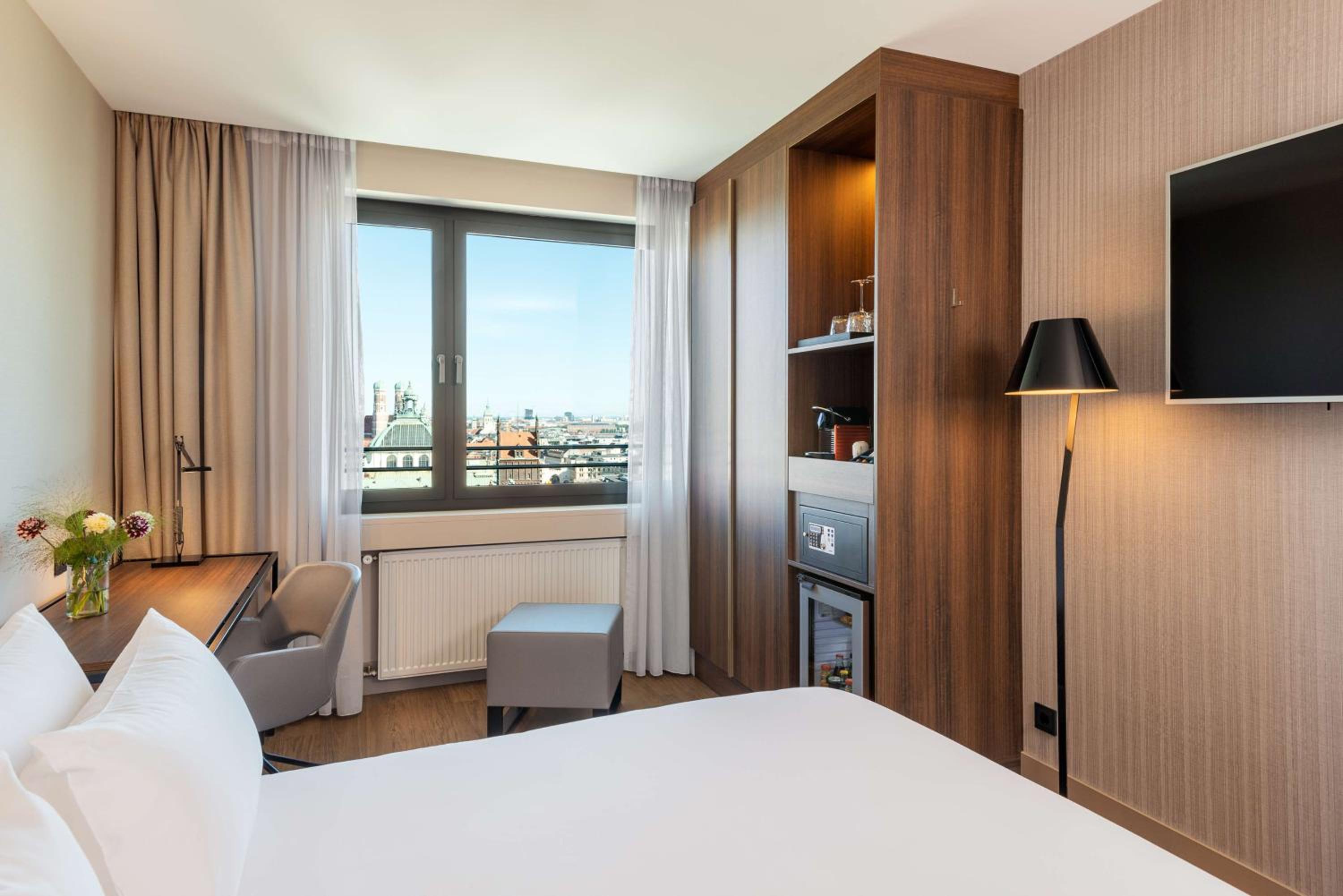 Experience stunning panoramic views of Munich city centre from the comfort of your room at NH Collection München Bavaria, conveniently located beside Munich Main Station.