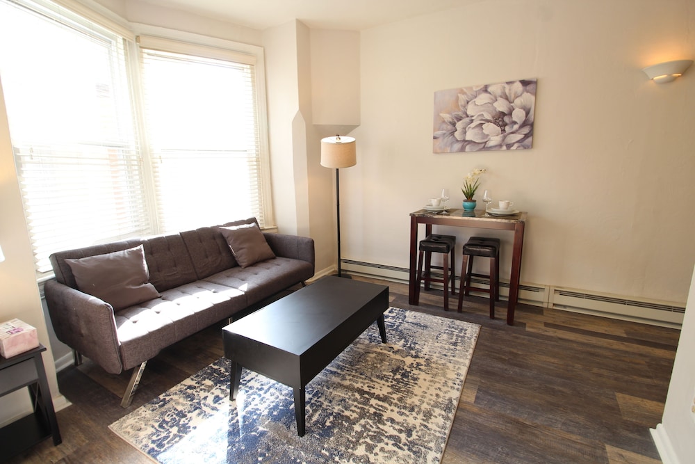 Location and rate was great, and the best thing about this property. Original property booked had 2 queen beds. Due to overbooking, was relocated to a different property where I was assured there would be a sofa bed that would be made up for us so both parties could have their own bed. I was disappointed upon arrival that not only was the sofa bed not made up for us, but there were no sheets for us to make it up for ourselves. We made the best of it. The kitchen is well appointed, but the oven appeared to be nonfunctional, and there was a slight smell of escaping gas from it. The table setting, while lovely, was for show, as the dishes on the table were dusty. The light fixture above the table with a ceiling fan was very dusty as well. The apartment is a combo of new and worn - the coffee table looks well-used, and the bathroom sink and fixtures are the dated but functional. That being said, the price point still makes this a good deal for a Philly visit!