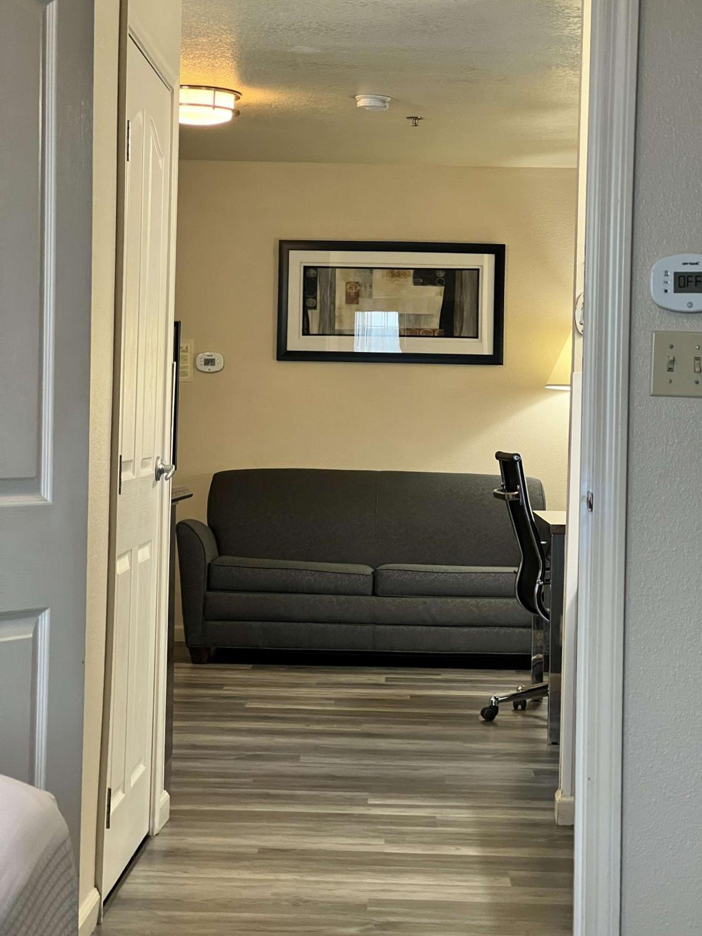 The plugs in the room wasn't working well. Beds were uncomfortable. Small pillows were uncomfortable. Had a death in the family and had to leave a day early. Hotel couldn't refund the day we did not stay.