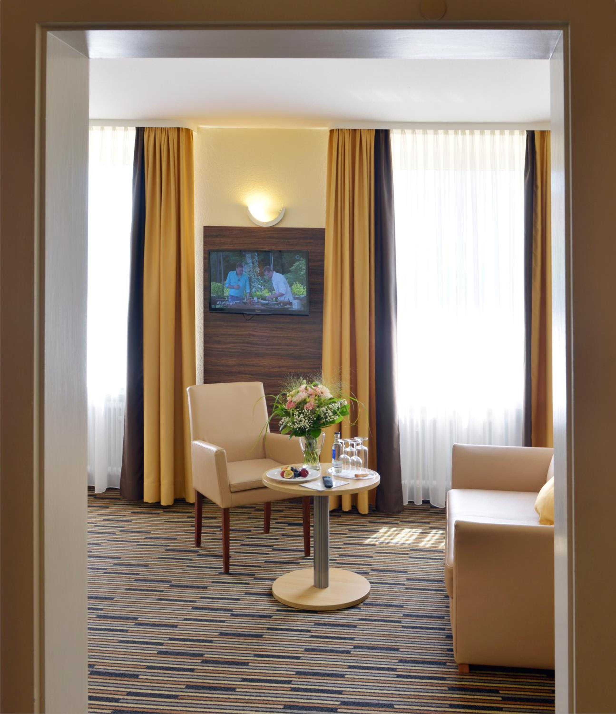 Die tolle Lage des Hotels, ruhig im Schwimmbad- und Saunabereich, nette Osterdeko in den Sitzbereichen im EG, reichhaltiges Frühstücksbuffet mit schönem Ausblick auf den Park,