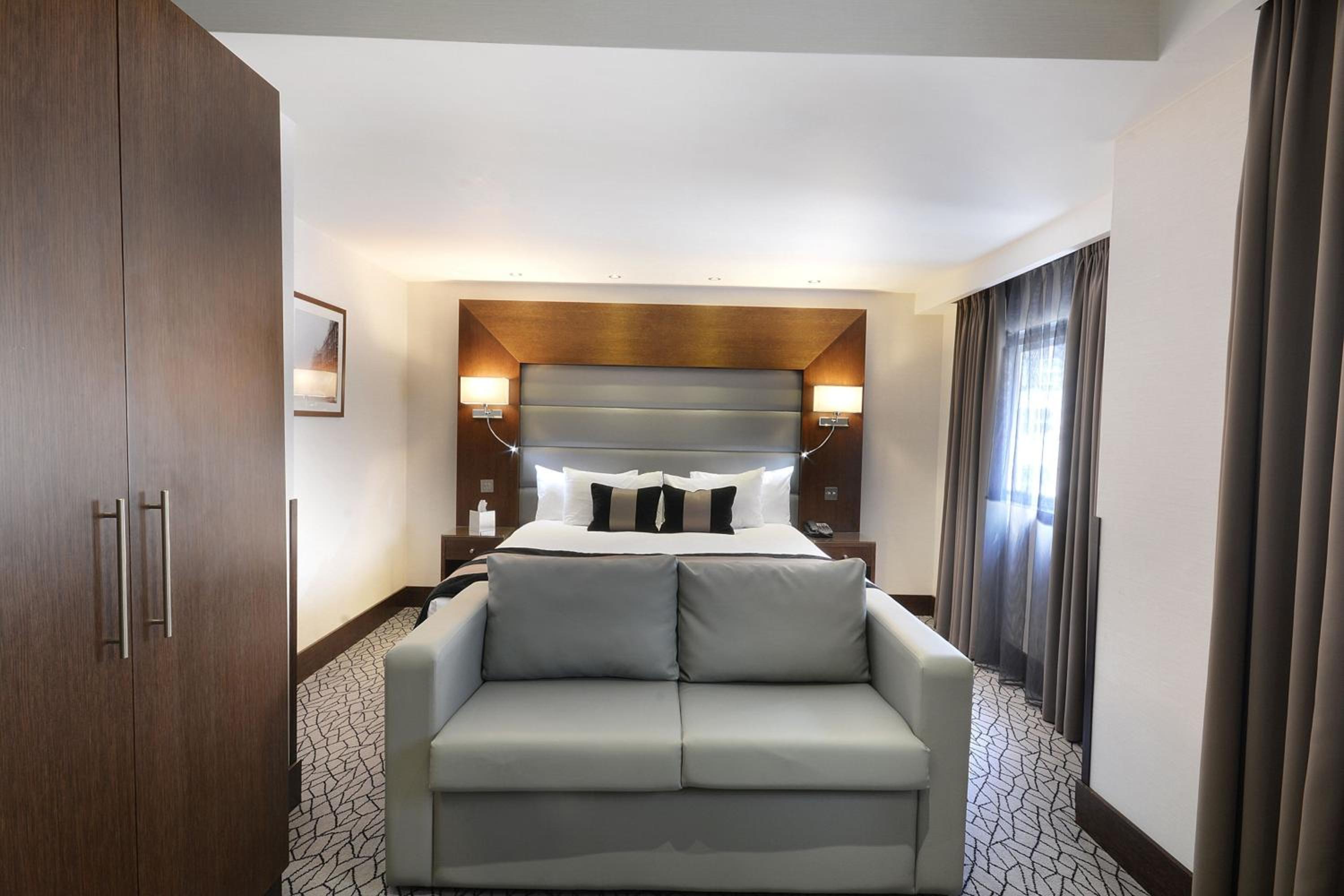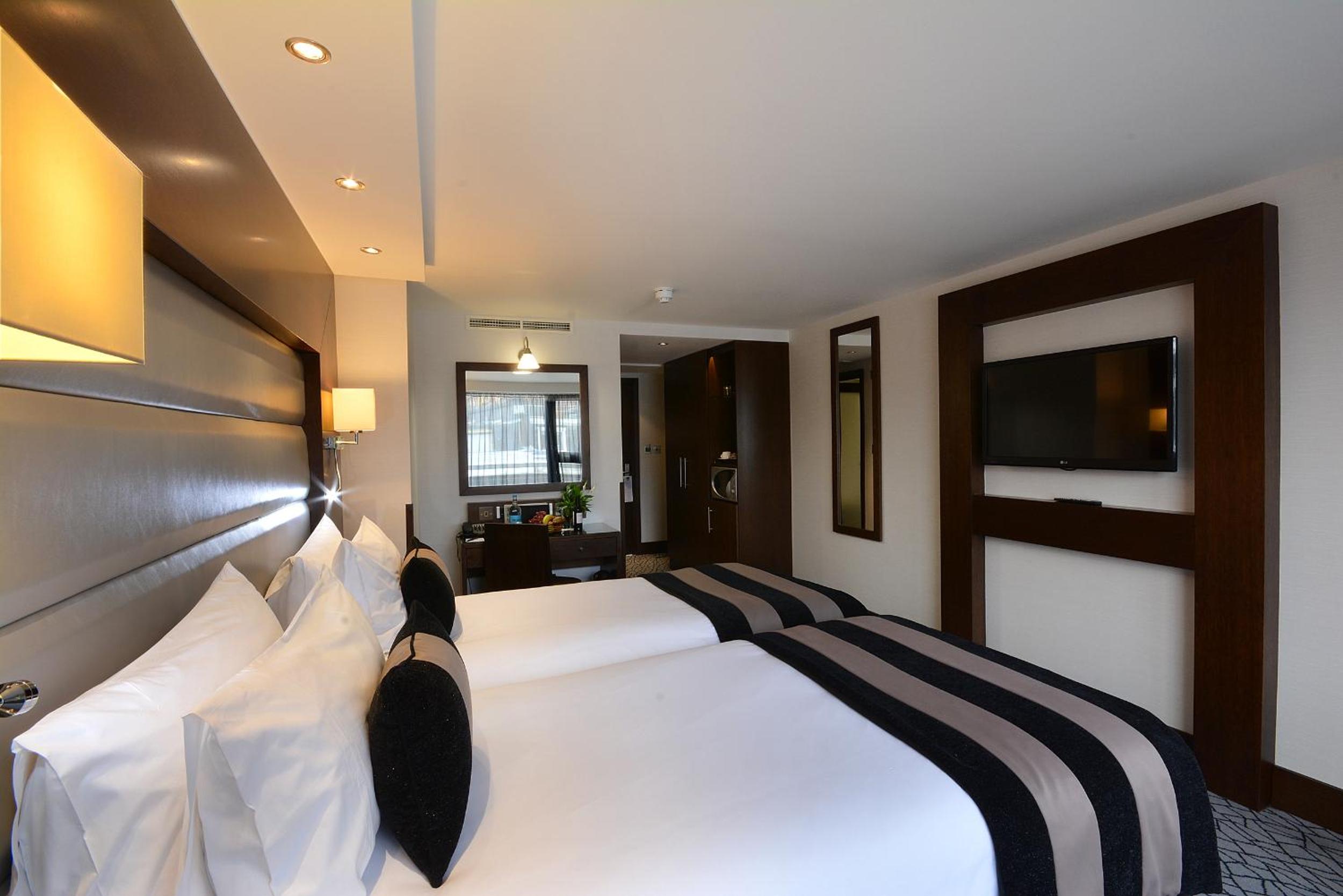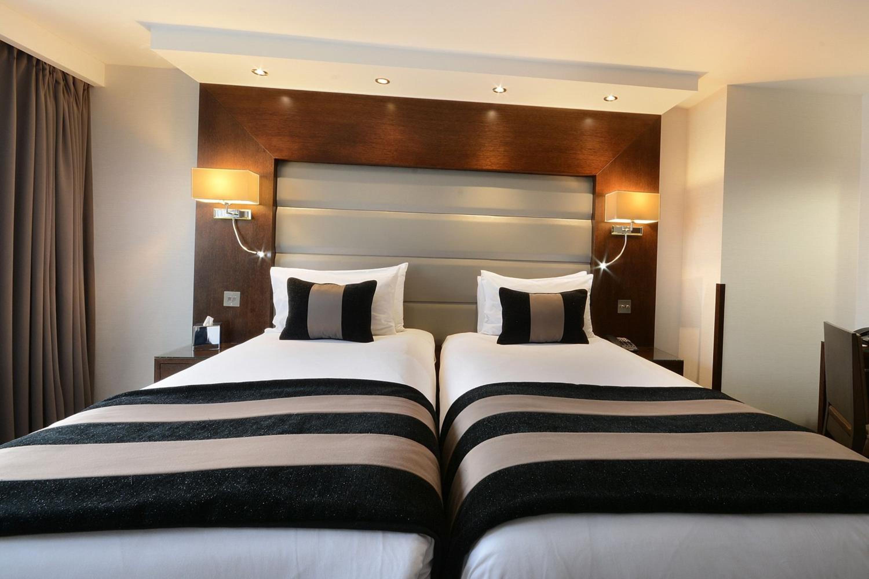 Indulge in the elegant rooms at Park Grand London Kensington, featuring luxury bathrooms, satellite TVs, and stylish decor.