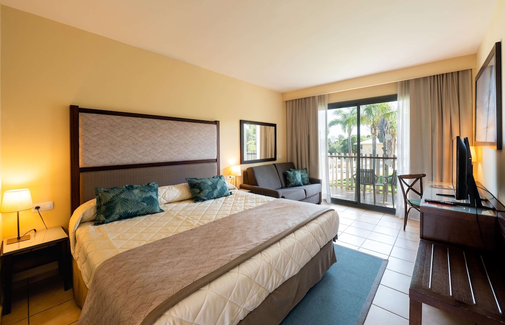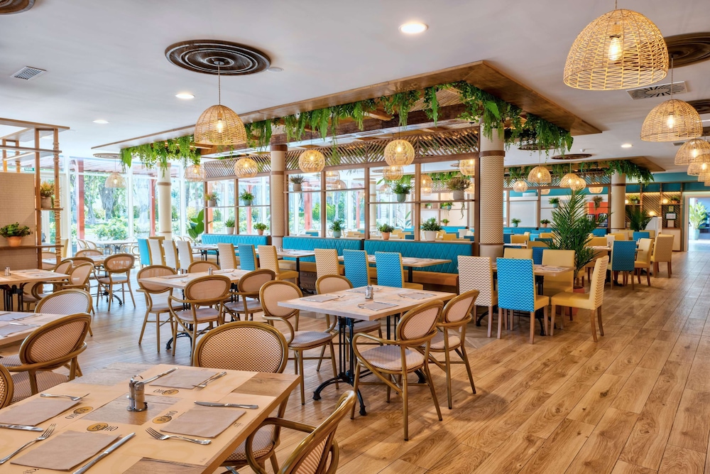 Este hotel se encuentra bastante lejos de Port aventura. Por lo menos 15 mn y caminando deprisa. Si vais con niños, tened en cuenta que hay que andar bastante. No hay ningún transporte para llegar a Port Aventura desde el hotel. Si os alojáis con niños, como fue mi caso, tened en cuenta que no permiten ni flotador ni pelotas ni nada que se pueda inflar en la piscina. Tampoco te dejan usar gafas de sol a no ser que las tengas atadas. ¡¡Nunca he visto esto!! Estar en una piscina sin gafas de sol es insufrible si tienes los ojos claros. Hace daño. No poder usar ni un triste flotador o pelota para jugar es muy aburrido para los niños. Si escogéis PENSIÓN COMPLETA, que sepáis que NO HAY RESTAURANTES en el hotel para comer a mediodía. Bueno...hay restaurantes y chiringuitos pero están todos CERRADOS. Decisión de dirección, supuestamente. Sólo queda un bar para comer un bocadillo y otro bar/chiringuito en una de las piscinas donde comer comida basura a precio de oro. MUCHA COLA. NORMAL visto que no hay donde comer...POCO PERSONAL. Hay que tener en cuenta que, para comer a mediodía, tienes códigos QR en una app, pero los tienes que gastar en una sola compra. No puedes ir descontando tus compras a medida con el importe que tienes asignado. Tampoco nadie es capaz de decirte qué importe tiene el QR. Total: acabas gastando más de lo que deberías y cogiendo cualquier cosa para gastar sí o sí el importe aunque no quieras. ANIMACIÓN: ¡CERO! la discoteca está cerrada también. No hay ni un espectáculo ni música en vivo ni nada de nada. Un hotel de lo más ABURRIDO. No hay NADA. Ni de día ni de noche. BUFET (DESAYUNO Y CENA): Poco surtido y cada día igual. LIMPIEZA/HABITACIÓN: El tamaño de la habitación es correcto, pero la limpieza deja mucho que desear. Aparte de la limpieza, se nota que el mantenimiento tanto en las habitaciones como en el hotel en general es una asignatura pendiente. Falta MANTENIMIENTO Y SEGURIDAD. No hay nadie para controlar.