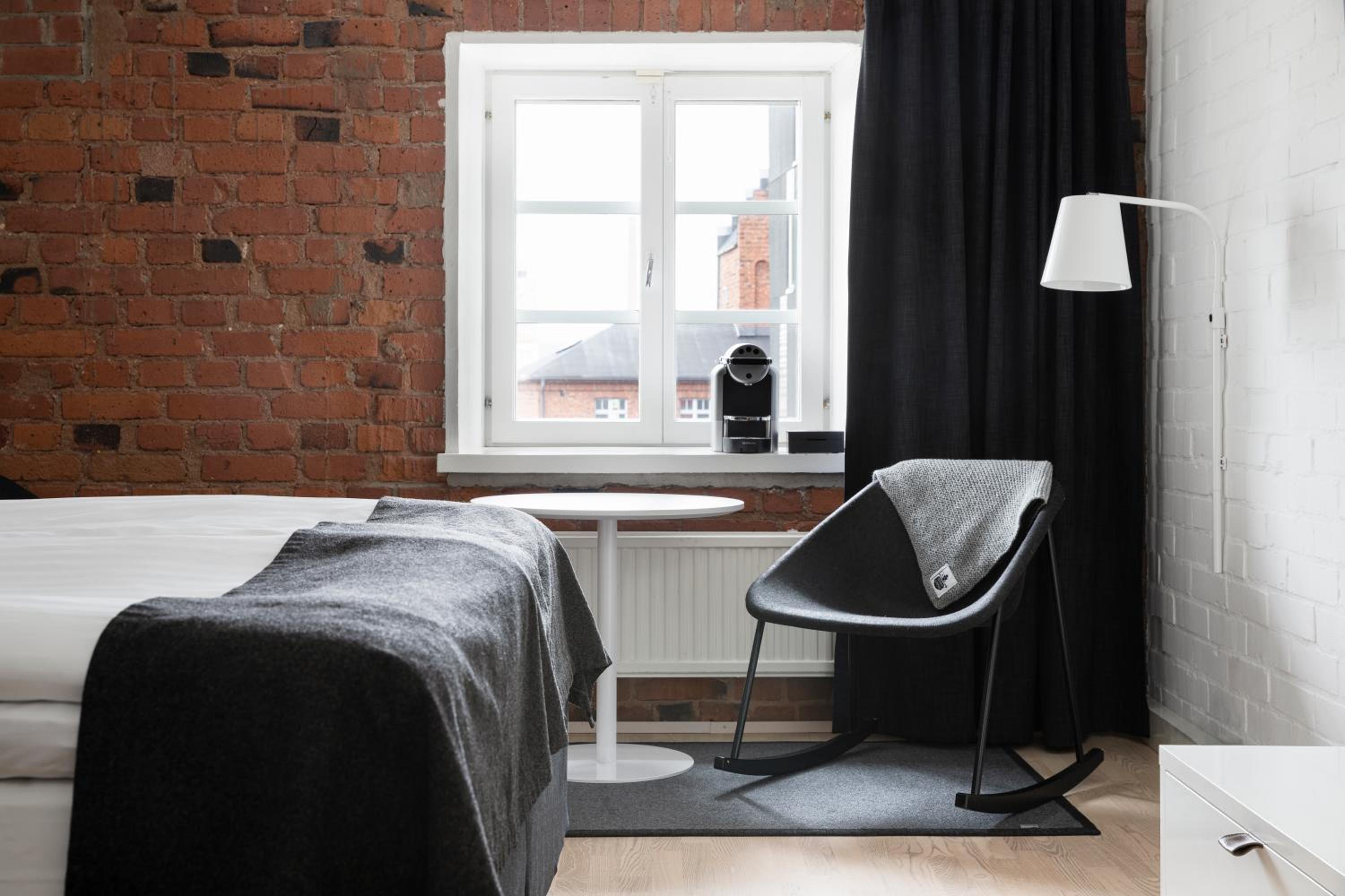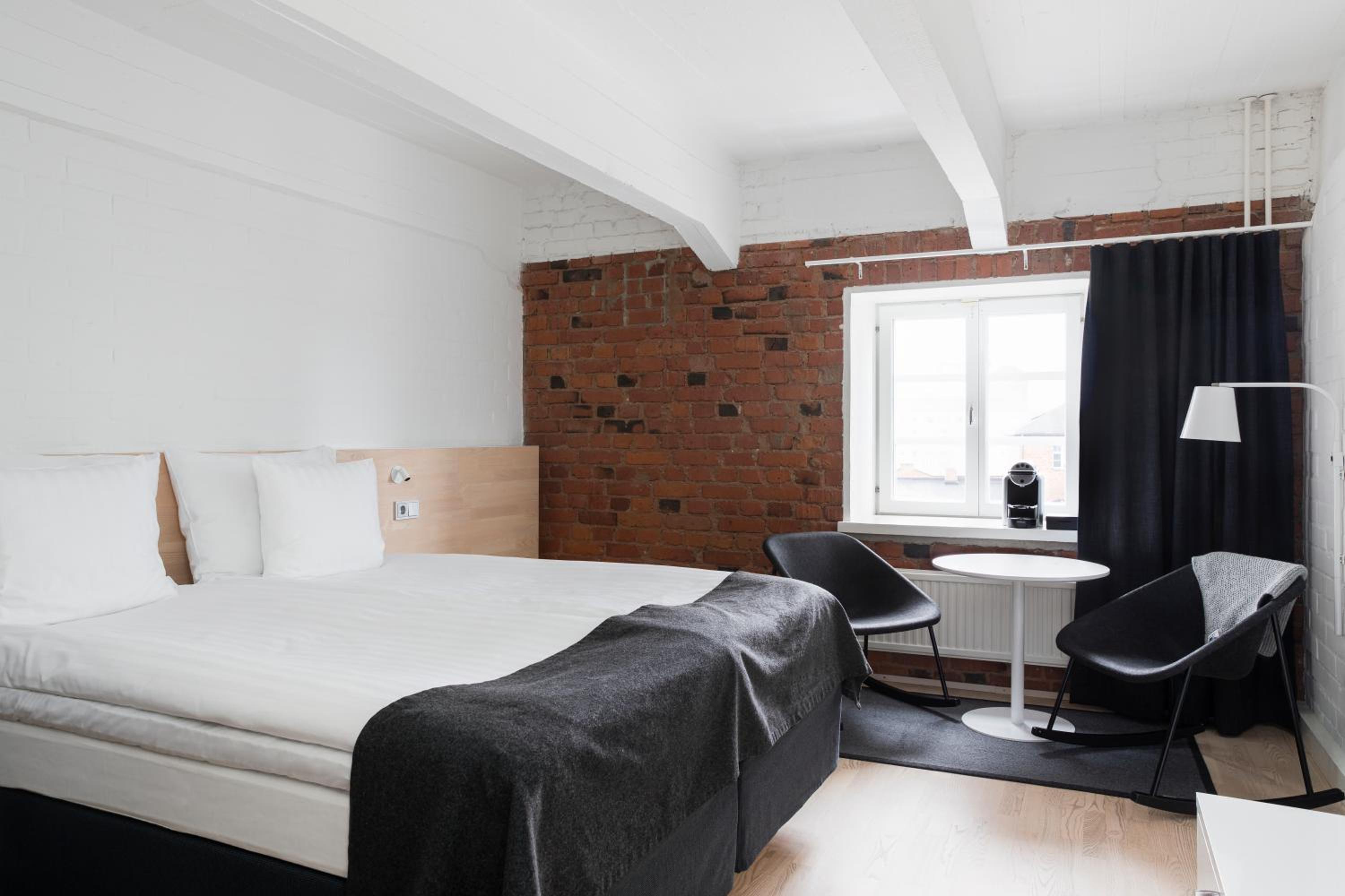 Located in a former grain storehouse, the renovated Tampere hotel combines historic charm with modern amenities. The unique interior décor of the air-conditioned rooms, some with exposed brick walls, offers a cozy atmosphere for guests.