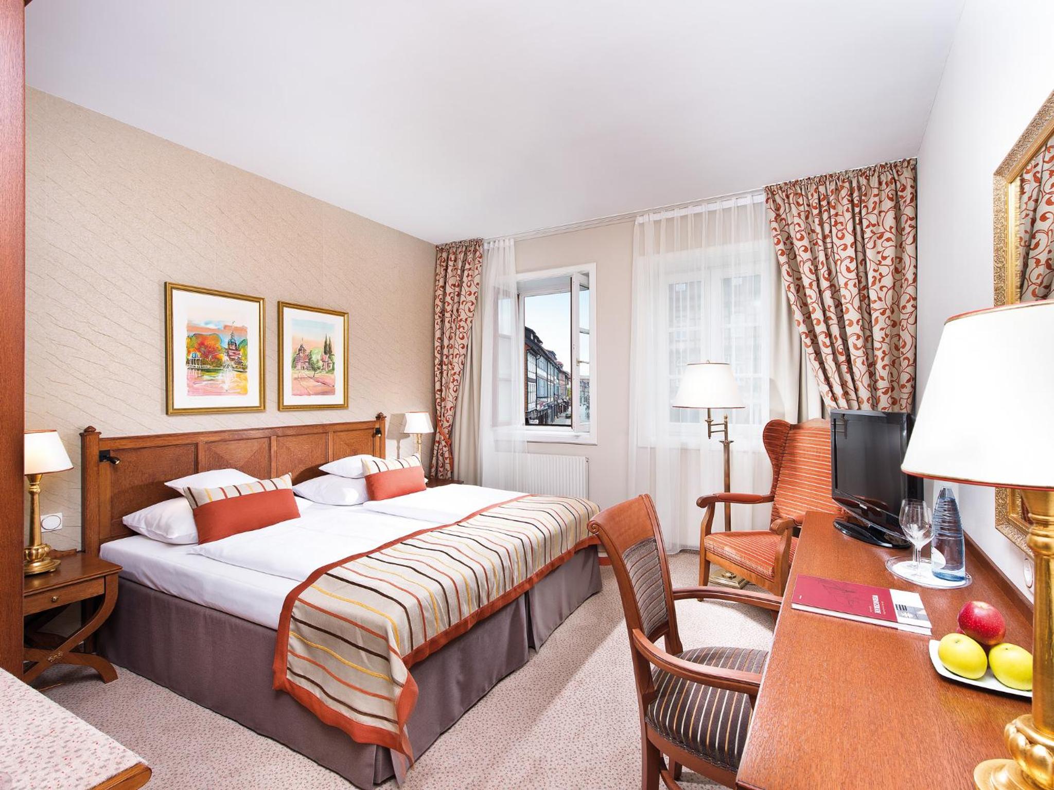 Sehr schönes Hotel direkt auf dem Marktplatz in Wenigerode. Tolles Früstück. Eine sehr schöne Bar für den Abend. Gute Parkmöglichkeiten. Sehr nettes Personal.