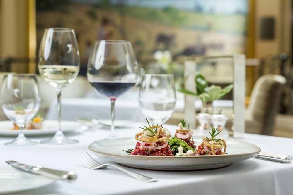 Restaurant and surrounding excellent Hotel a bit dated not great value