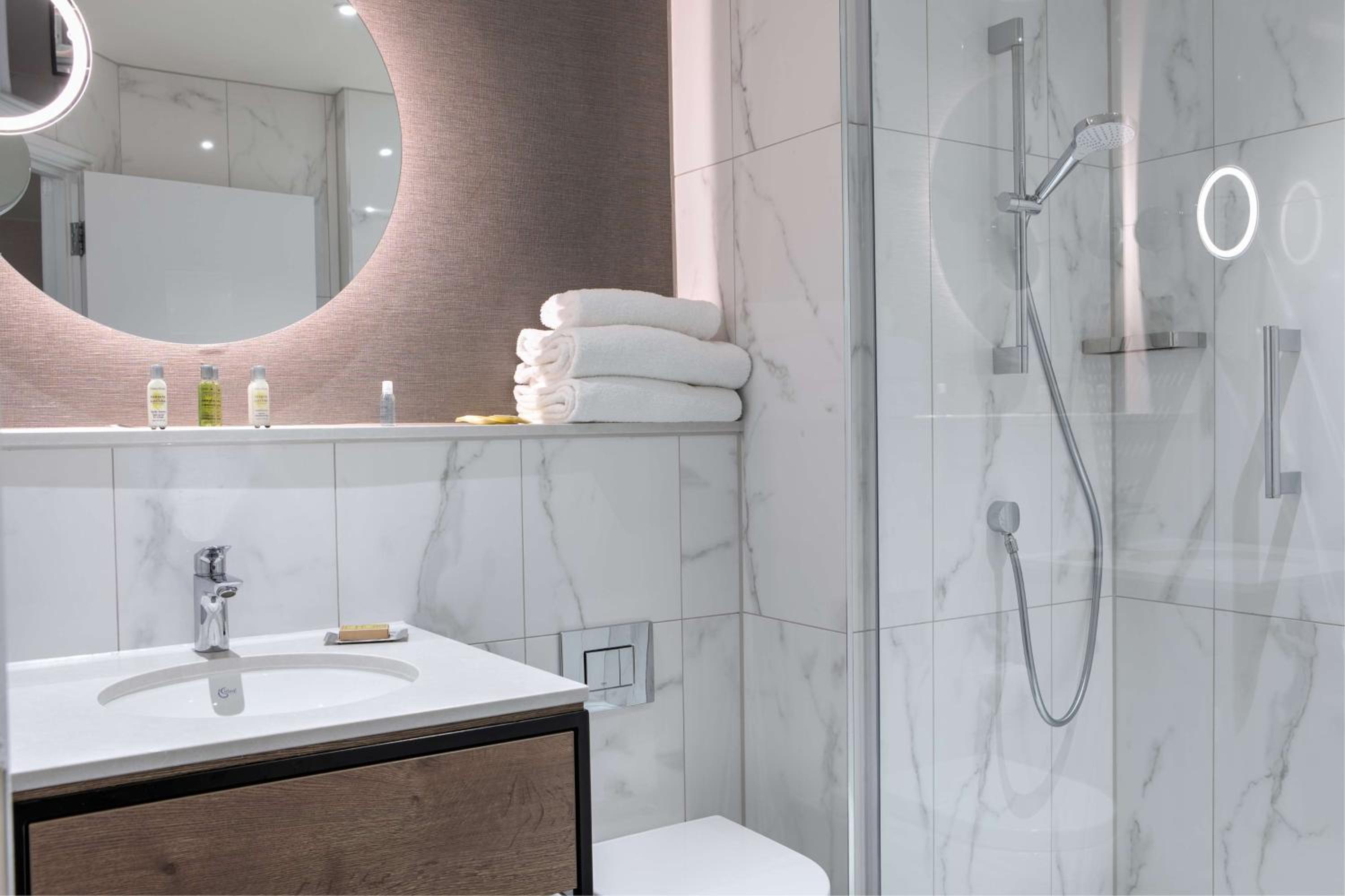 Each room at the hotel is equipped with modern conveniences such as power showers, flat-screen TVs, and complimentary toiletries, ensuring a comfortable stay for all guests.