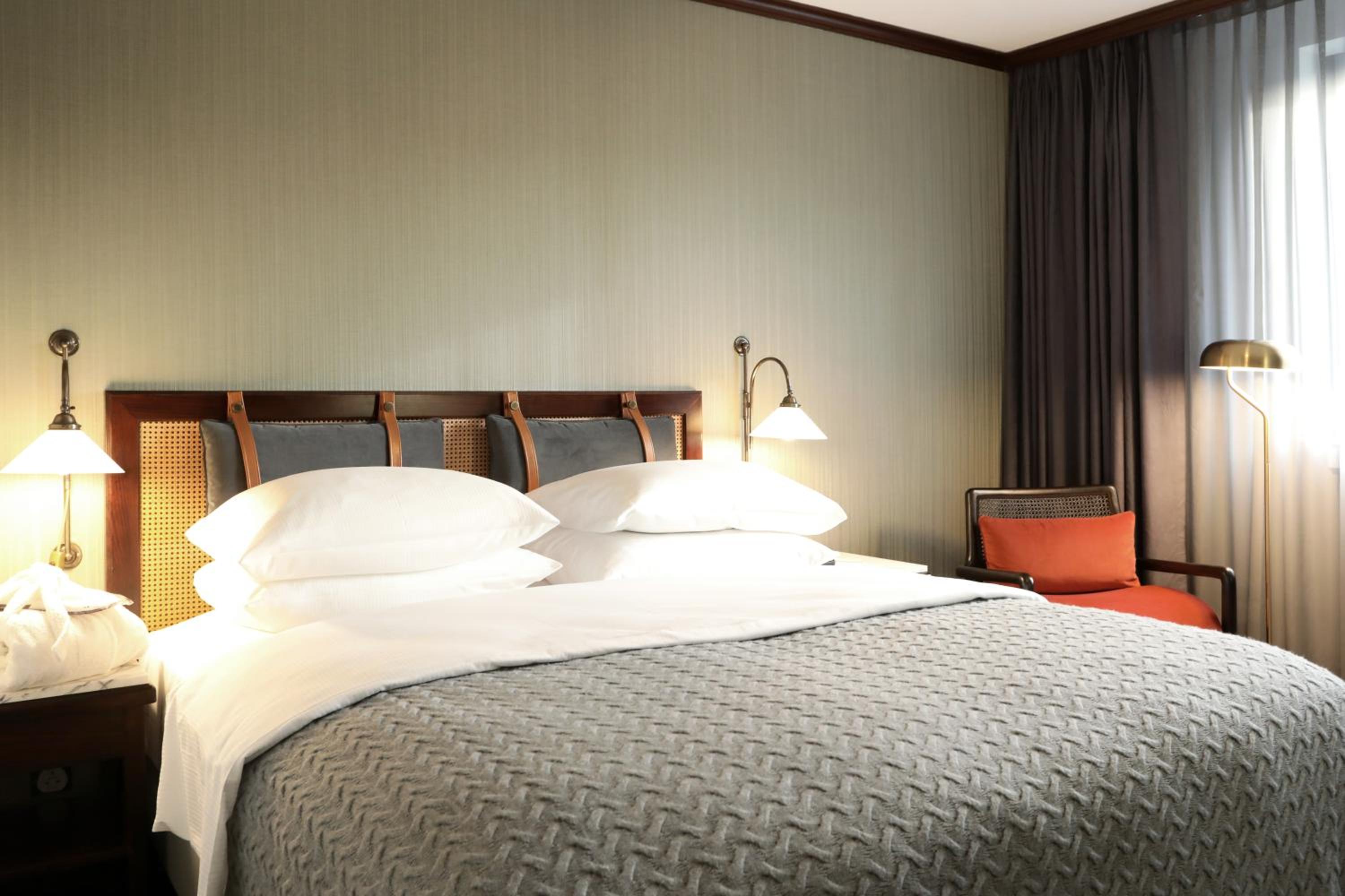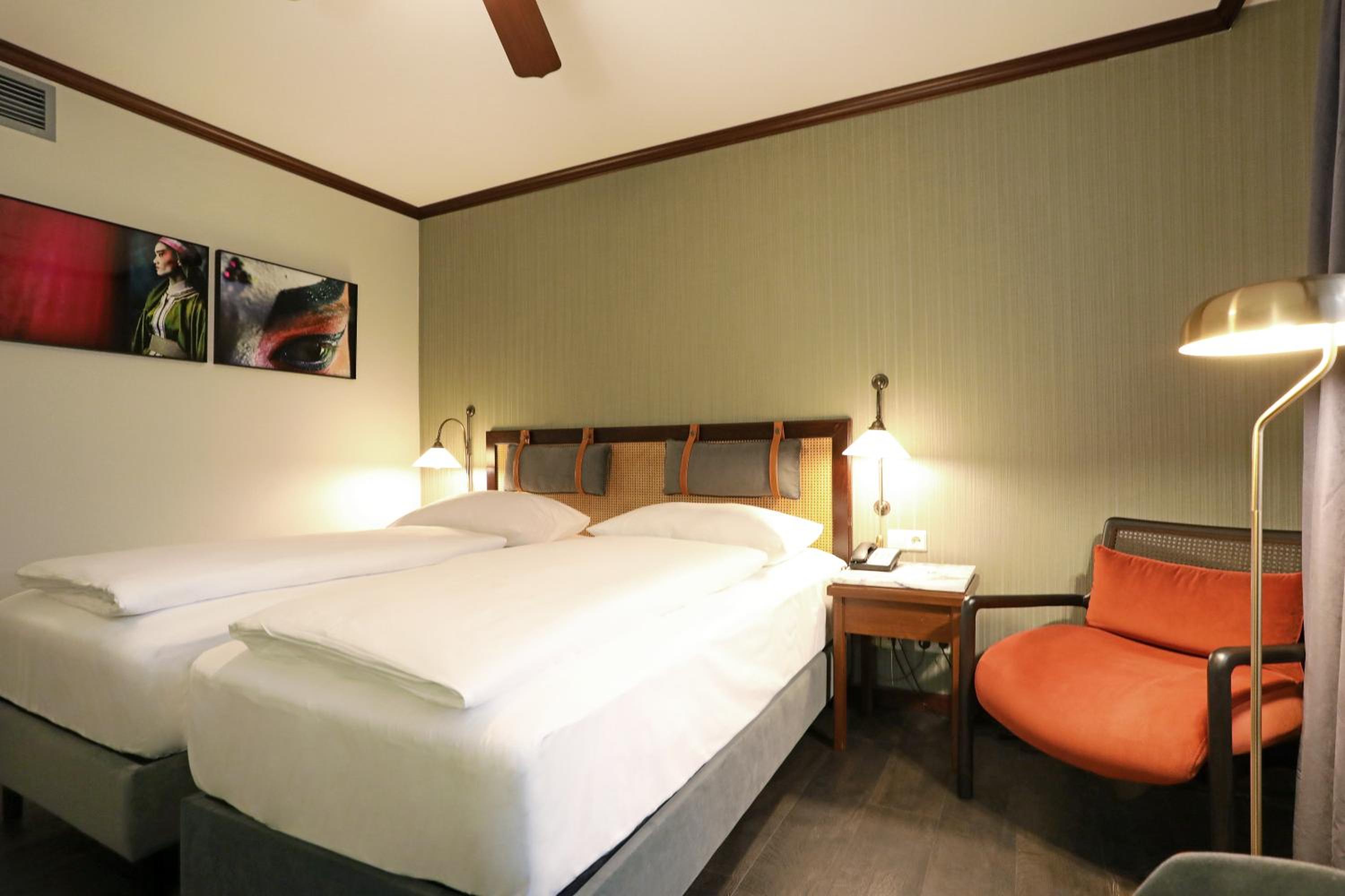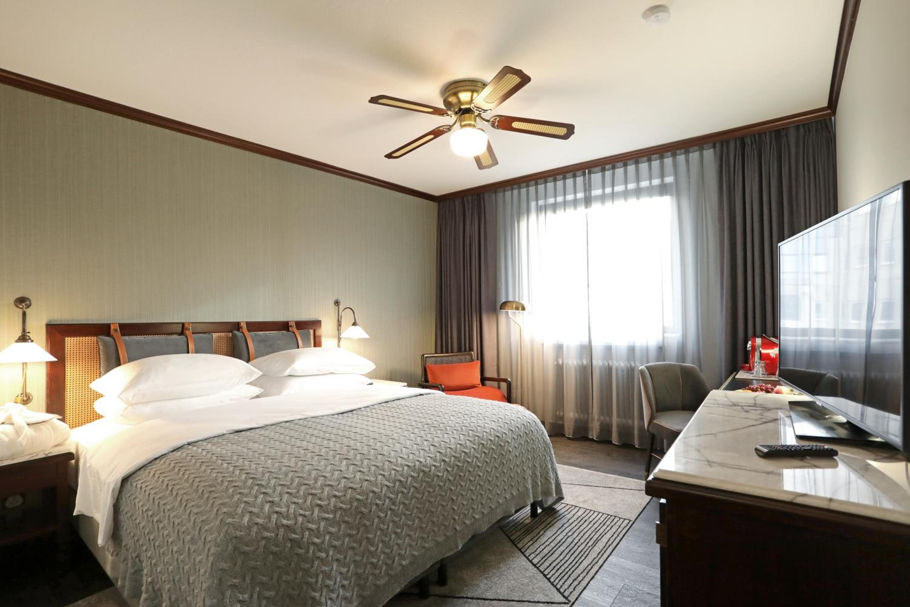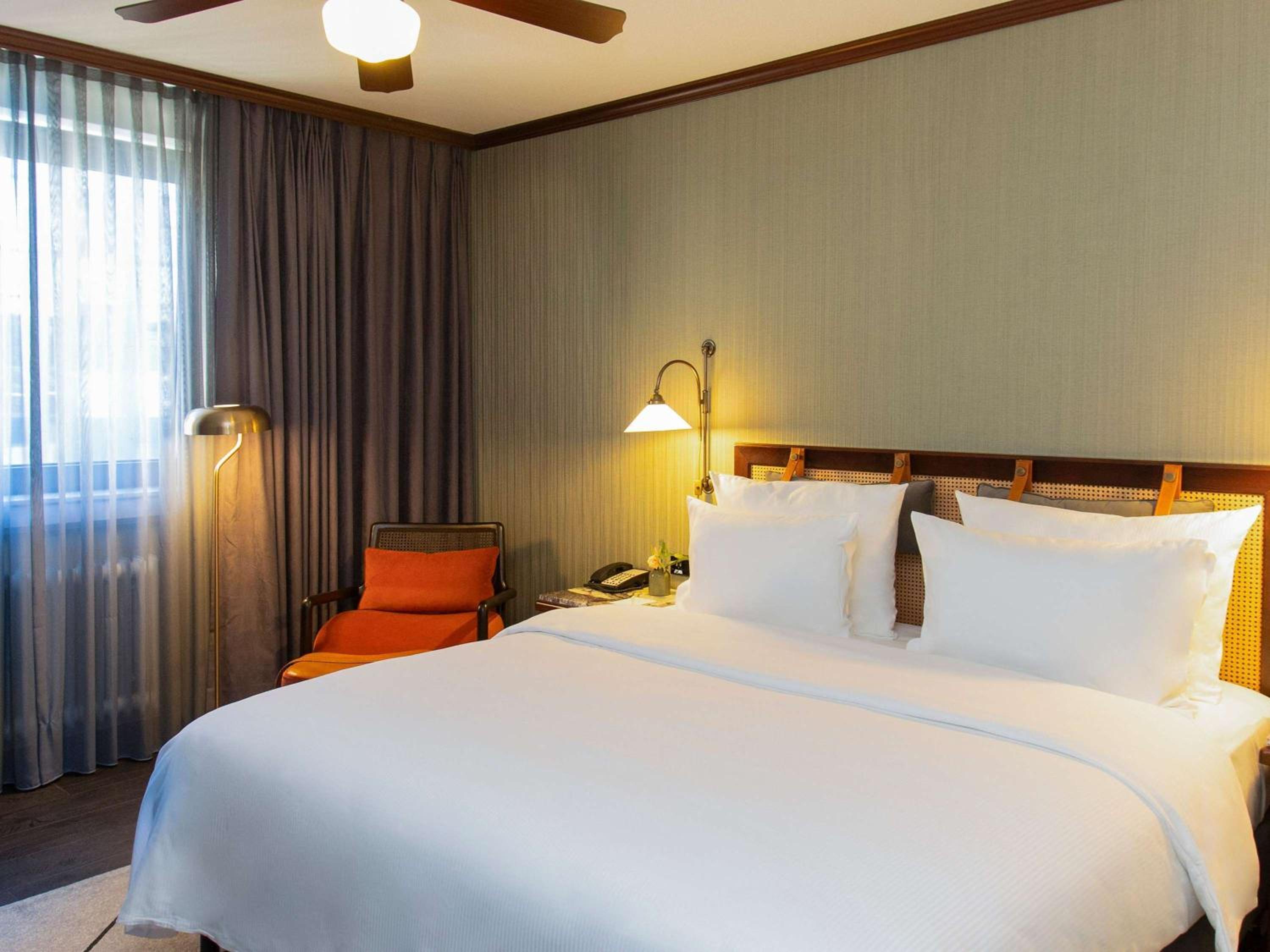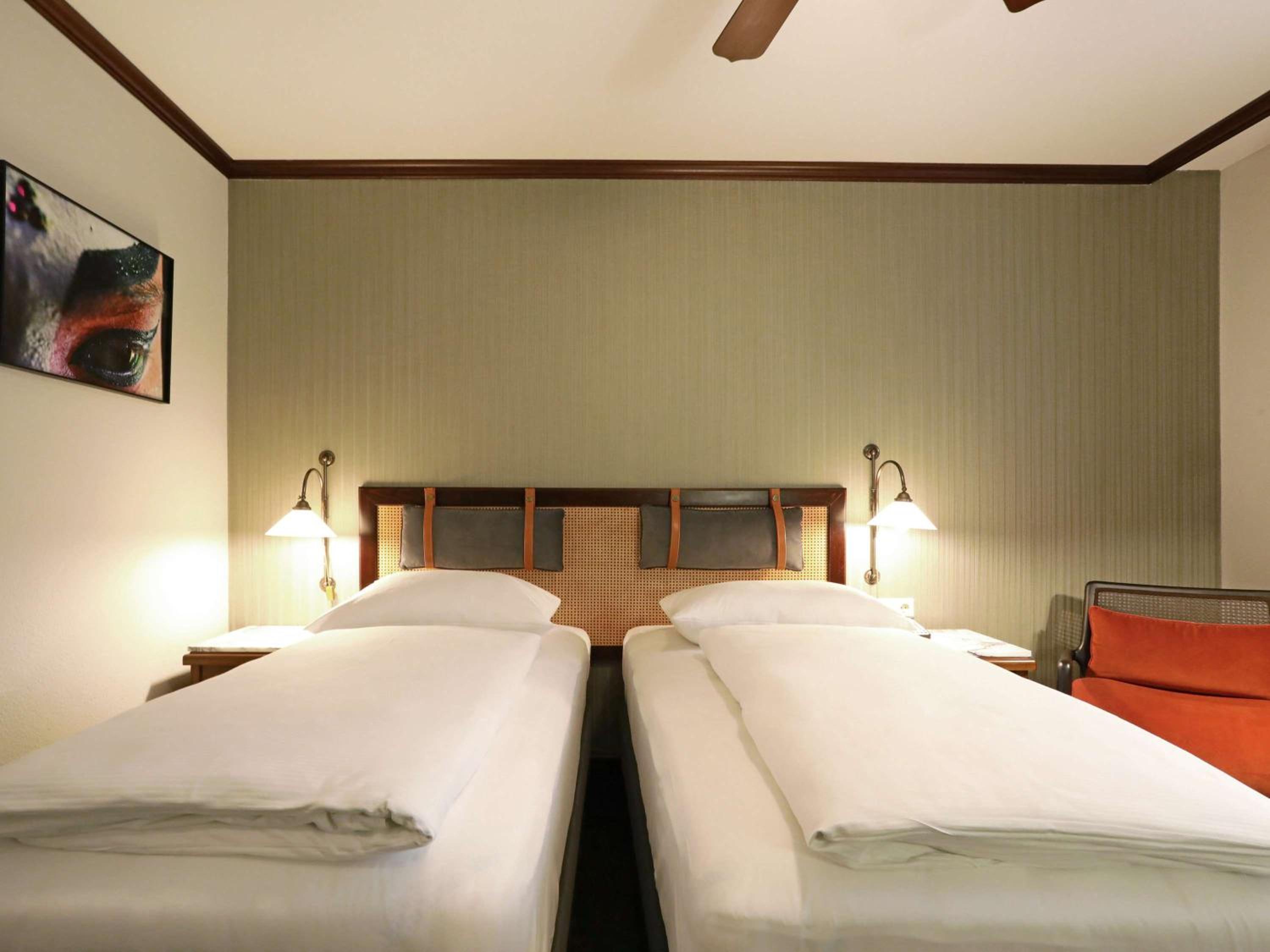 Soothing Rooms and Stylish Decor: The Mercure Hotel Frankfurt Airport Langen boasts stylish rooms decorated in calming earth tones, complete with unique features like a fan above the bed and a spacious writing desk.