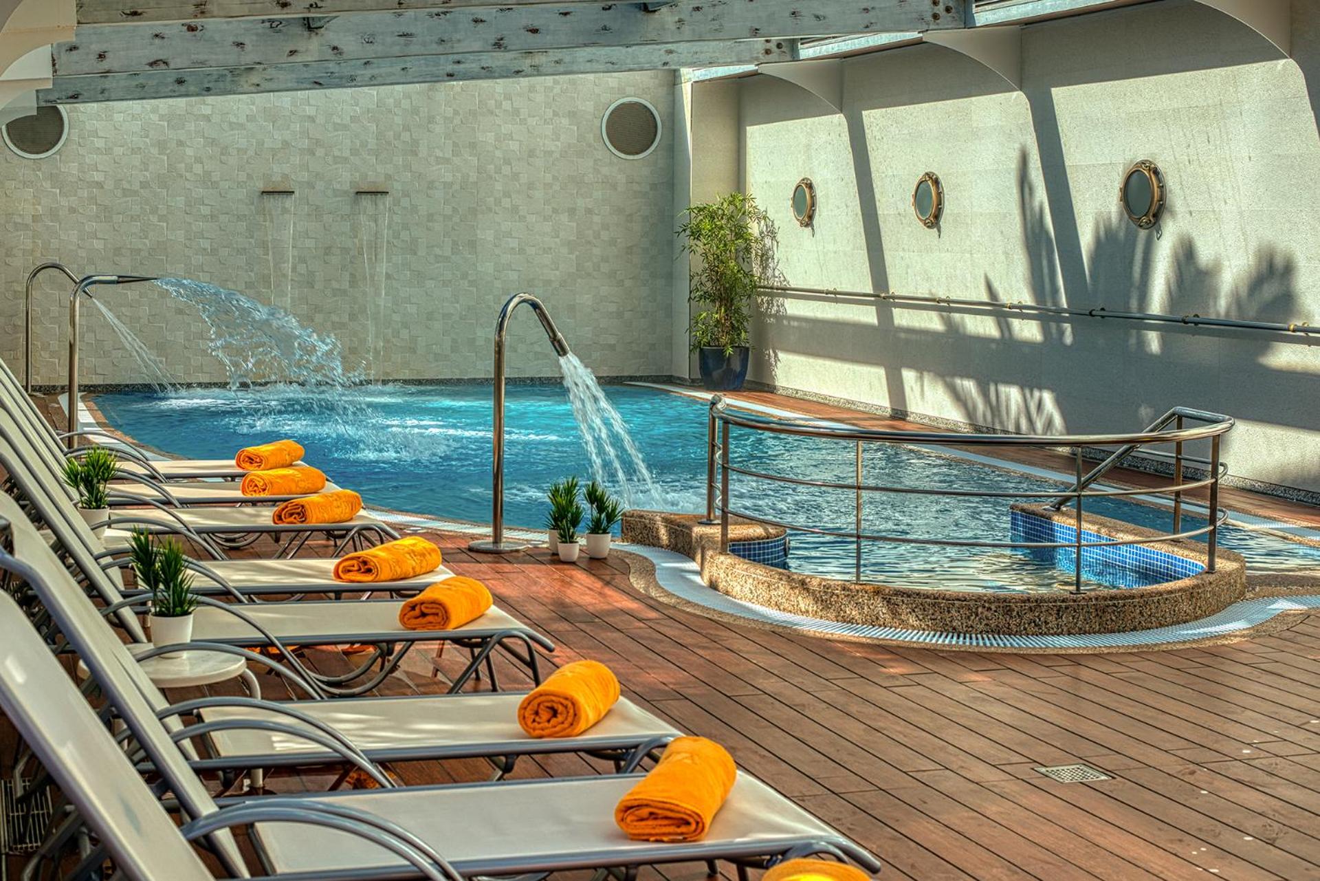 Indulge in relaxation at the well-equipped Thalassotherapy centre with stunning sea views, offering Turkish baths, sauna, water beds, and heated pools for a rejuvenating experience.
