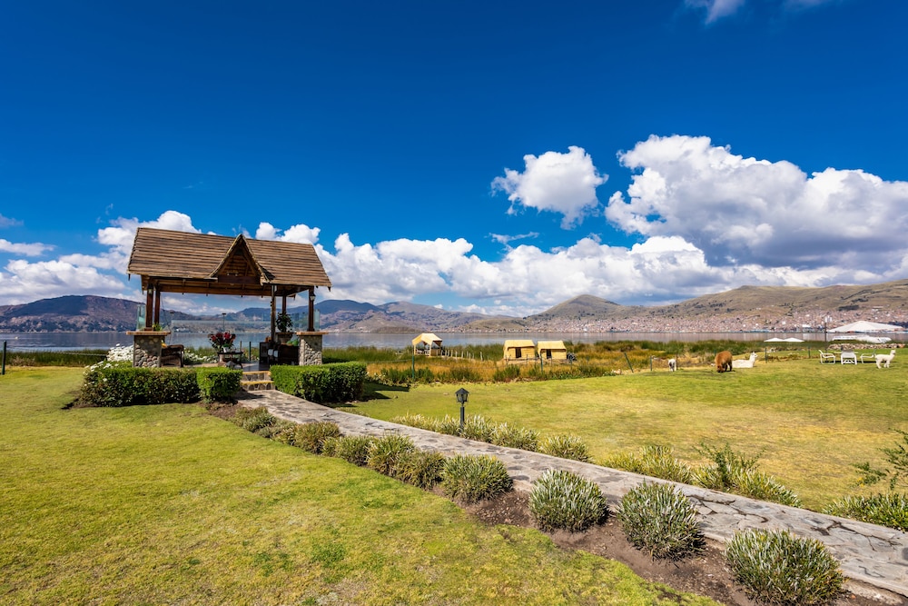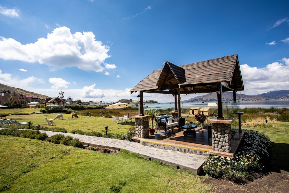 Peaceful hotel by Lake Titicaca with beautiful grounds with wild guinea pigs all over. The have gazebos for everyone to enjoy the view and setting.