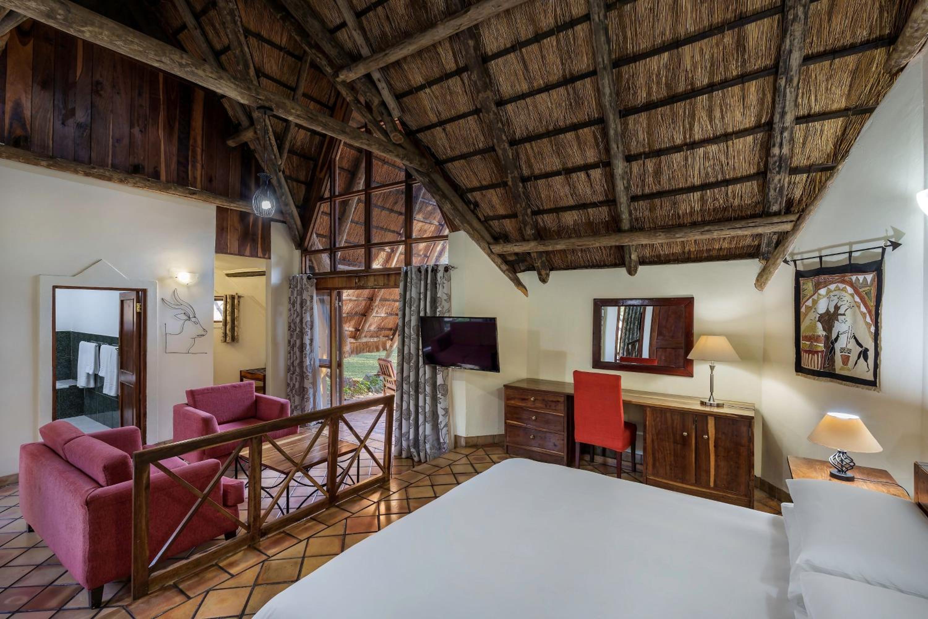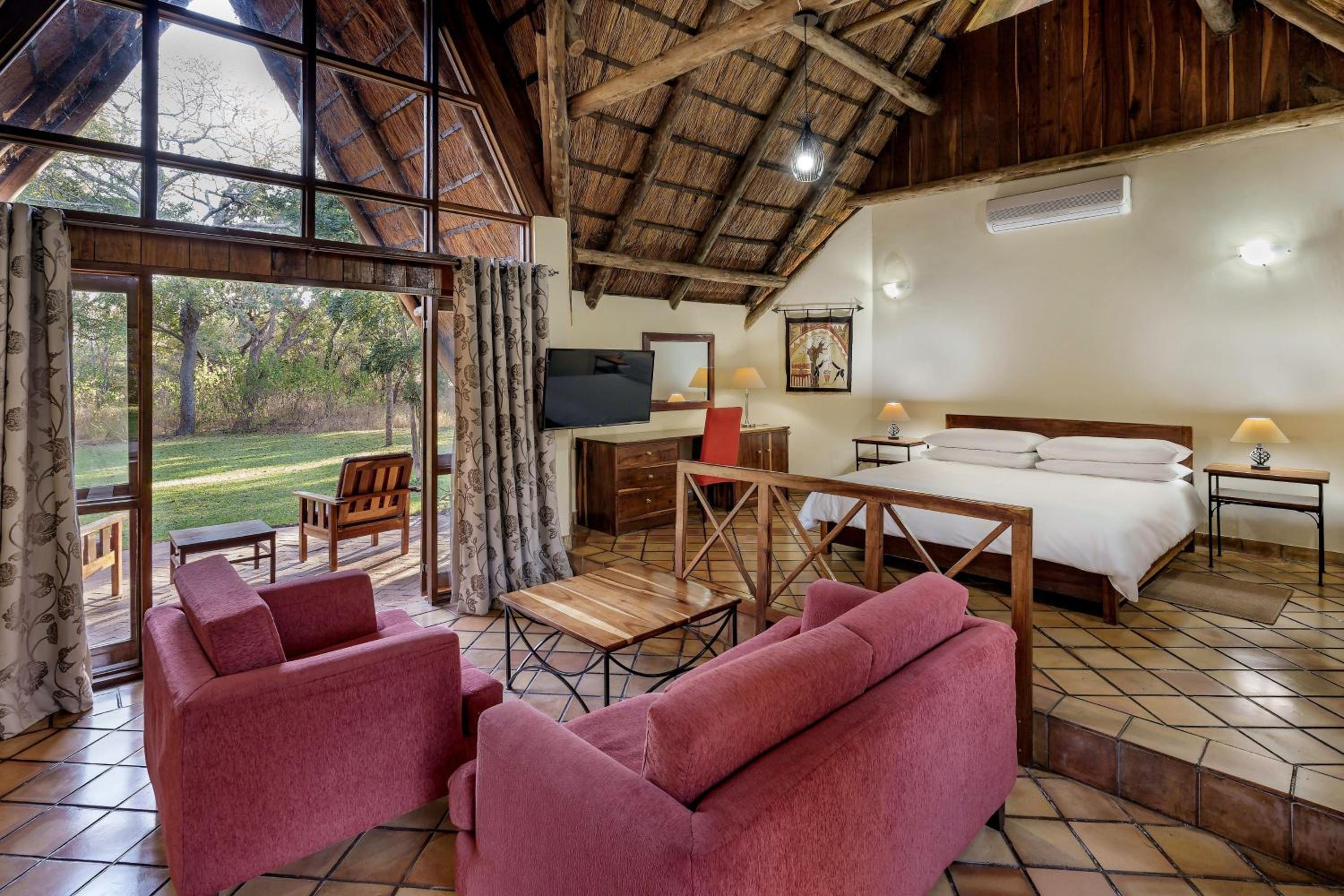 Experience the ultimate comfort in our air-conditioned rooms with private bathrooms and free Wi-Fi. Enjoy the stunning views of the lake or bush from your private patio, equipped with modern amenities like a fridge and flat-screen TV.