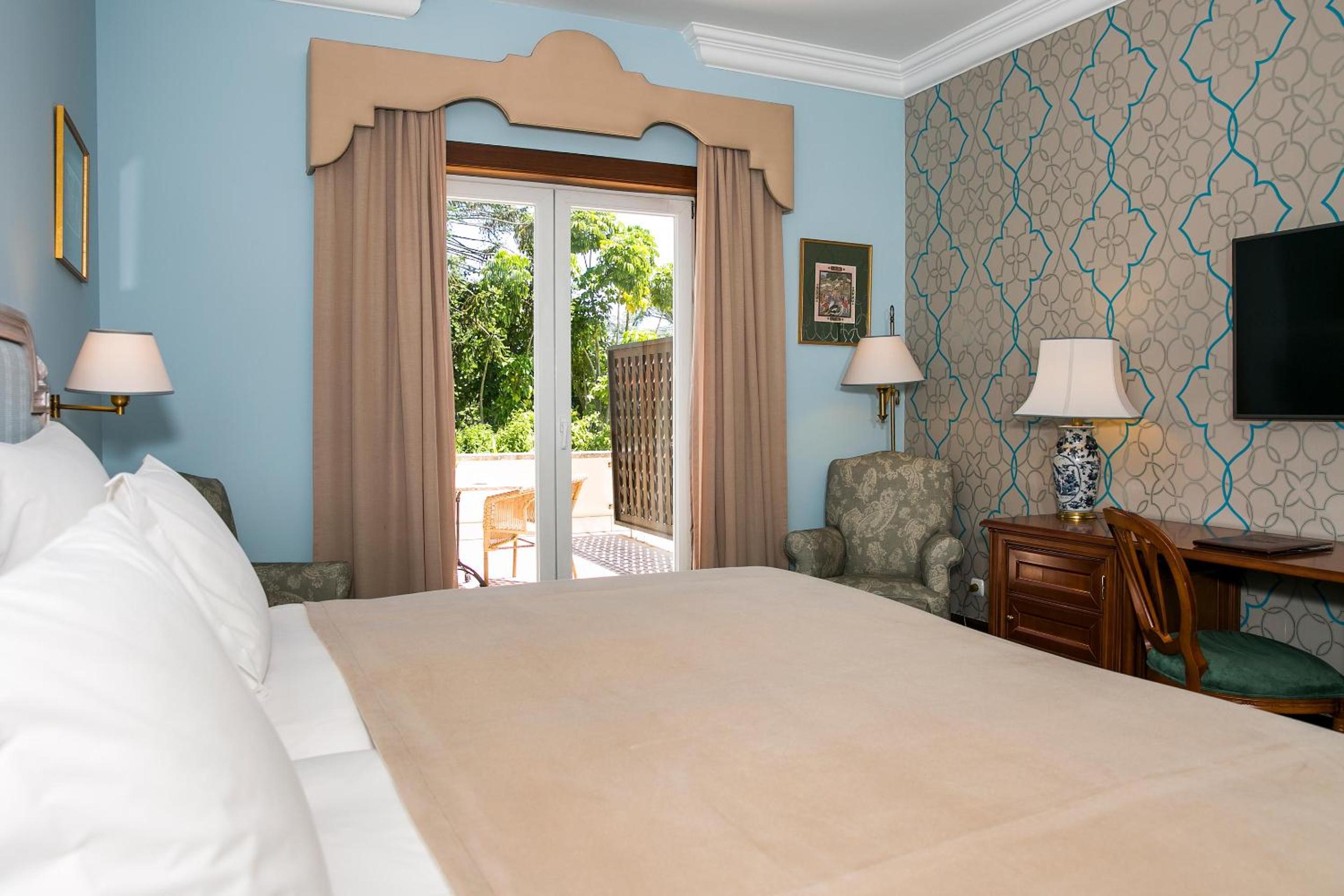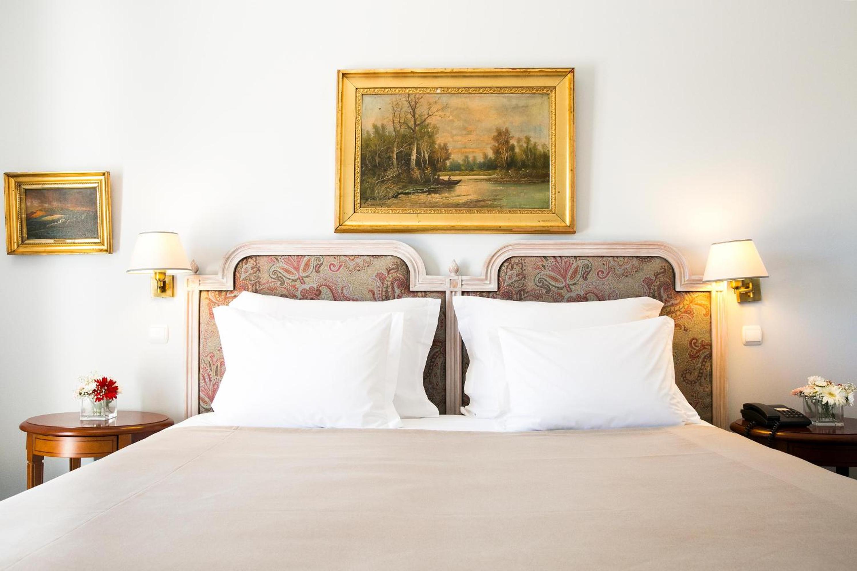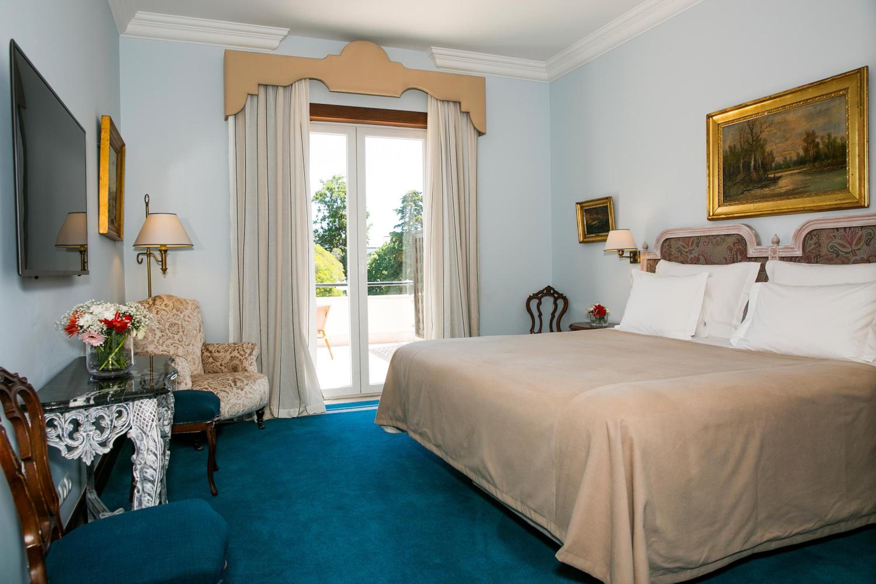 The 5-star Pestana Palace Hotel, a restored 19th-century palace, offers a unique experience with private parklands and stunning views of the Tagus River. Each elegantly furnished room provides a flat-screen TV, minibar, and some boast a balcony overlooking the lush gardens.