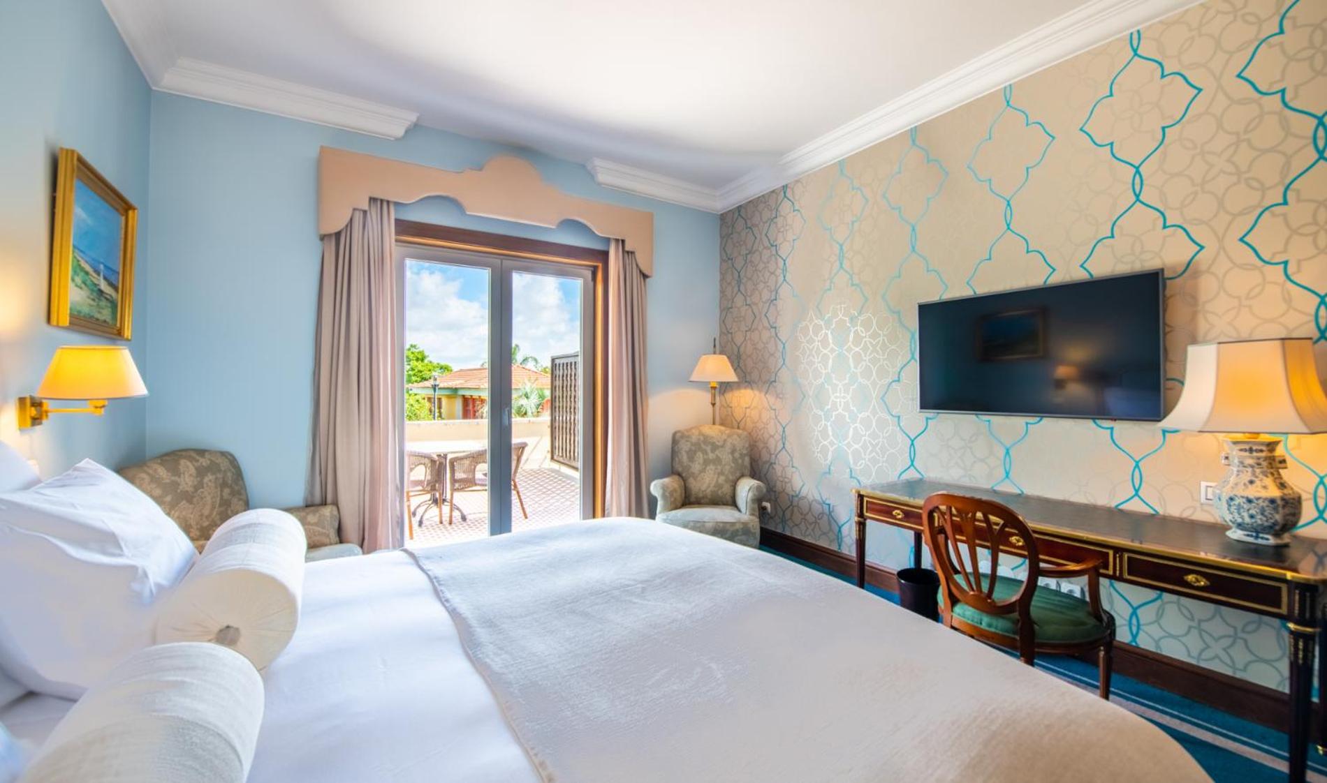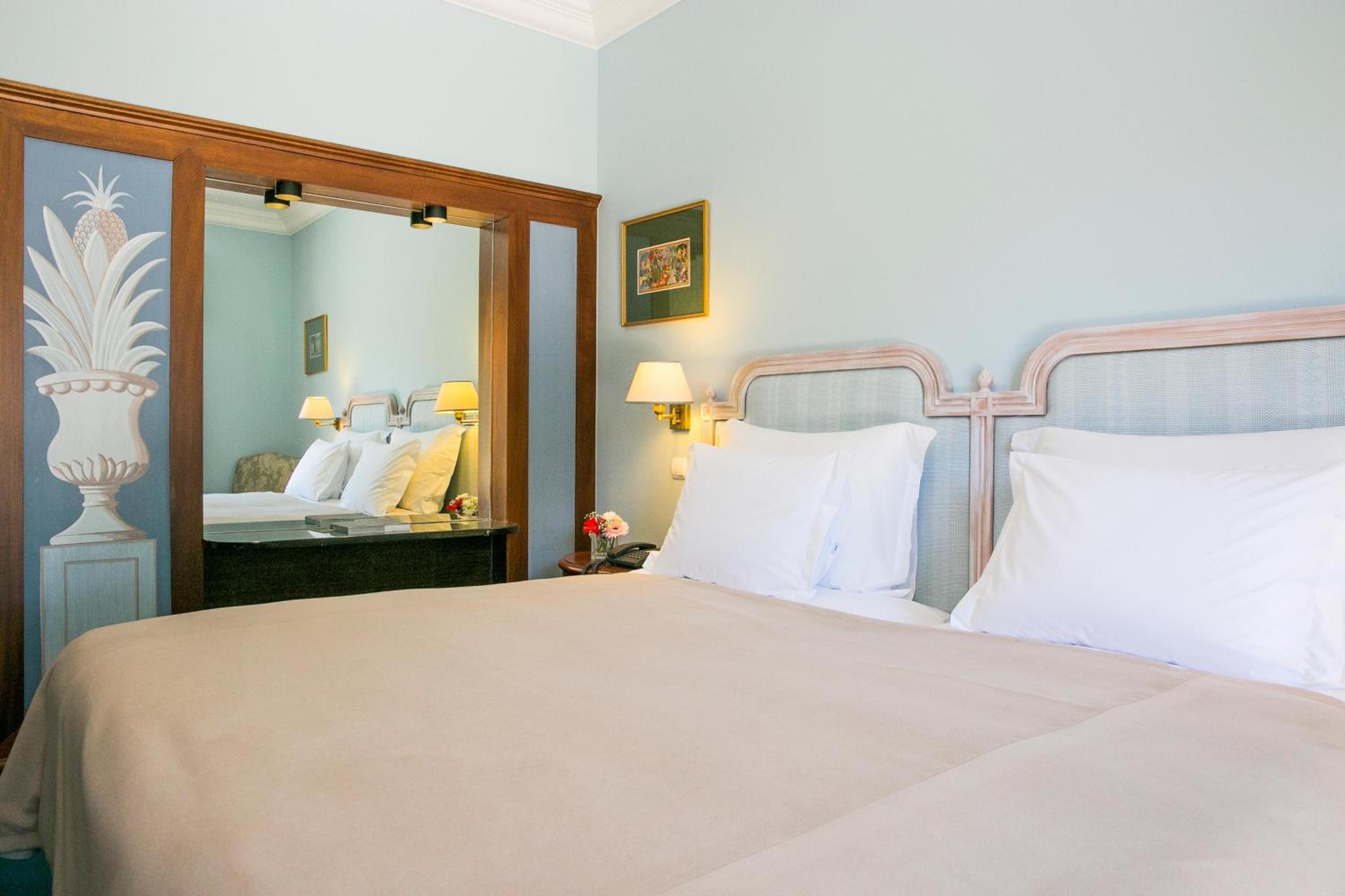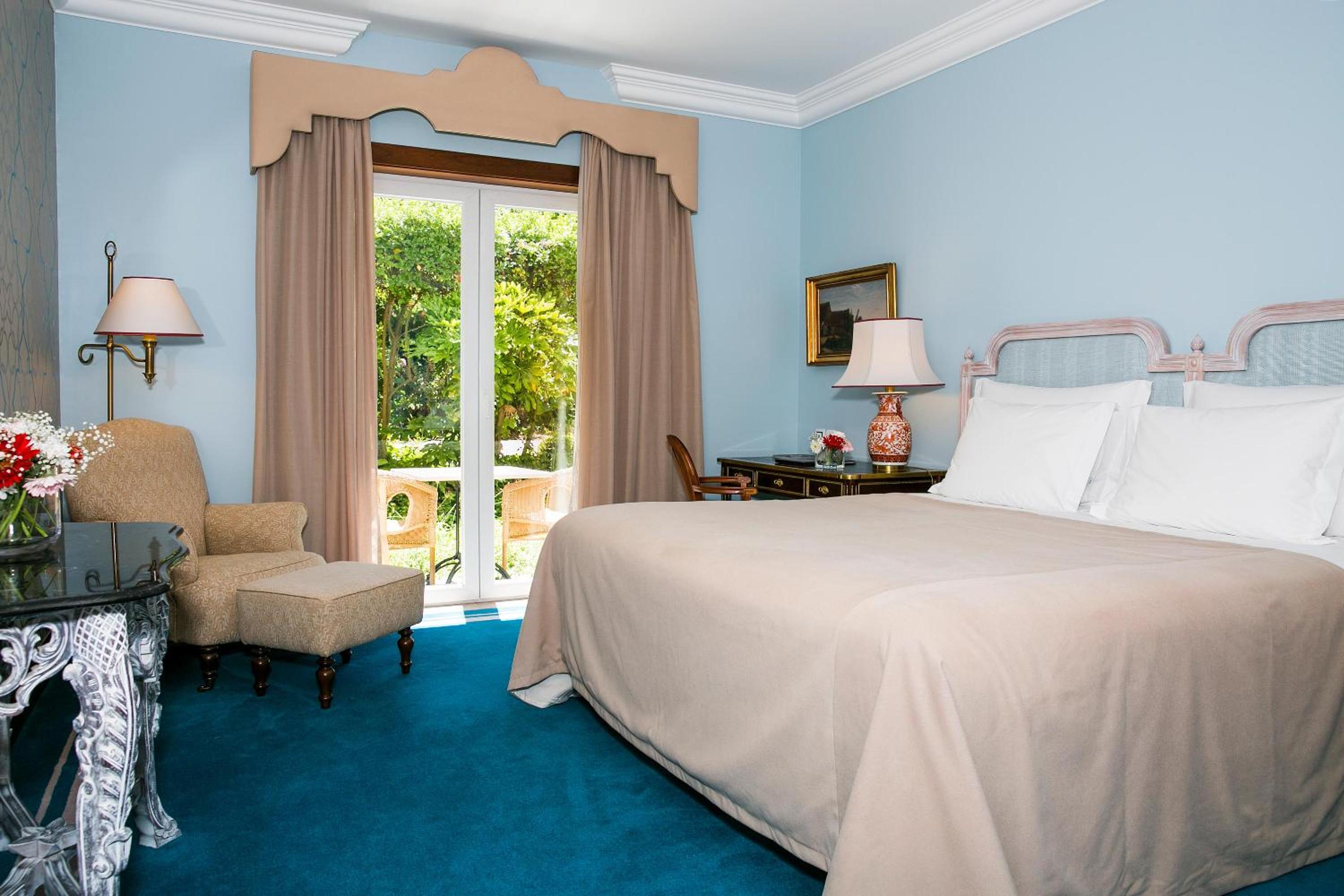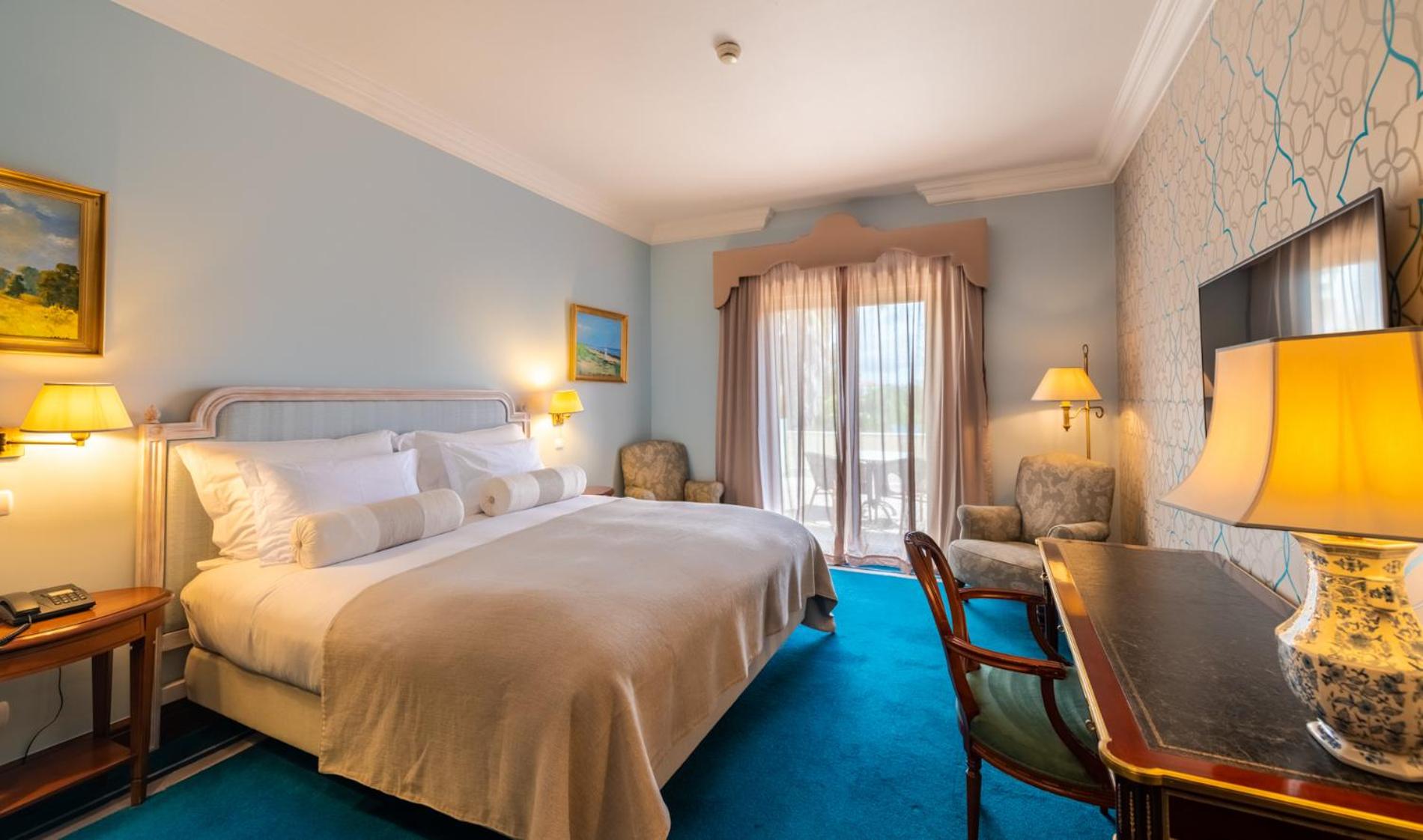 The 5-star Pestana Palace Hotel, a restored 19th-century palace, offers a unique experience with private parklands and stunning views of the Tagus River. Each elegantly furnished room provides a flat-screen TV, minibar, and some boast a balcony overlooking the lush gardens.