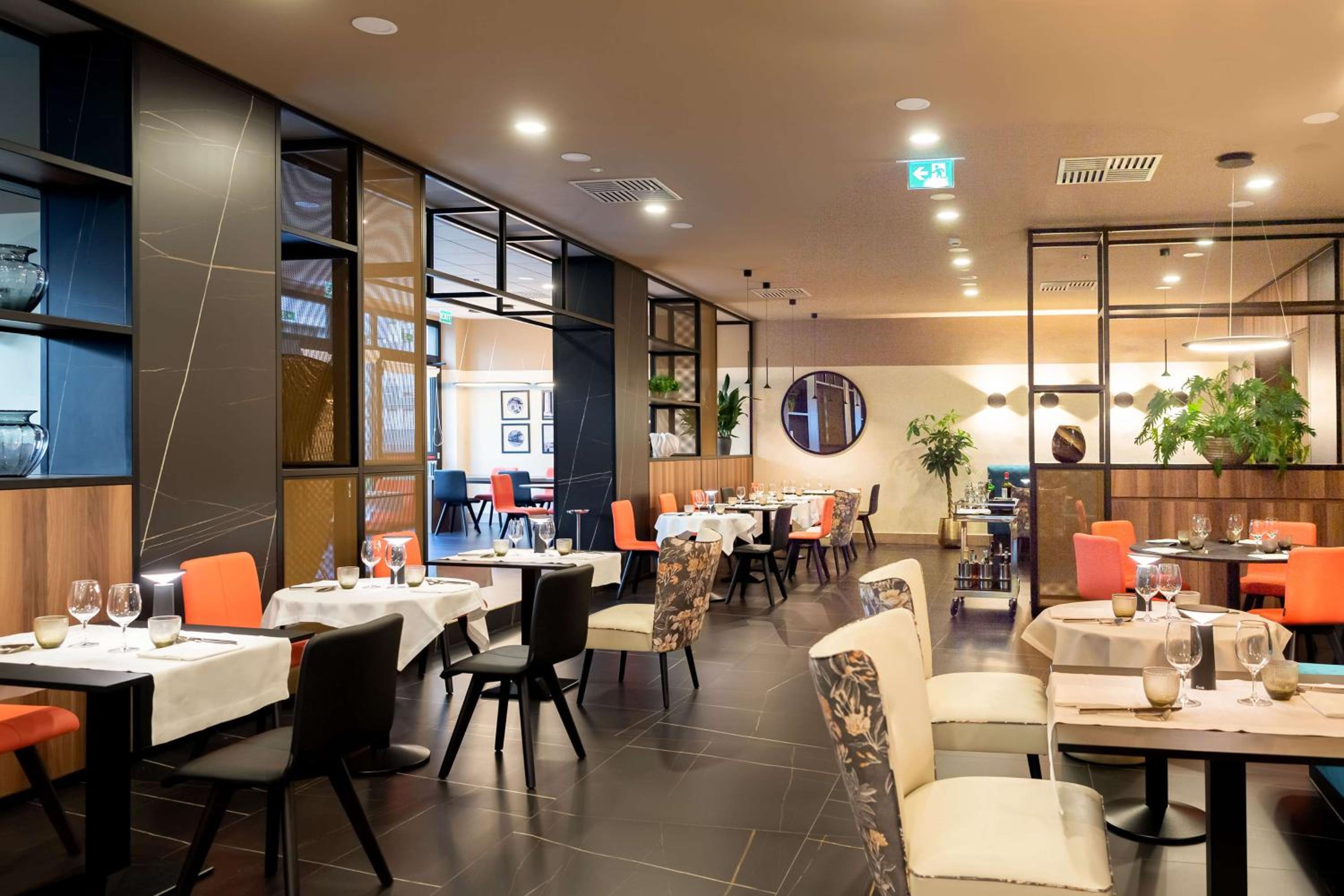 dekorasyonunu resteurant kısmı turuncu basit sandalyeler renkler hiltona yakişmiyor