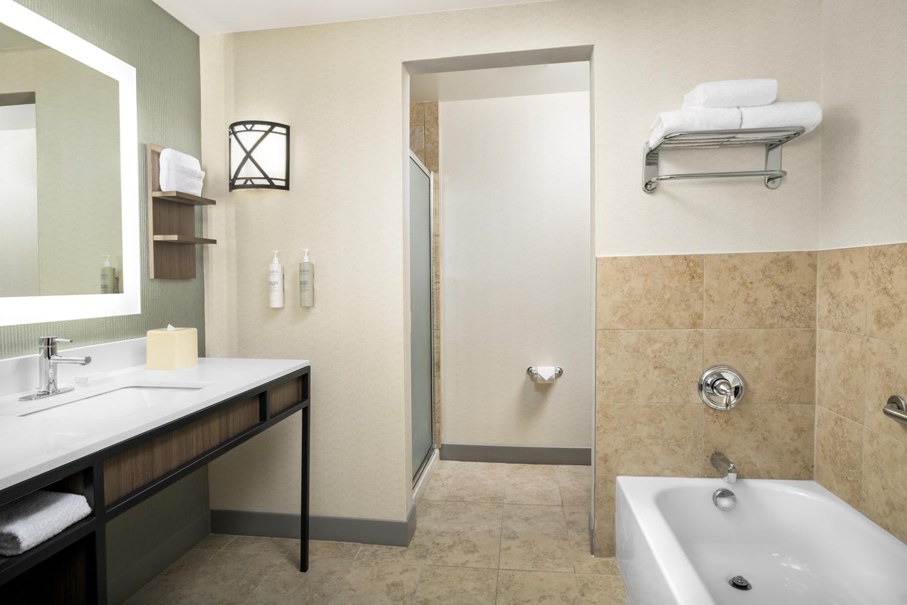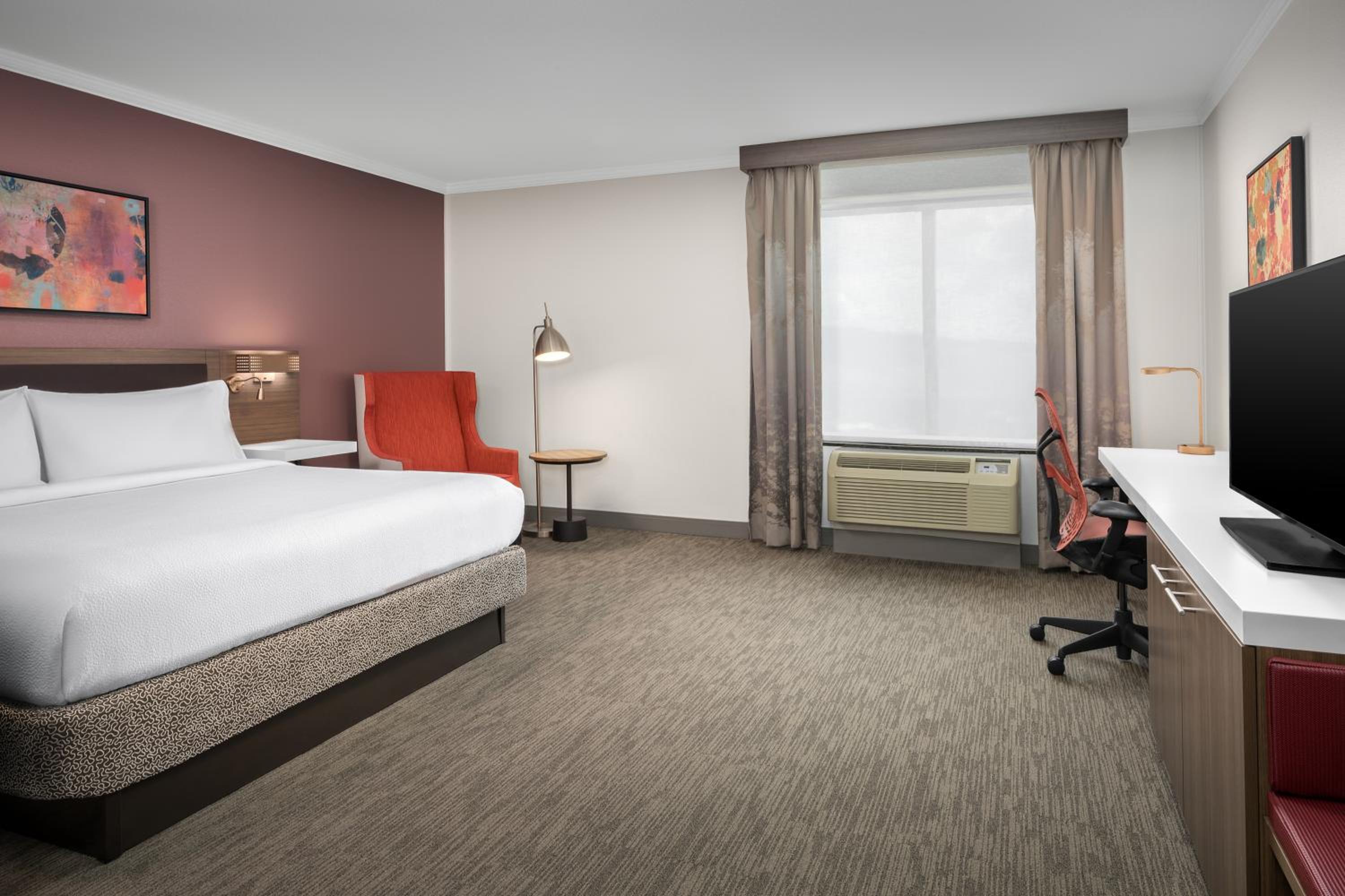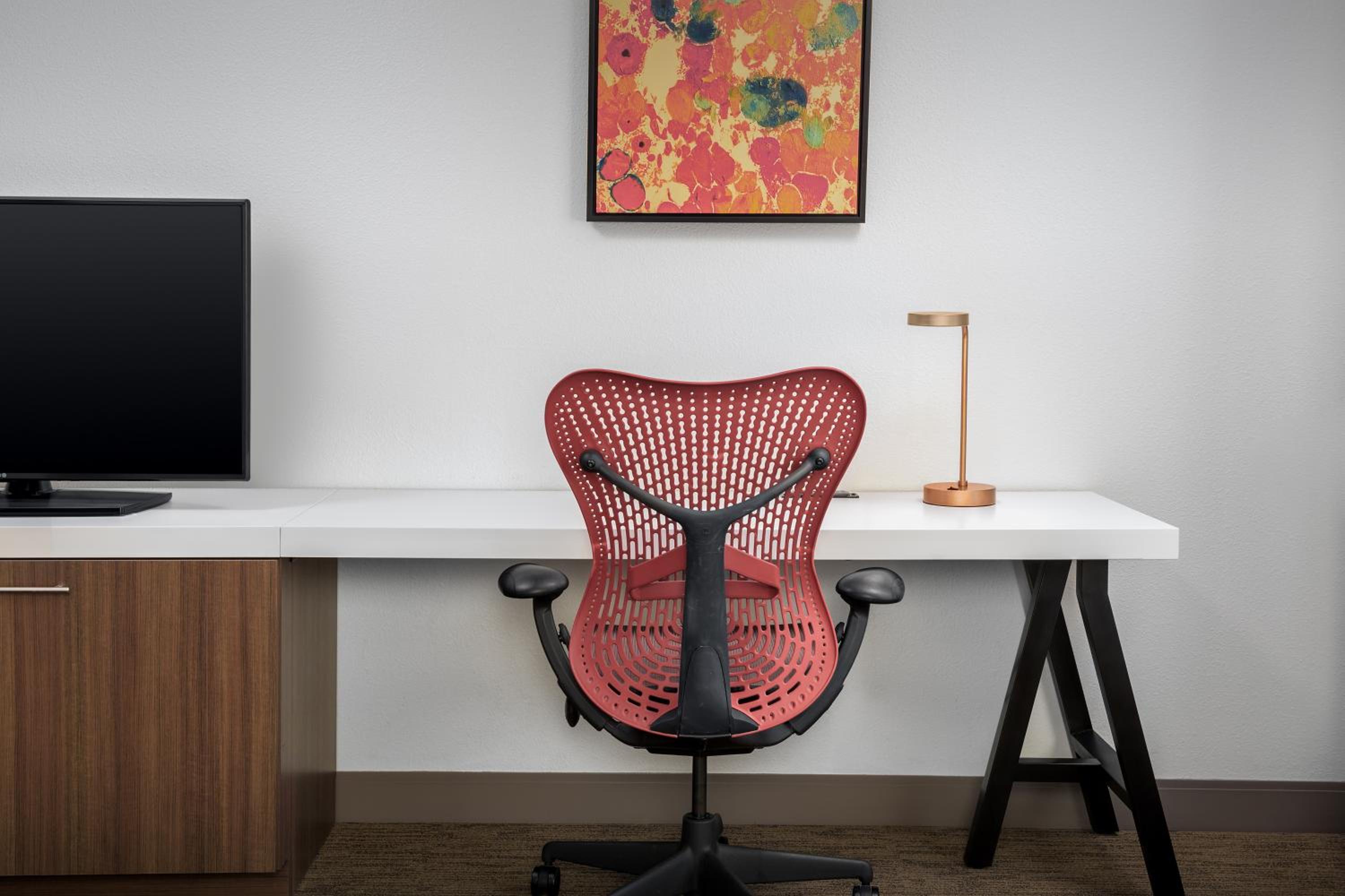 The bright rooms feature spacious work areas, ergonomic chairs, and flat-screen TVs, ensuring a comfortable stay. Guests can also enjoy complimentary Starbucks® coffee in their rooms.