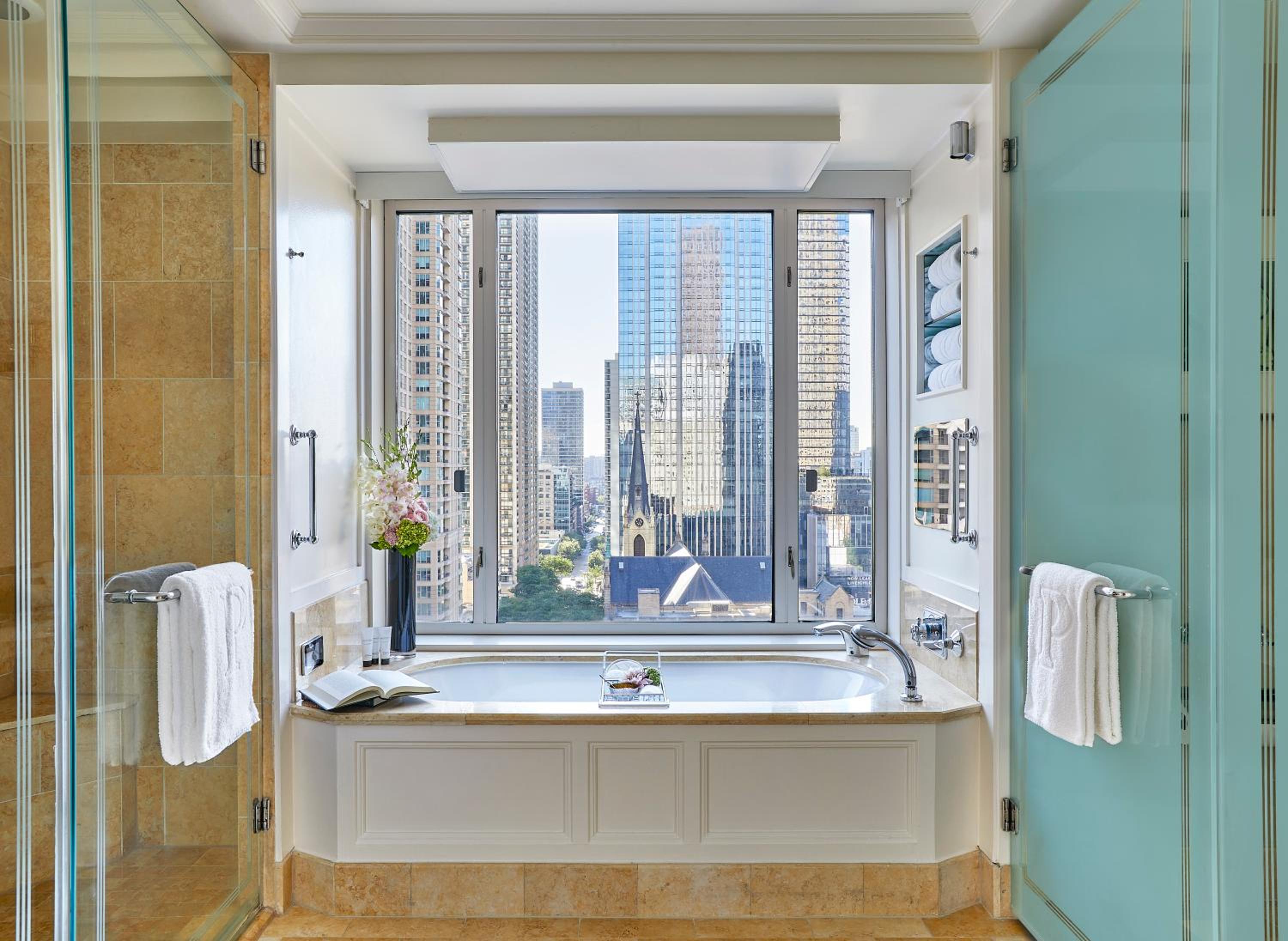 Indulge in spacious luxury guest rooms at the Chicago Peninsula, each offering breathtaking city views. Enjoy modern amenities like a 42-inch flat-screen TV, free WiFi, and a soaking tub in the en suite bathroom for the ultimate relaxation.