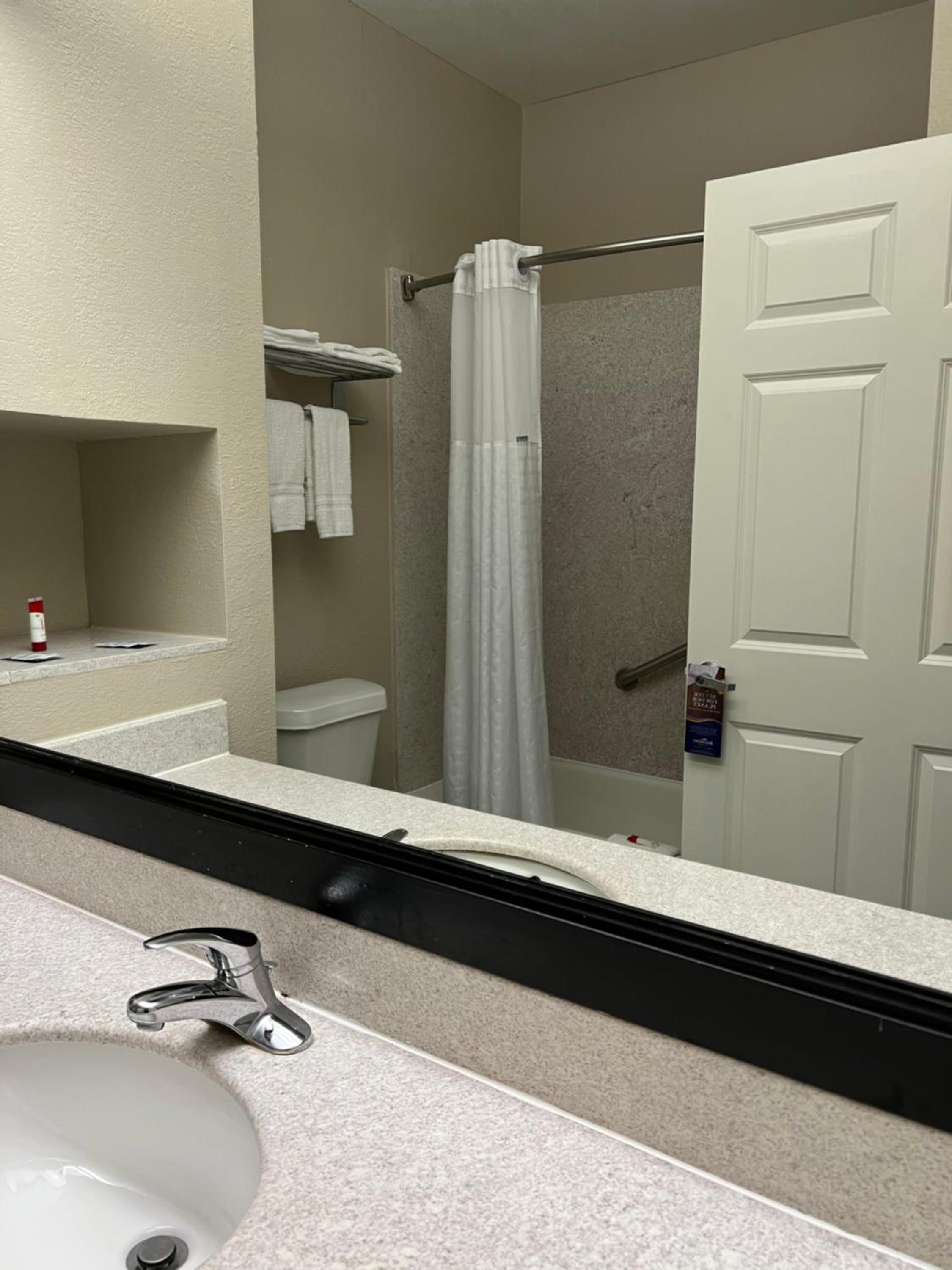 Elevator was broken. Given an accessible room on the first floor which would have been fine but the tub didn’t drain. Second room was ok, but the clerk said “there are no other rooms available” and then she came up with one. Parking lot was empty. Rear door from the parking lot did not respond to my key. Breakfast was pitiful—but I didn’t expect much.