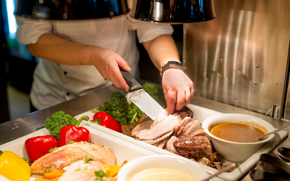 På hotellet er det kun full middagsbuffet å få, så man må evt kjøre litt for å spise annen middag eller handle noe.