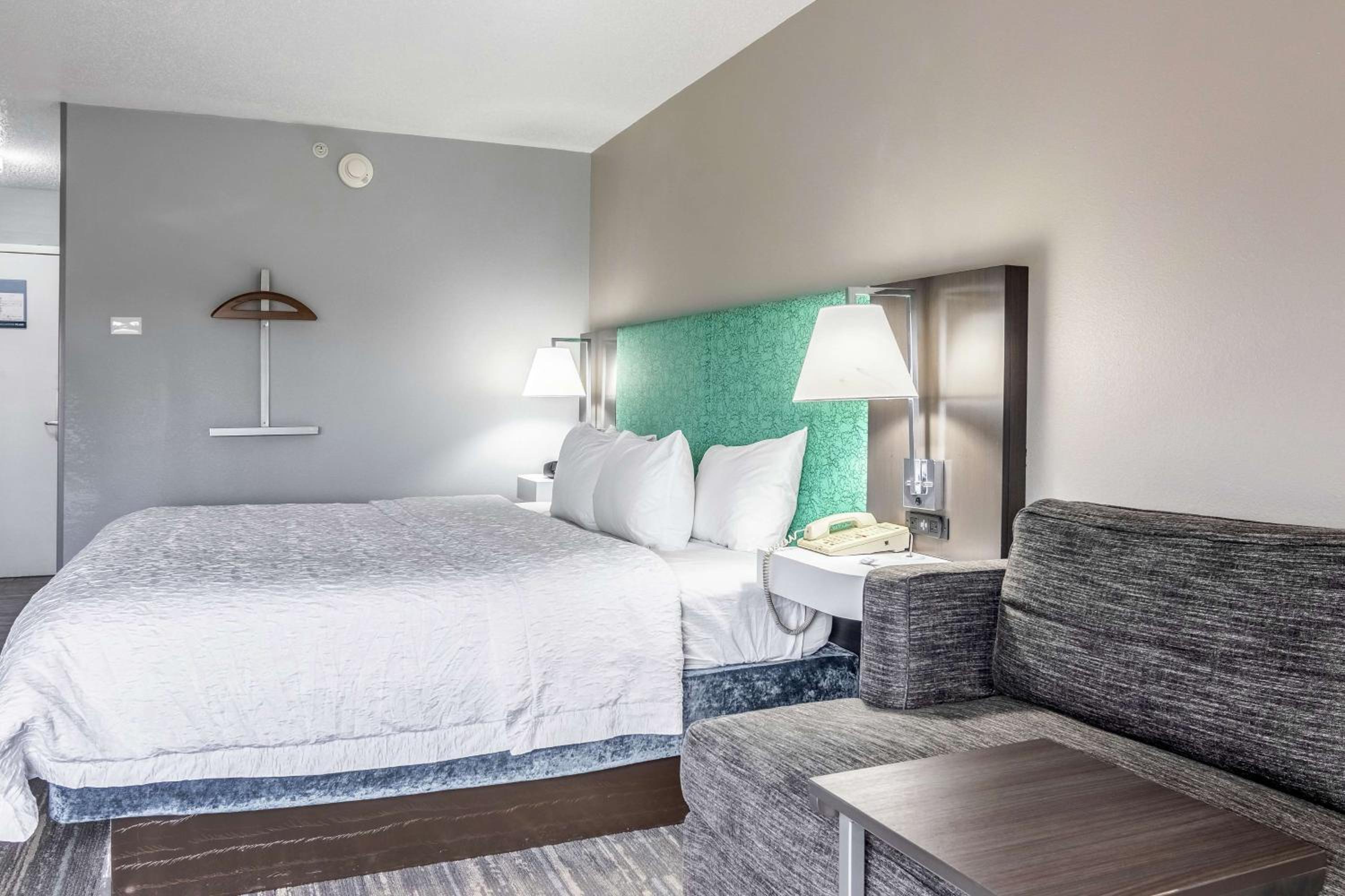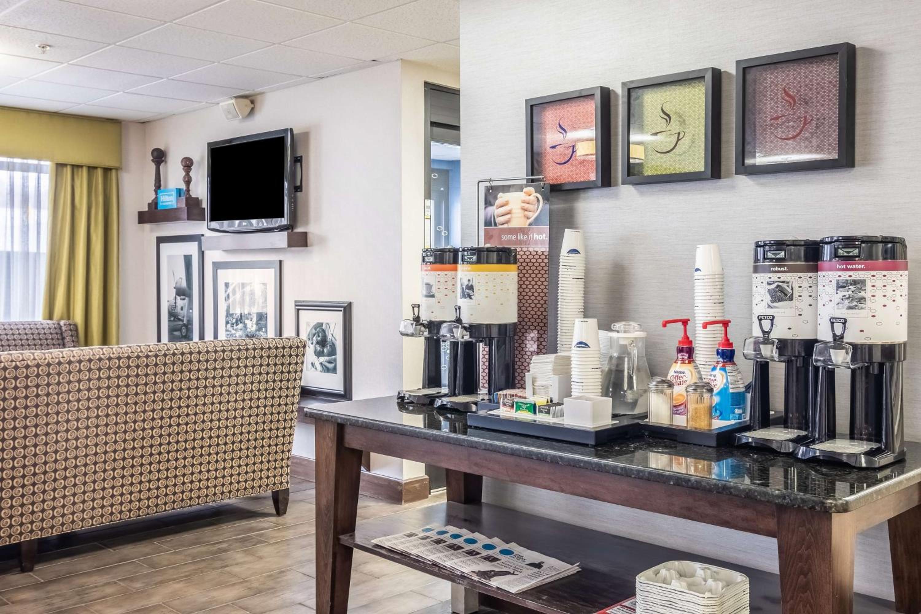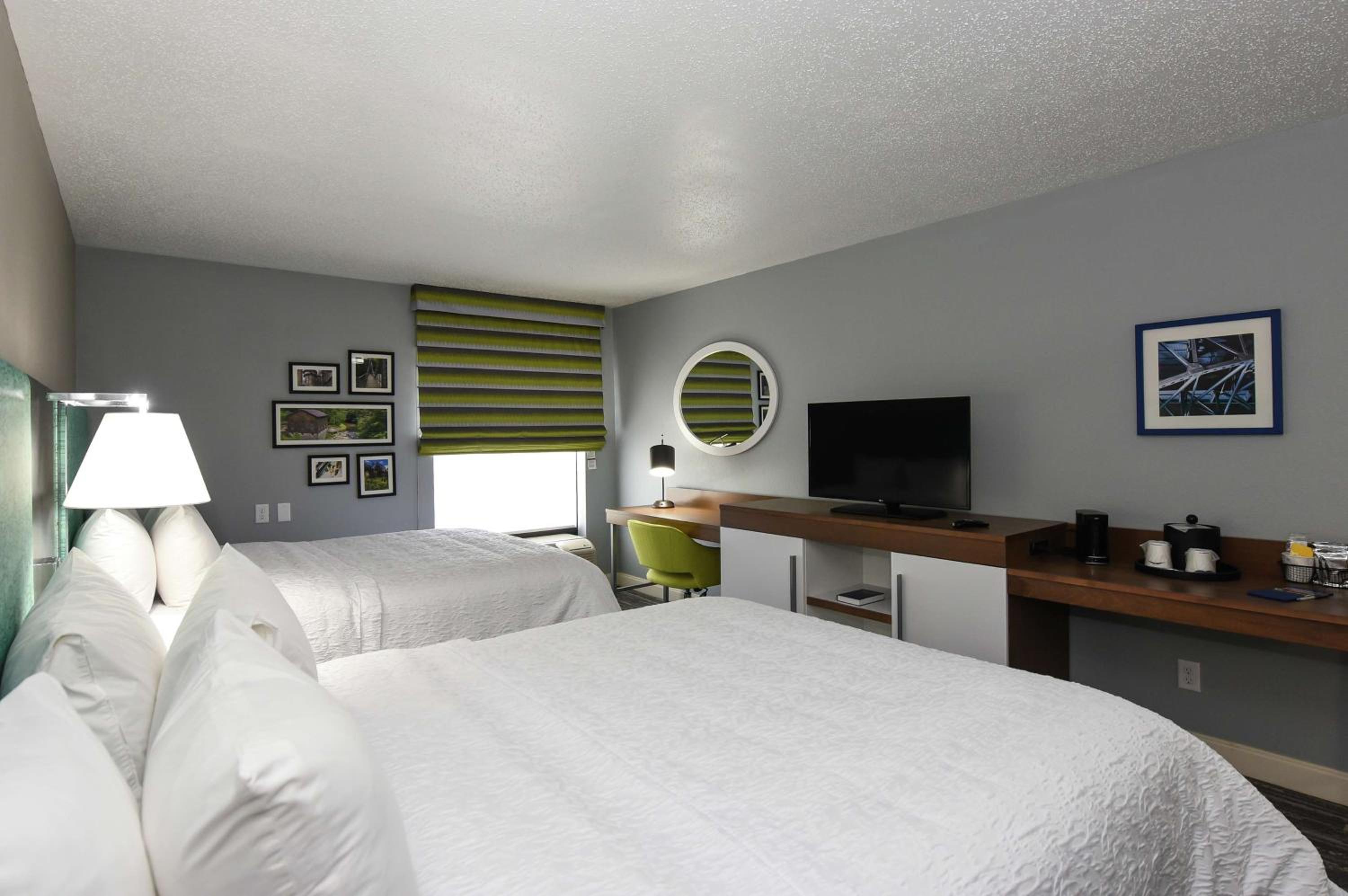 Each room at the Hampton Inn Youngstown-North is equipped with modern amenities like free Wi-Fi, a 25-inch TV, and a coffee maker. The bathrooms are designed for convenience with WaterPik shower heads and extra space from curved shower rods.