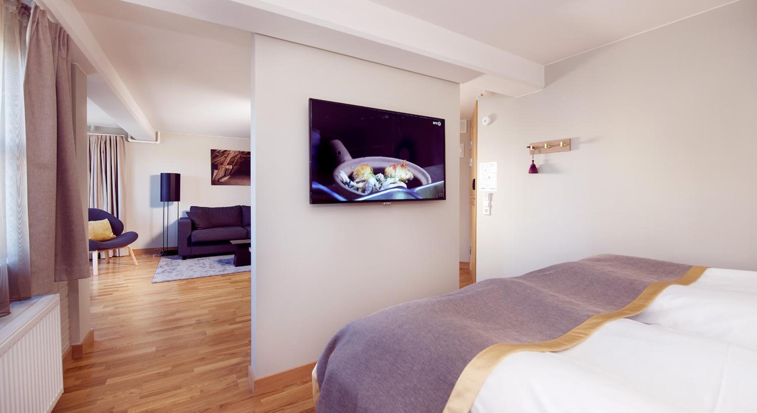Ich hatte ein Deluxe Zimmer gebucht. Es war im Nebengebäude. Leider ging die Aussicht in den Hinterhof. Fenster sowieso klein. Tv hatte ausschließlich norwegische Programme. War auch in anderen Hotels so. Schade. Kann ja kein technisches Problem sein.